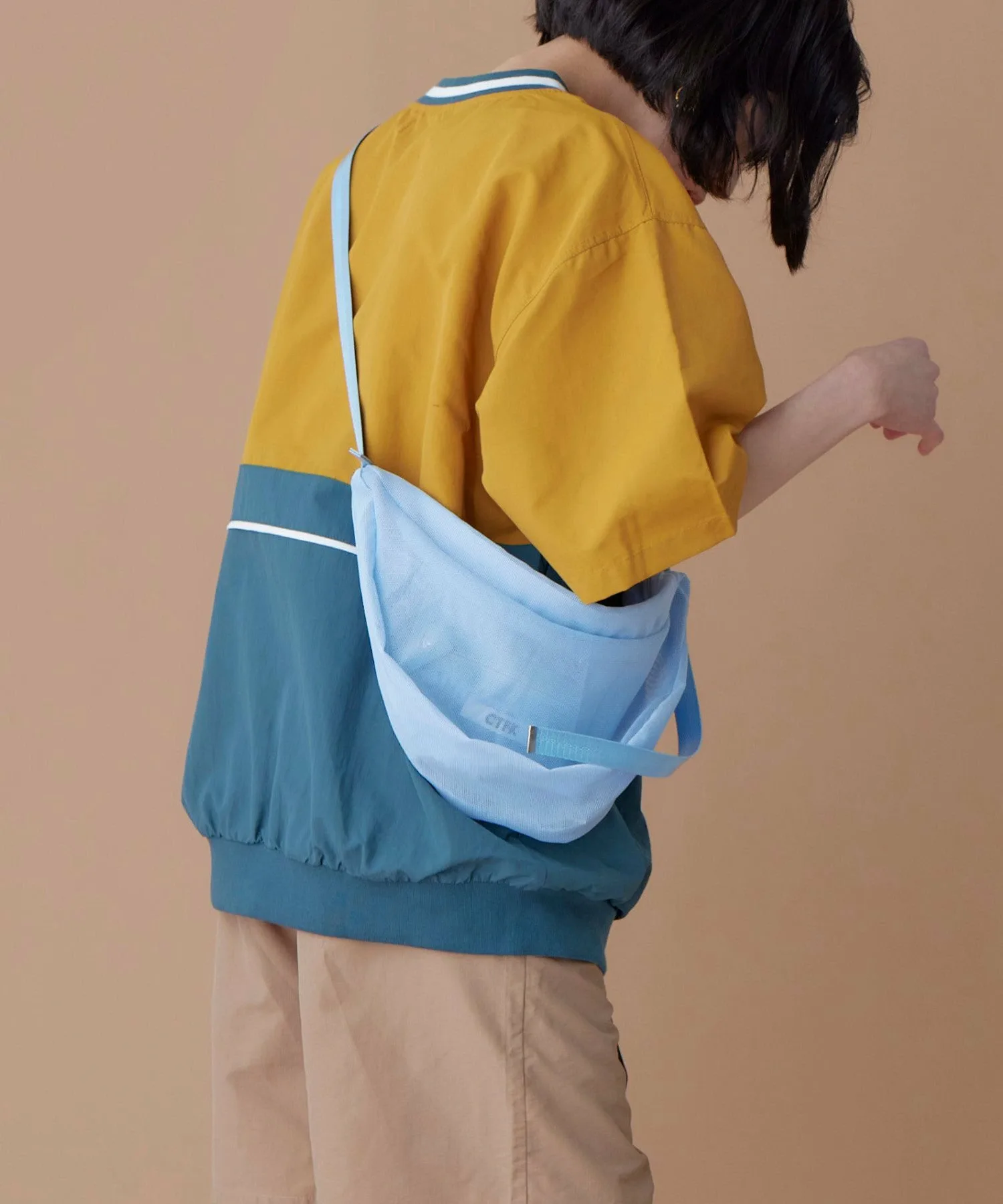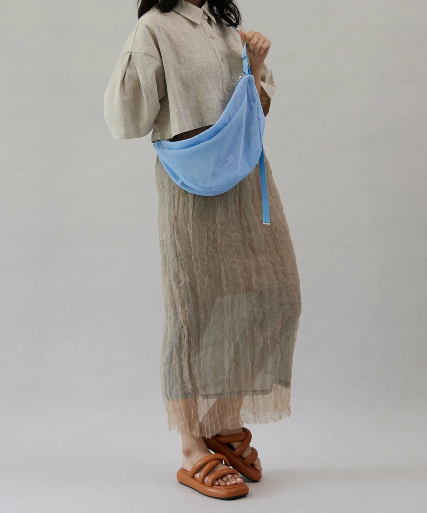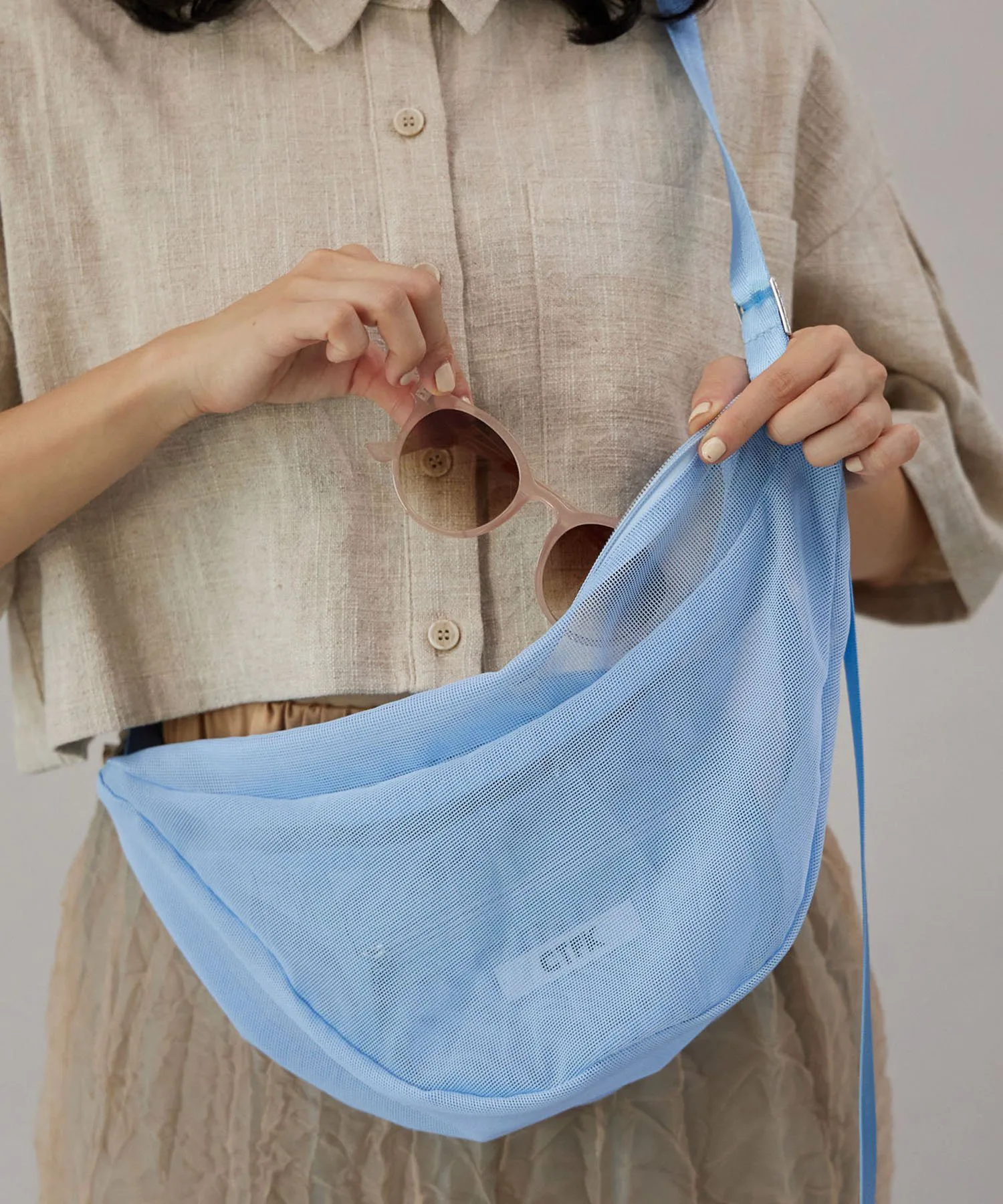 Сумка через плечо в форме полумесяца из прозрачной сетчатой ткани.