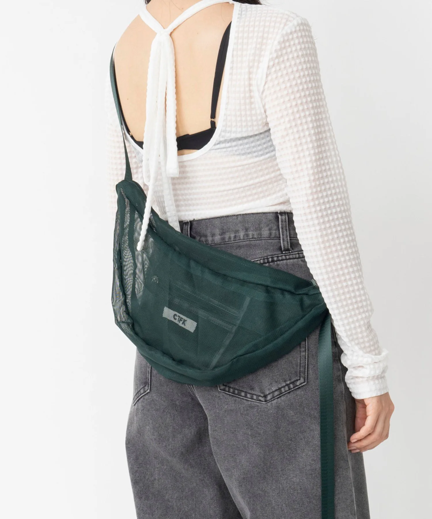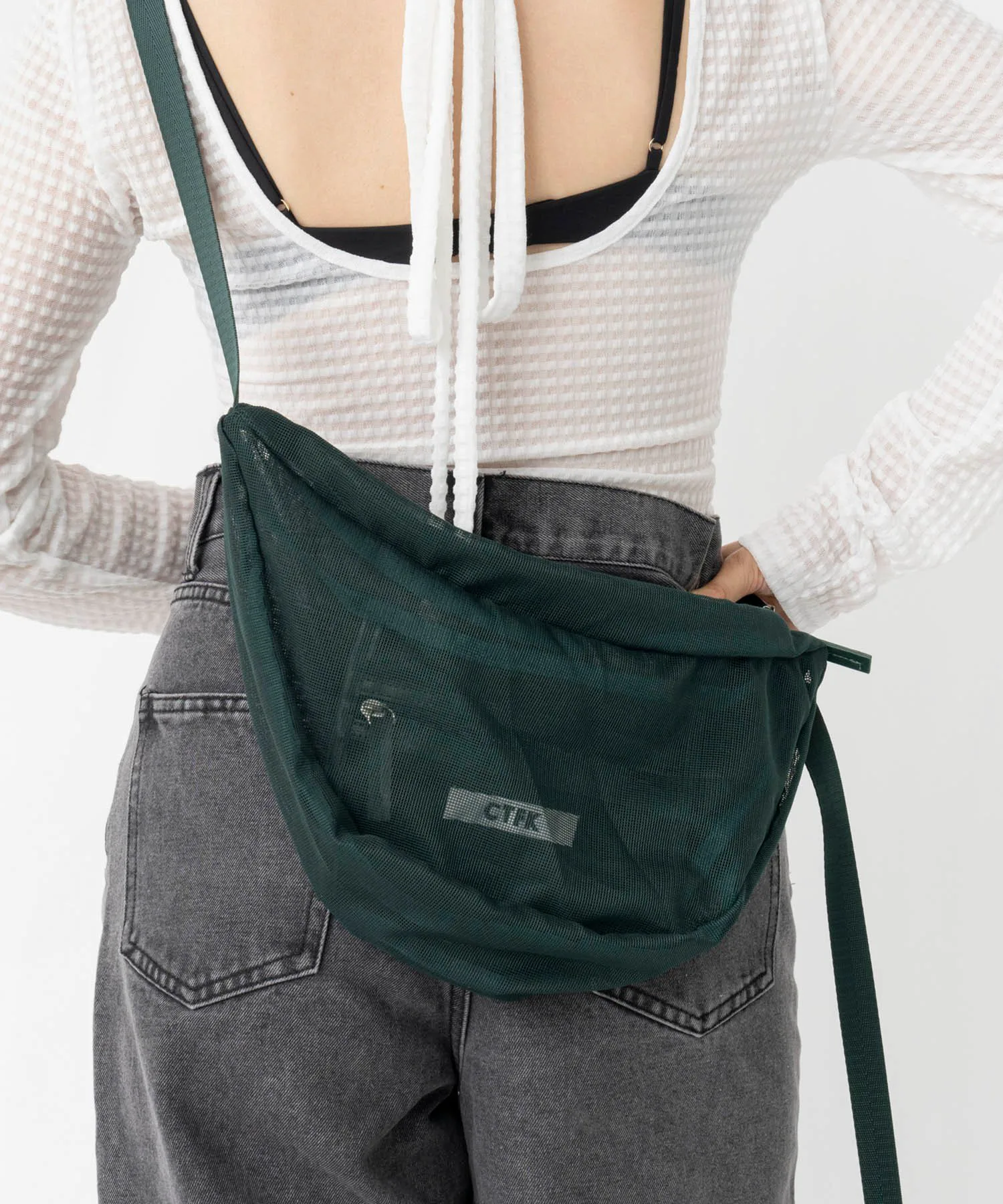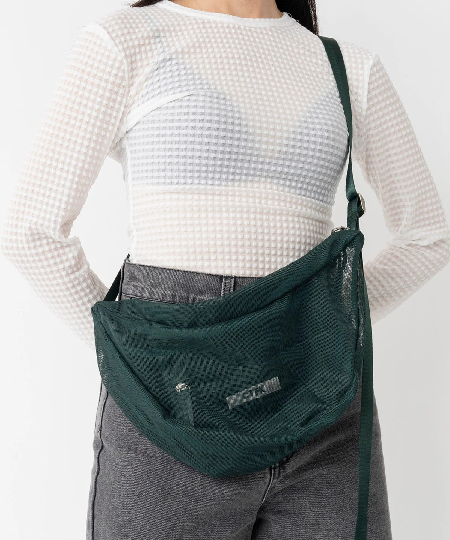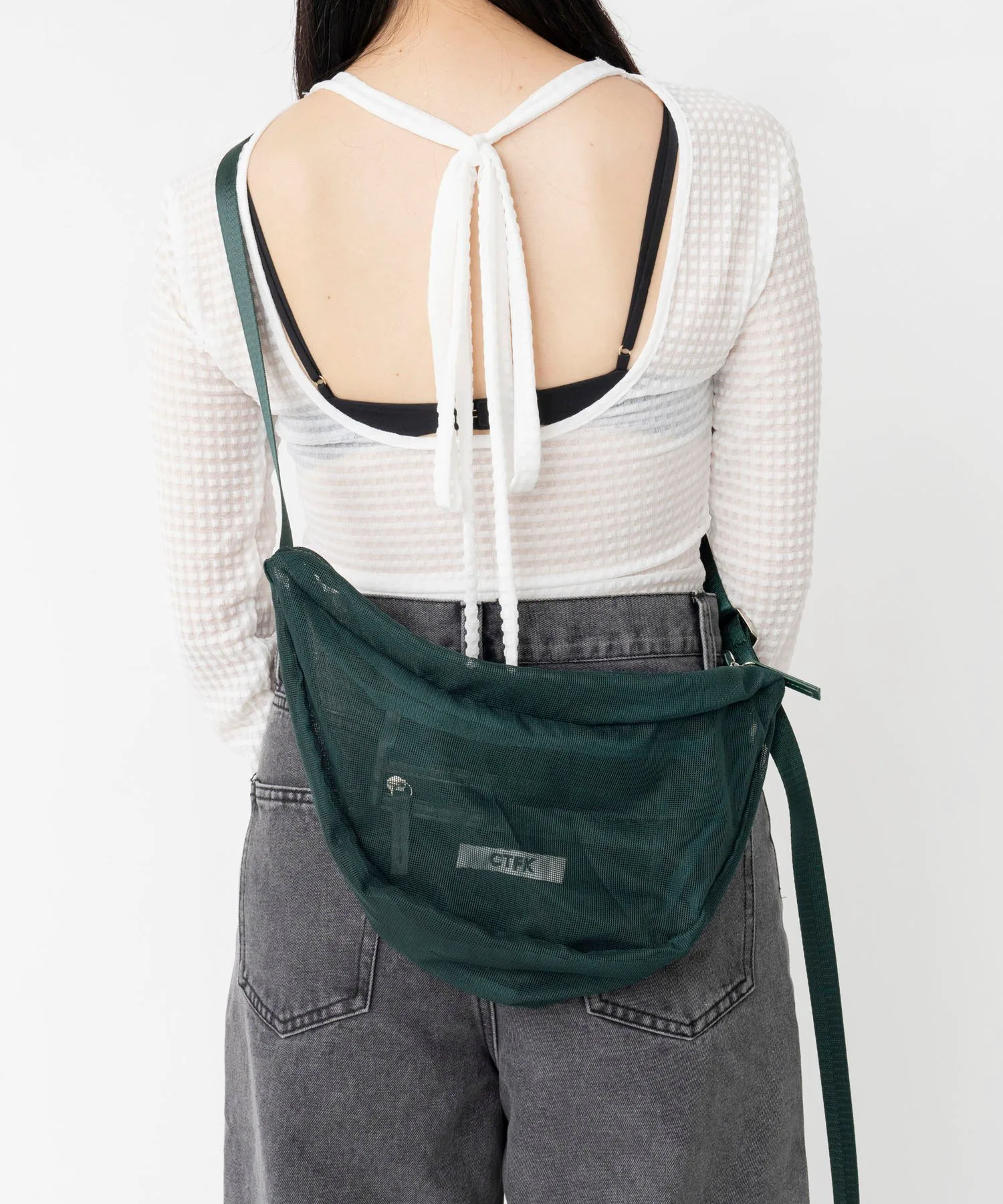 Сумка через плечо в форме полумесяца из прозрачной сетчатой ткани.