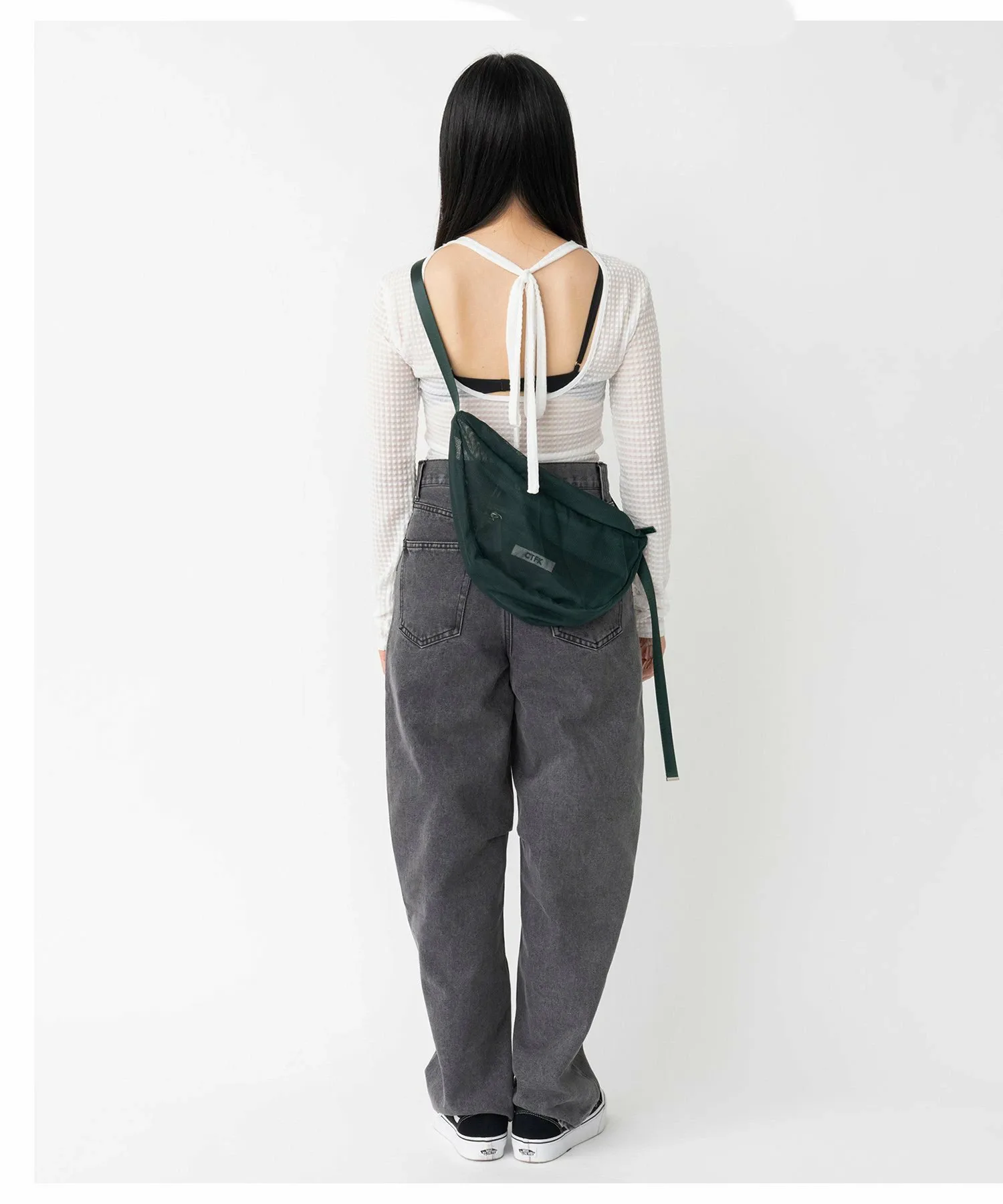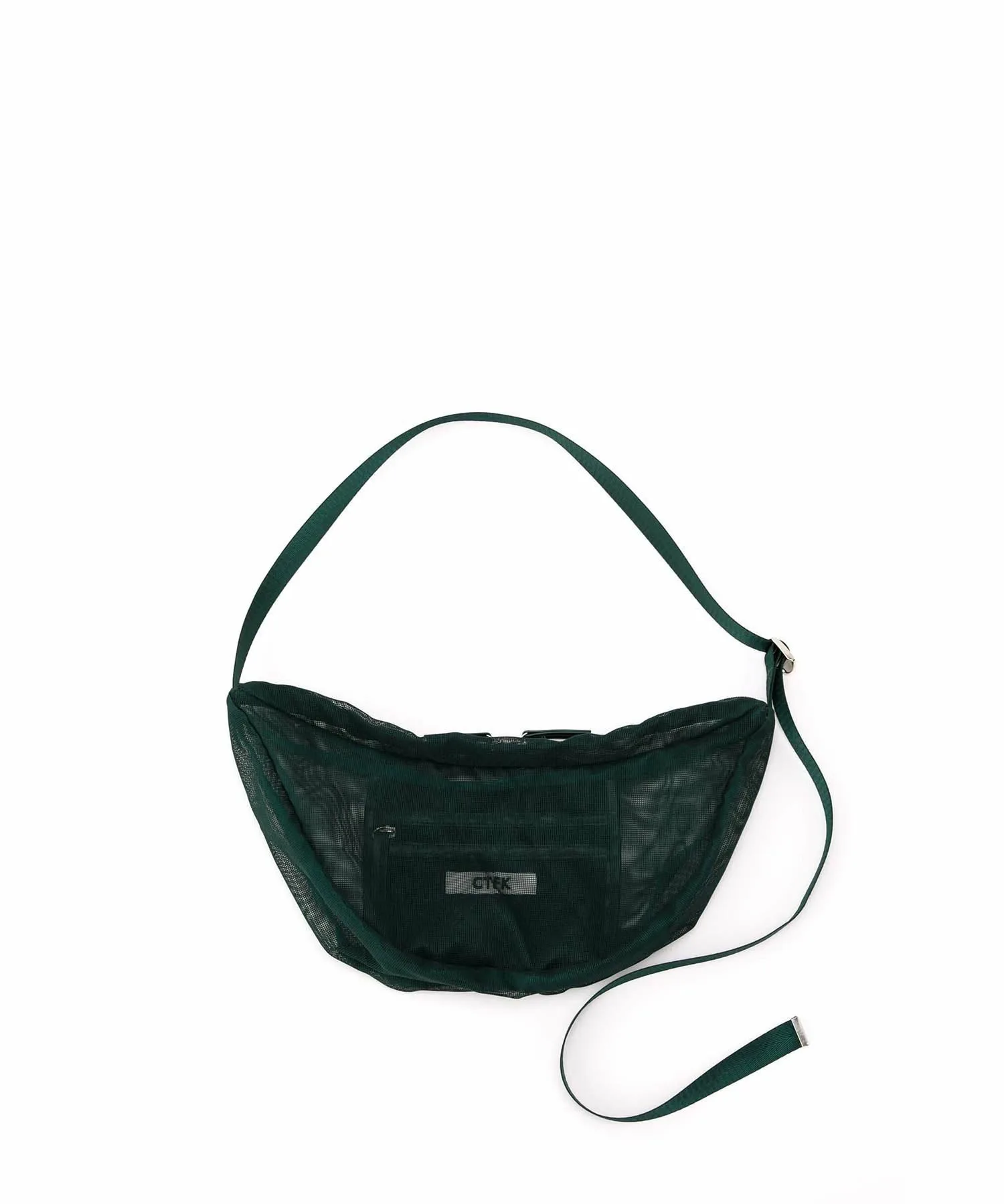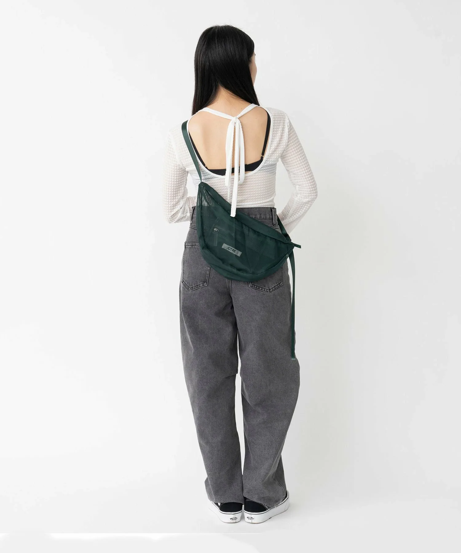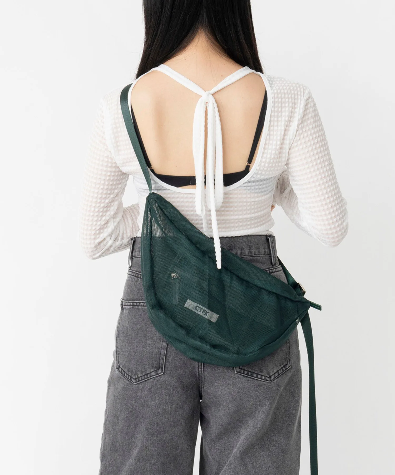 Сумка через плечо в форме полумесяца из прозрачной сетчатой ткани.