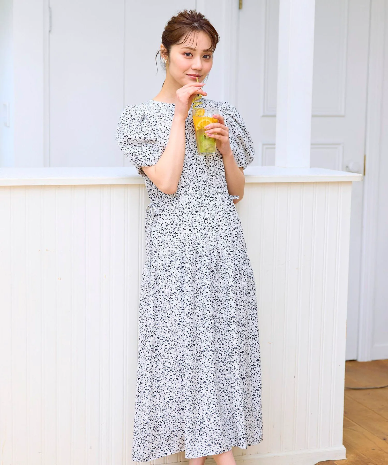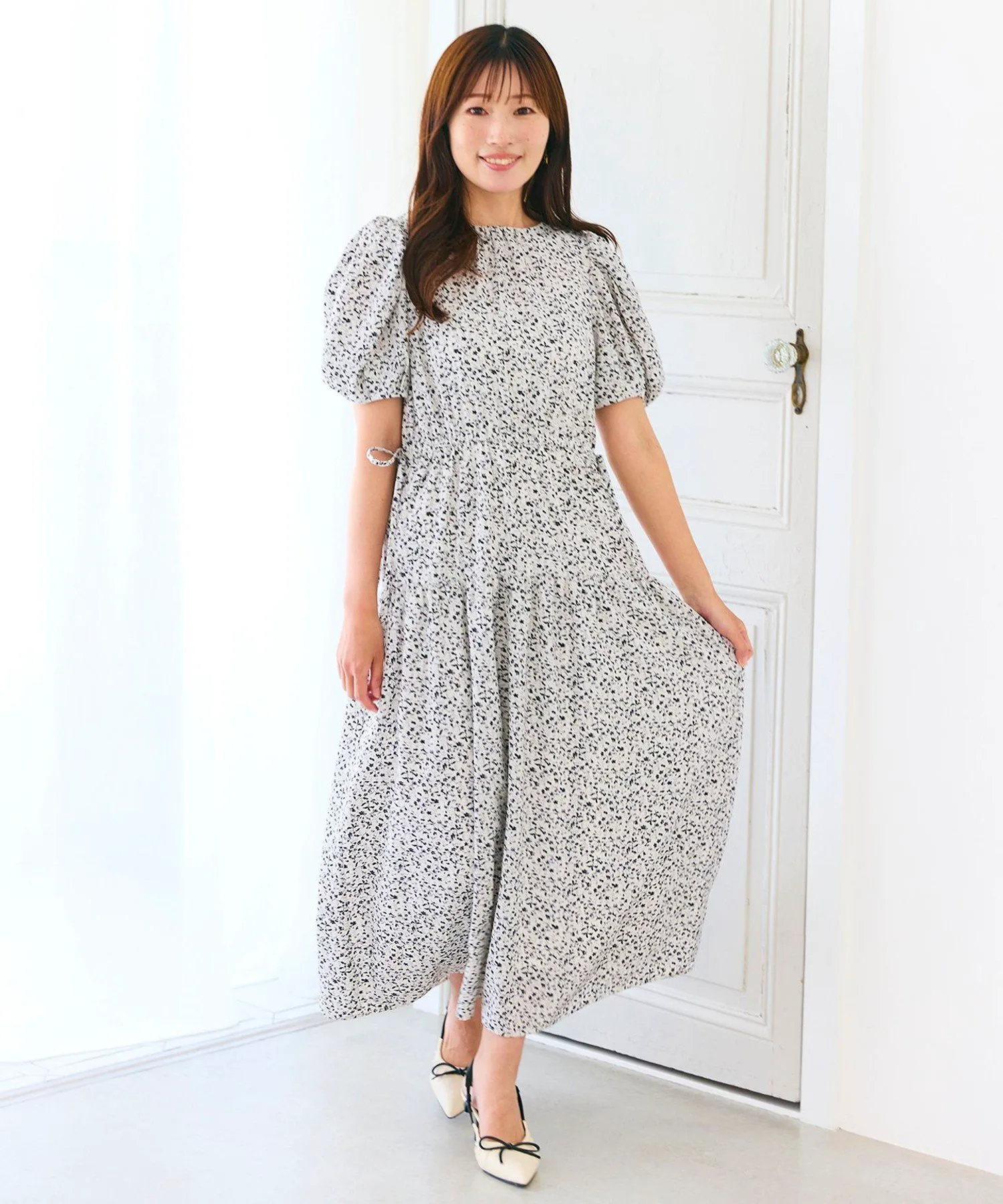 «Платье с принтом, идеально подходящее для лета, с очаровательным мелким цветочным узором, который обязательно привлечет ваше внимание. Сборчатые и драпированные рукава создают объемный эффект и имеют идеальную длину, мягко облегая предплечья, что делает его удобным в ношении. Воротник аккуратный круглый, а талия полностью эластичная, что делает платье комфортным. Тонкие ленты по бокам добавляют изысканный акцент. Многоярусная юбка, расширяющаяся от талии, легкая, струящаяся и элегантная. Платье, которое придаст вам нотку взрослой милости, не будучи при этом слишком слащавым.»