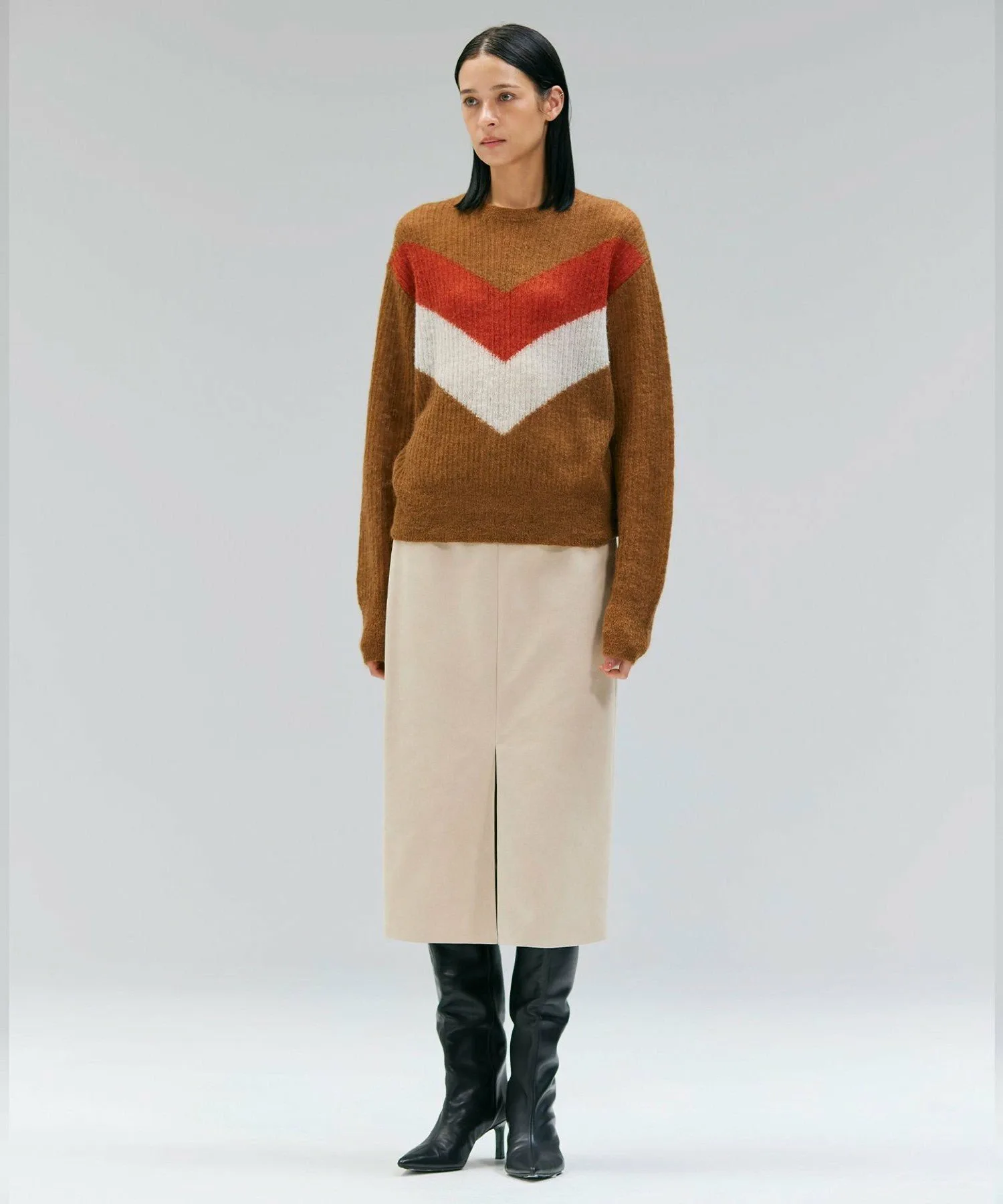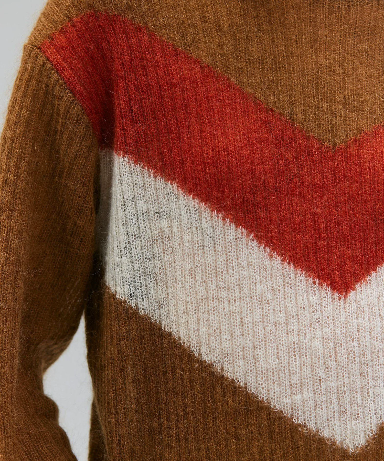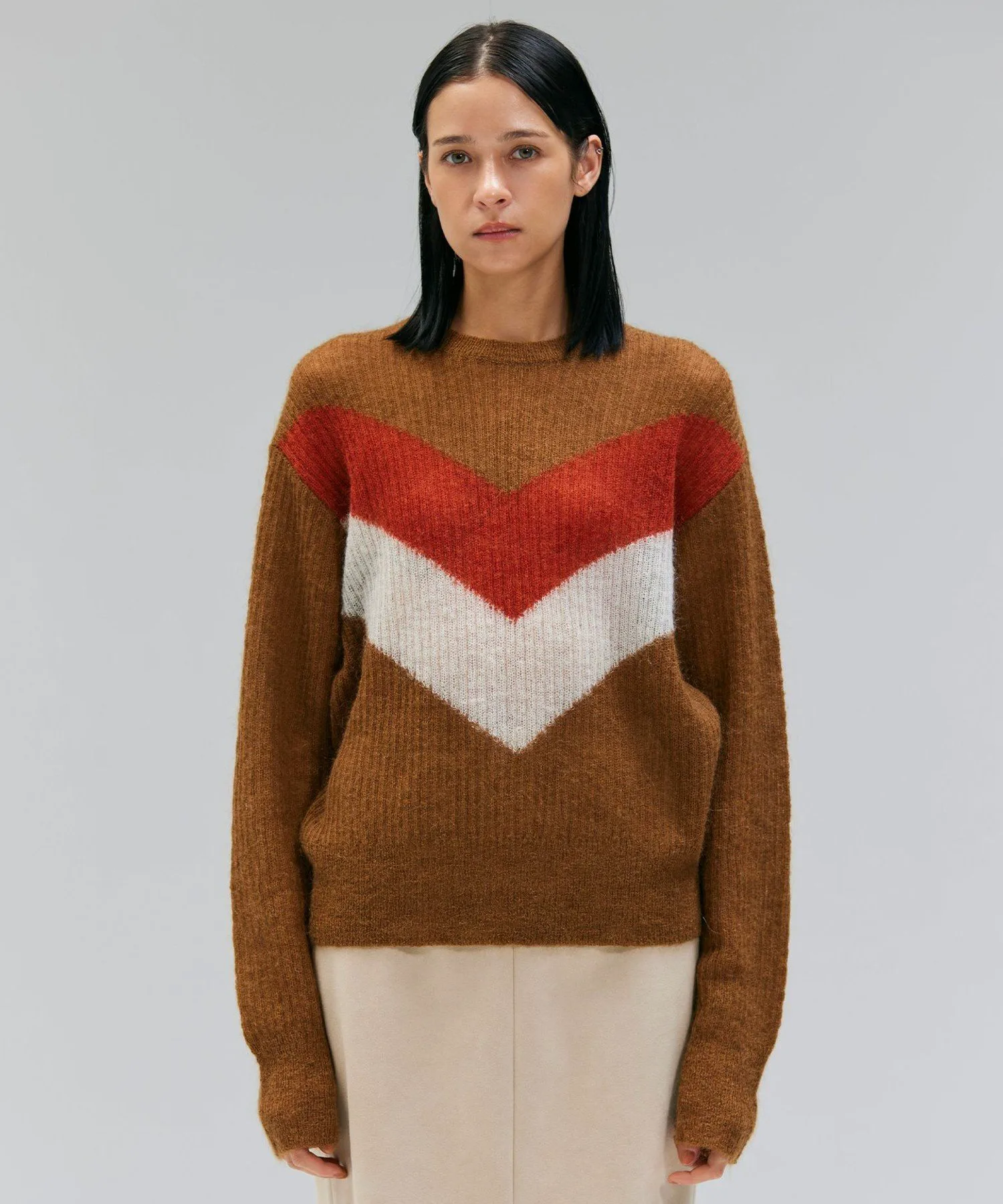 Этот трикотаж, выполненный в технике интарсии, представляет собой современную интерпретацию ретро-жаккарда 70-х годов. Умеренная прозрачность и мягкость мохера обеспечивают комфортную, свободную посадку, создавая мягкий, женственный образ. Идеально подходит как сам по себе, так и в сочетании с блузкой или водолазкой. Благодаря яркому цвету, этот трикотаж также добавит свежести любому наряду, даже без аксессуаров.