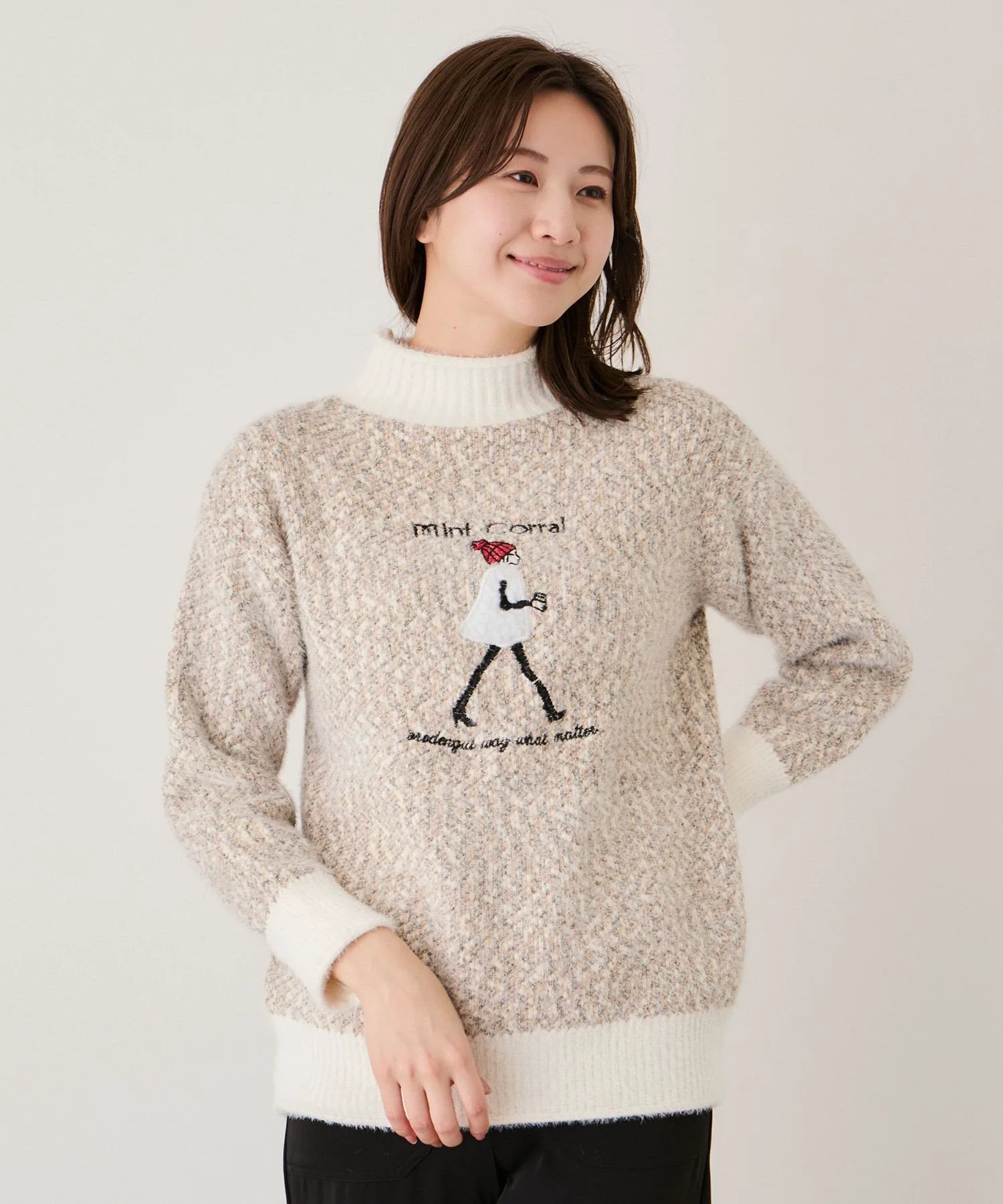 - Игривое изделие с вышитым мотивом идущей женщины на мягком, пушистом трикотаже.