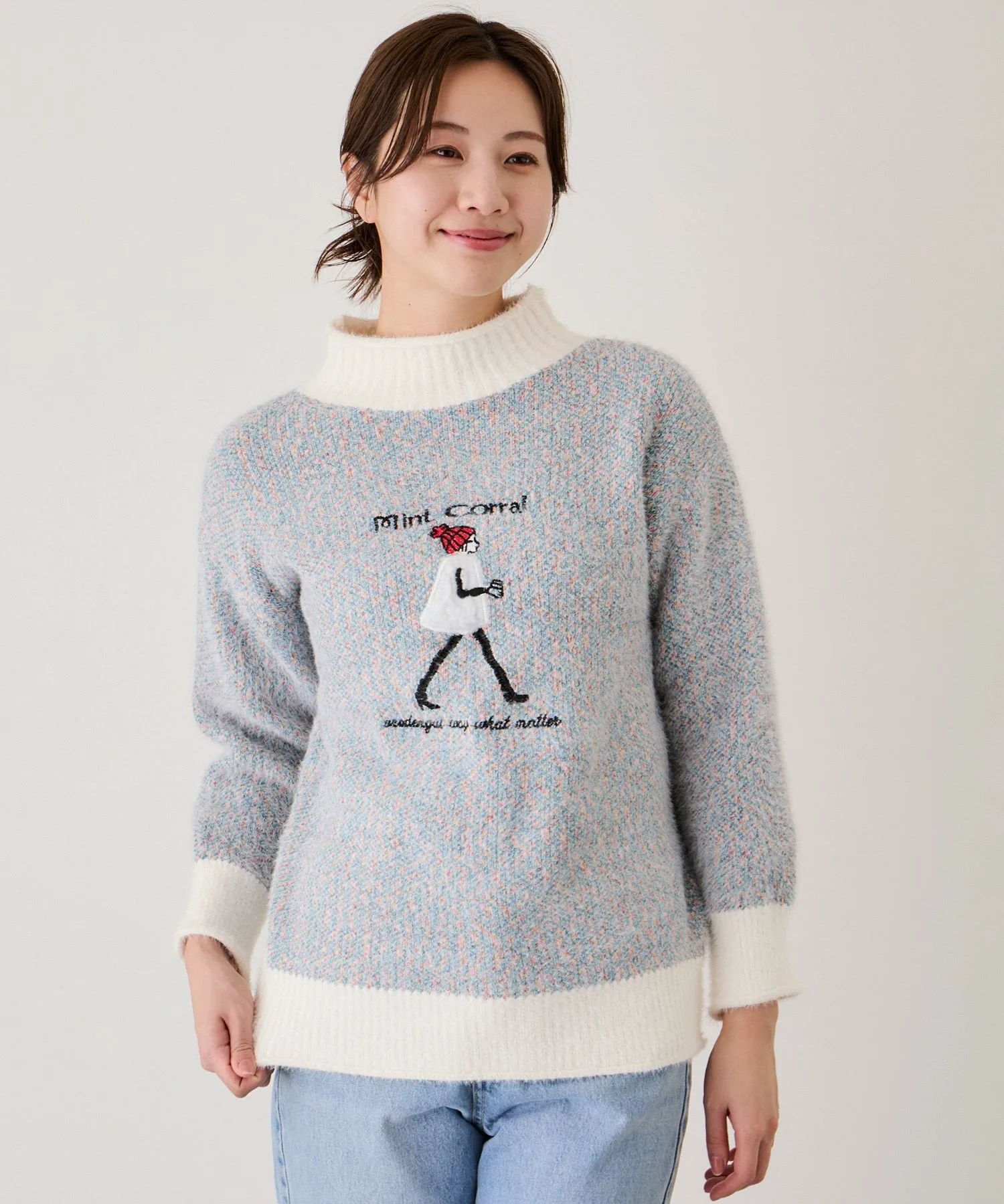 - Игривое изделие с вышитым мотивом идущей женщины на мягком, пушистом трикотаже.