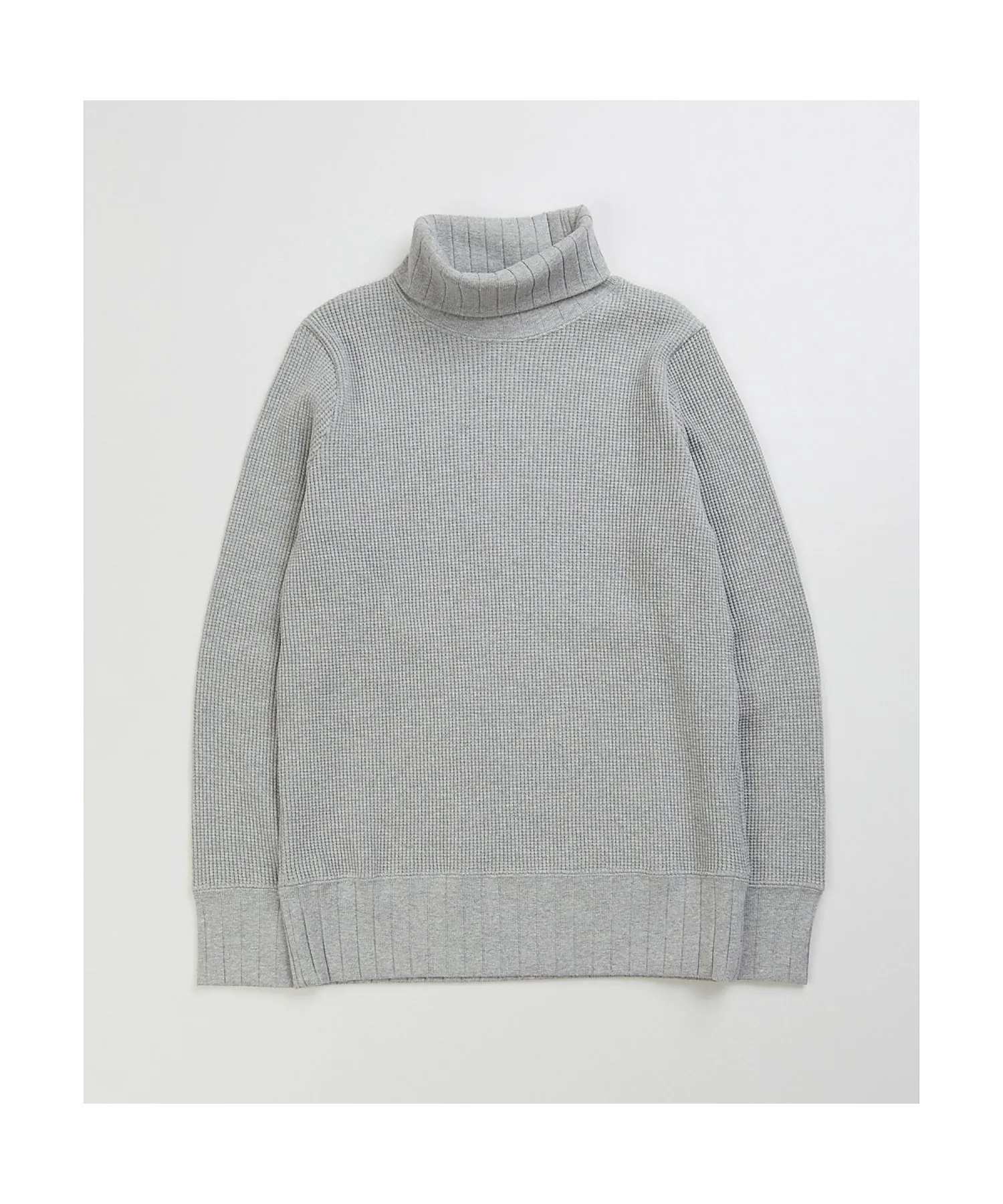 Это хлопковая водолазка с вафельным узором. Трехмерная вафельная ткань изготовлена из 100% хлопка, поэтому она хорошо пропускает воздух и отличается отличным сохранением тепла и высокой влагостойкостью. Ее можно носить как самостоятельно осенью, когда температура на улице начинает падать, так и в качестве нижнего слоя под трикотажную кофту или куртку в сухую зиму. Изделия с вафельным узором очень эластичны, но имеют недостаток — склонность к растяжению. Однако, благодаря тщательному расчету баланса между свойствами пряжи и трикотажа, эта вещь создана как рубашка, которая сохраняет свою форму даже при длительной носке, оставаясь при этом комфортной в ношении.