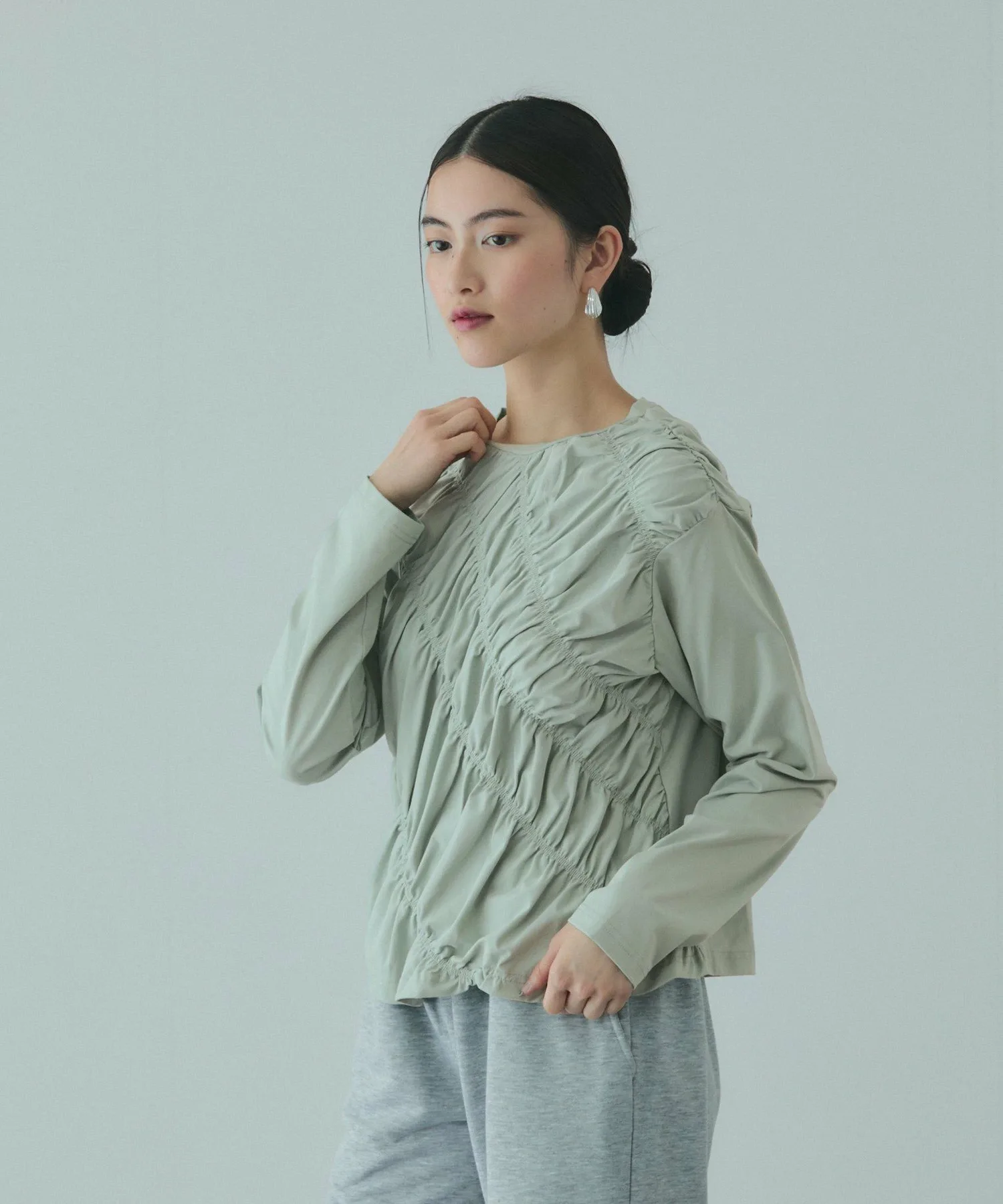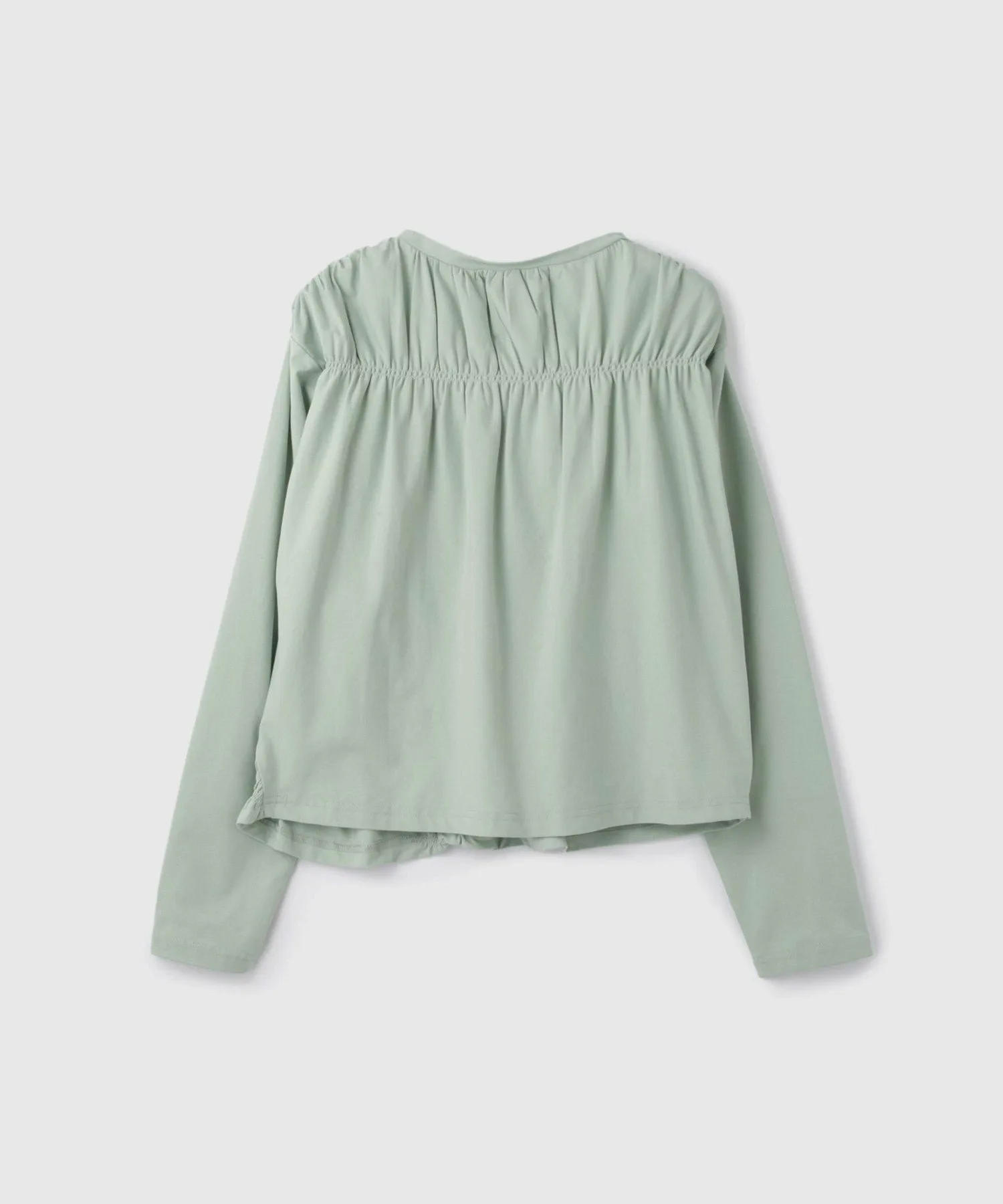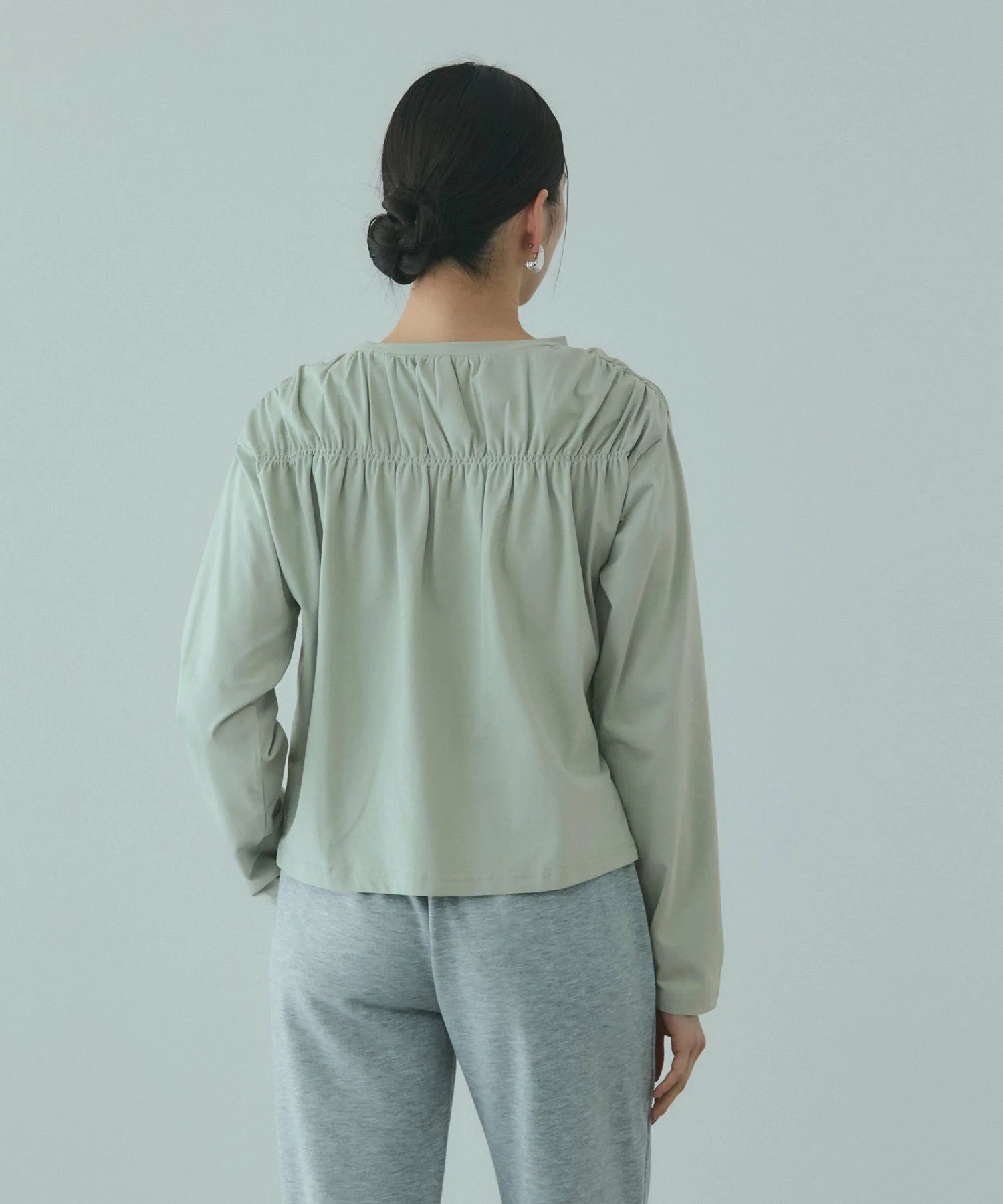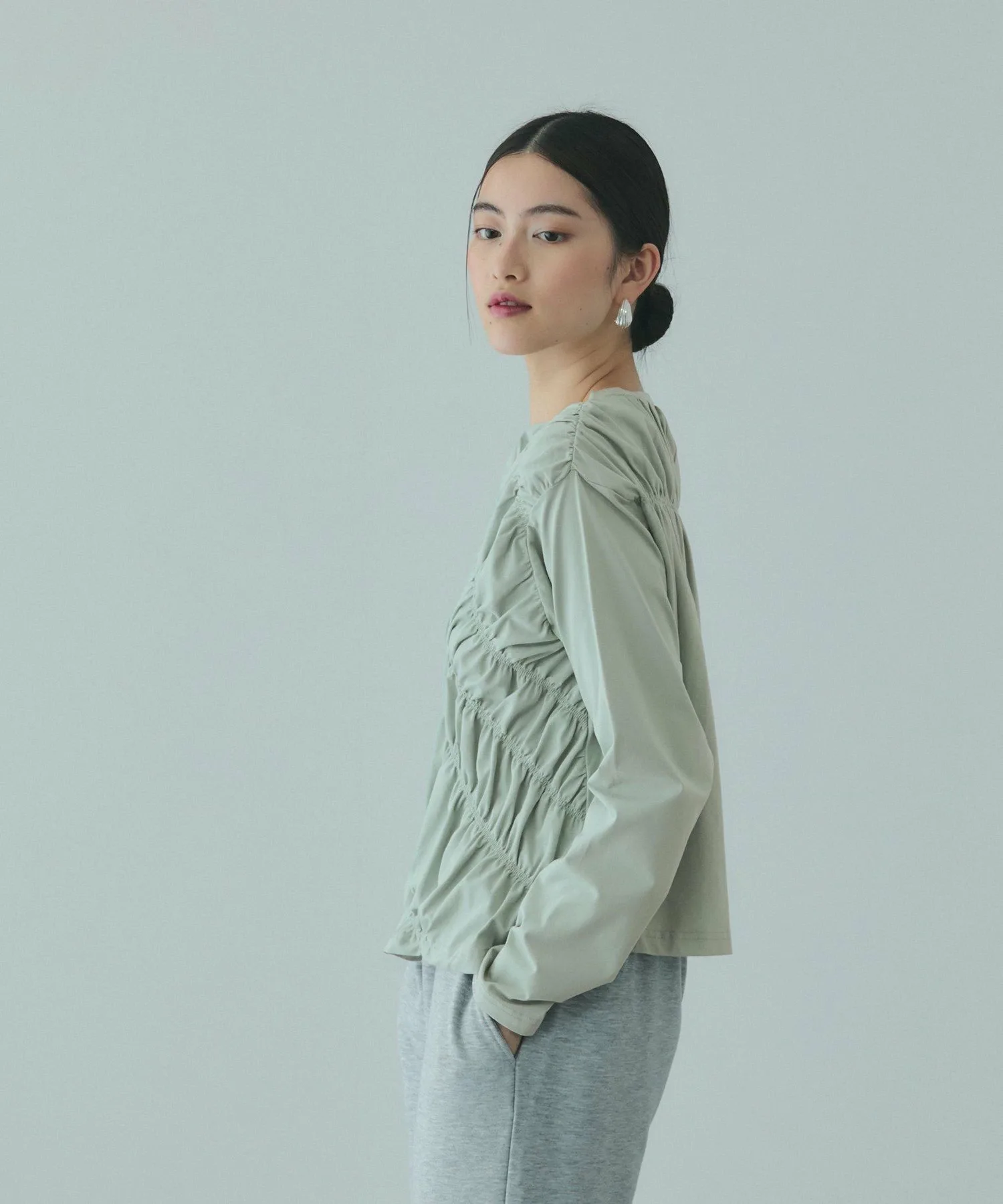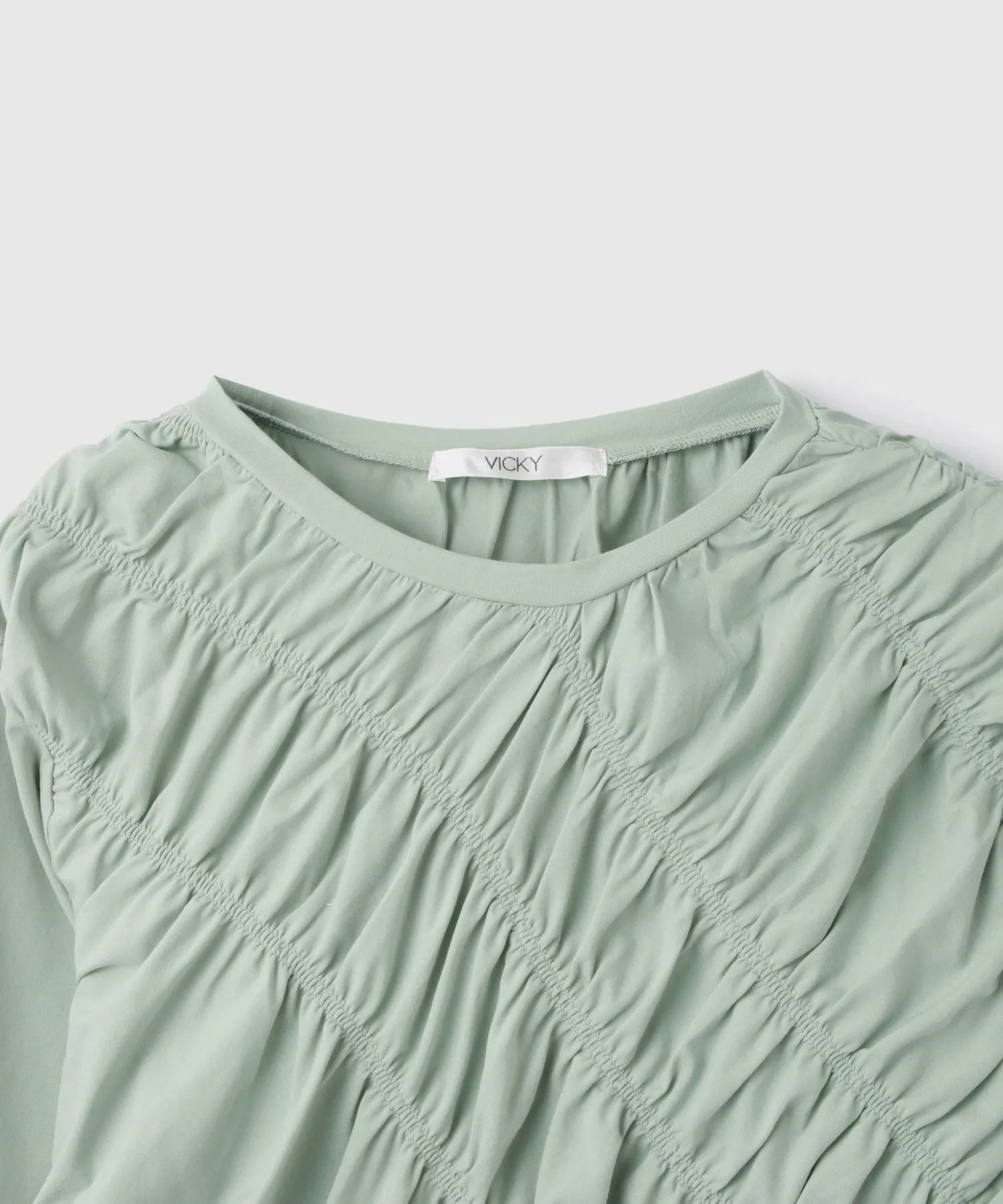 Силуэт облегает тело, а обильные сборки спереди и сборка на кокетке сзади обеспечивают свободу движений.