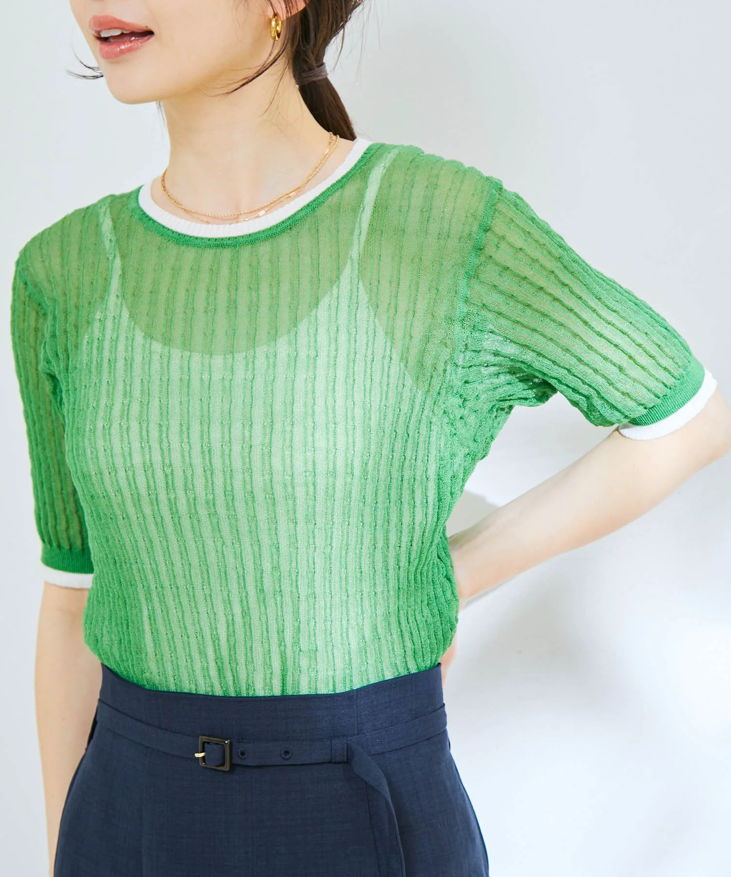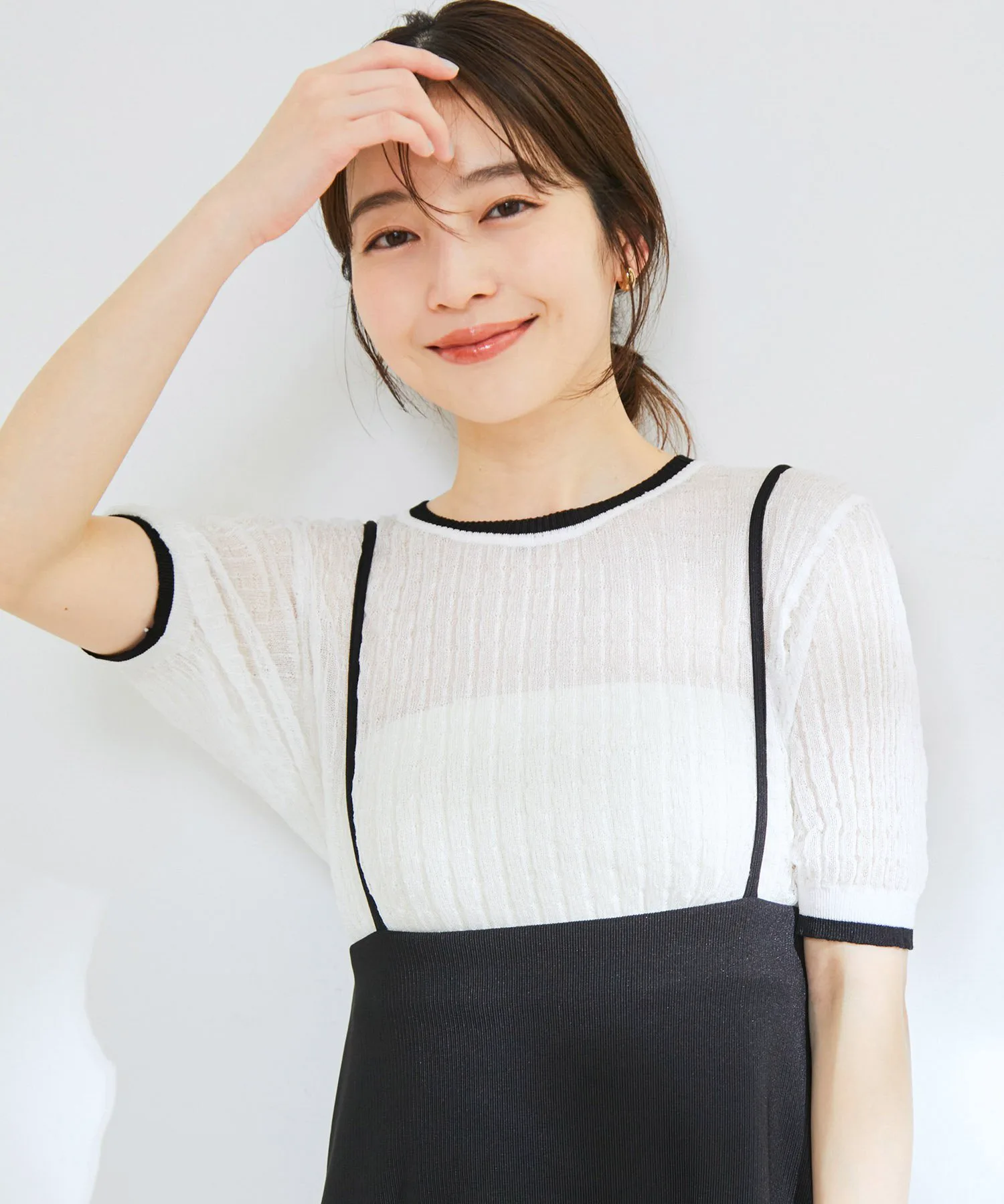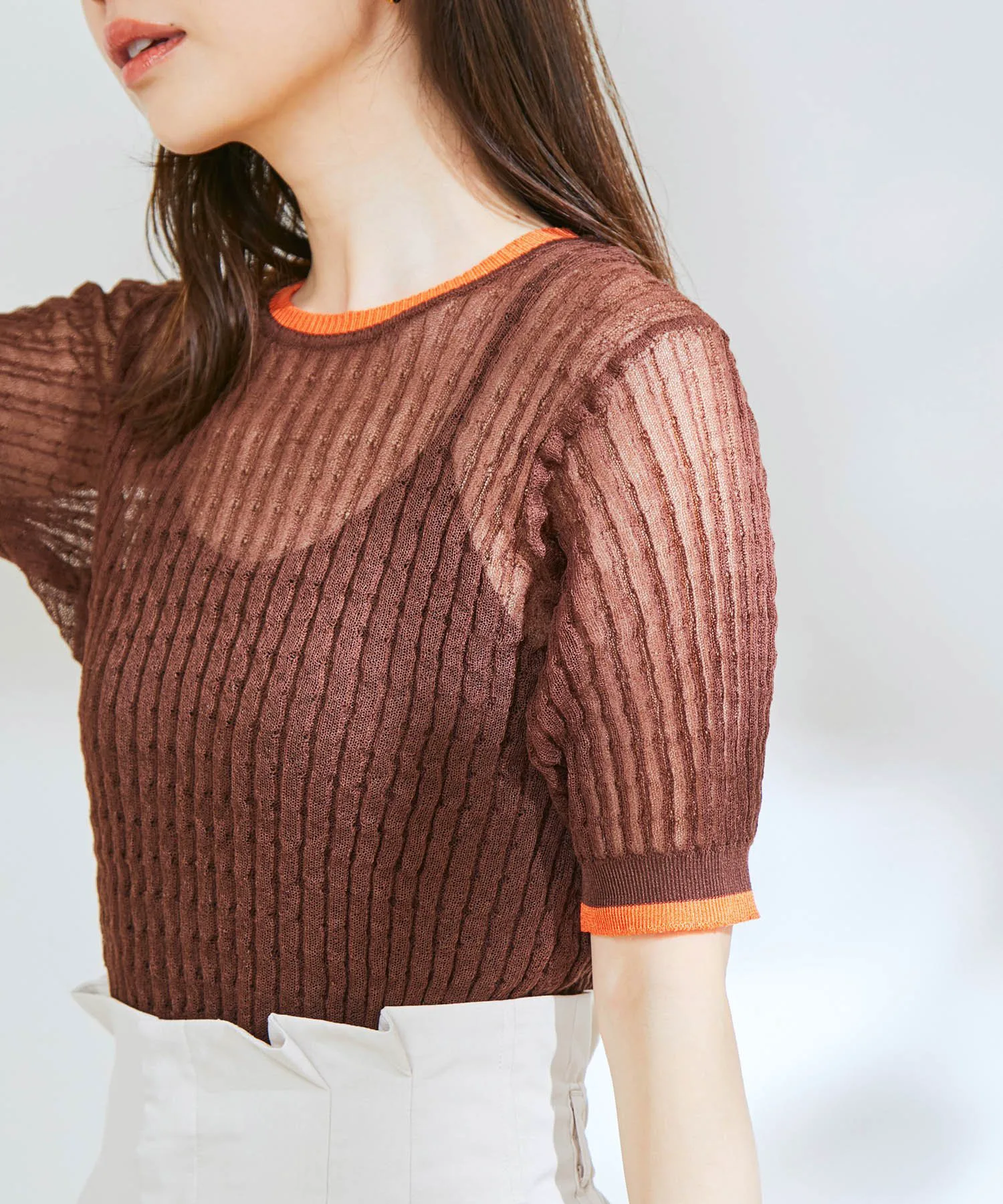 Несмотря на простую форму, этот вязаный пуловер с короткими рукавами имеет текстурированную поверхность, которая придает ему прохладное, полупрозрачное ощущение.