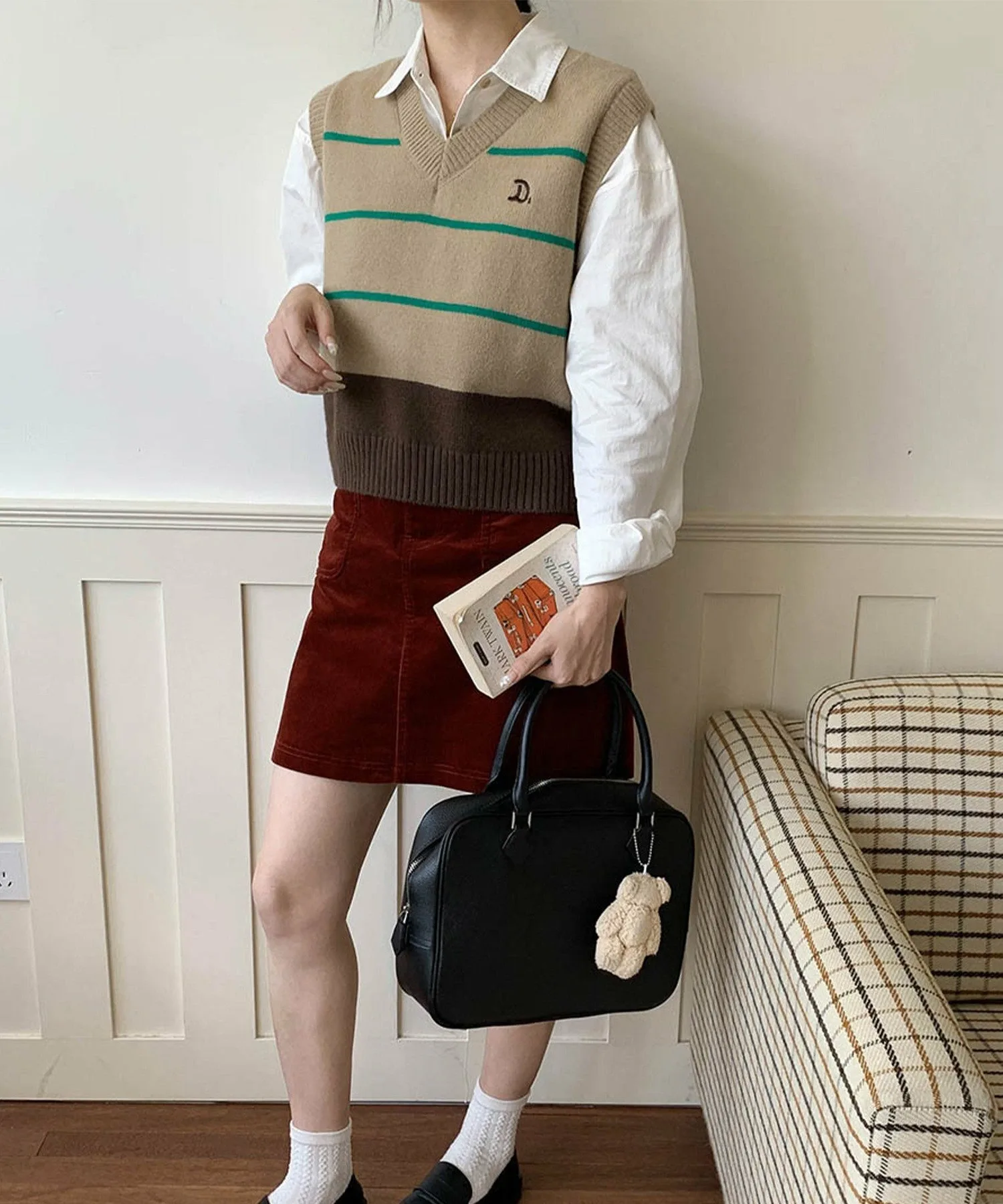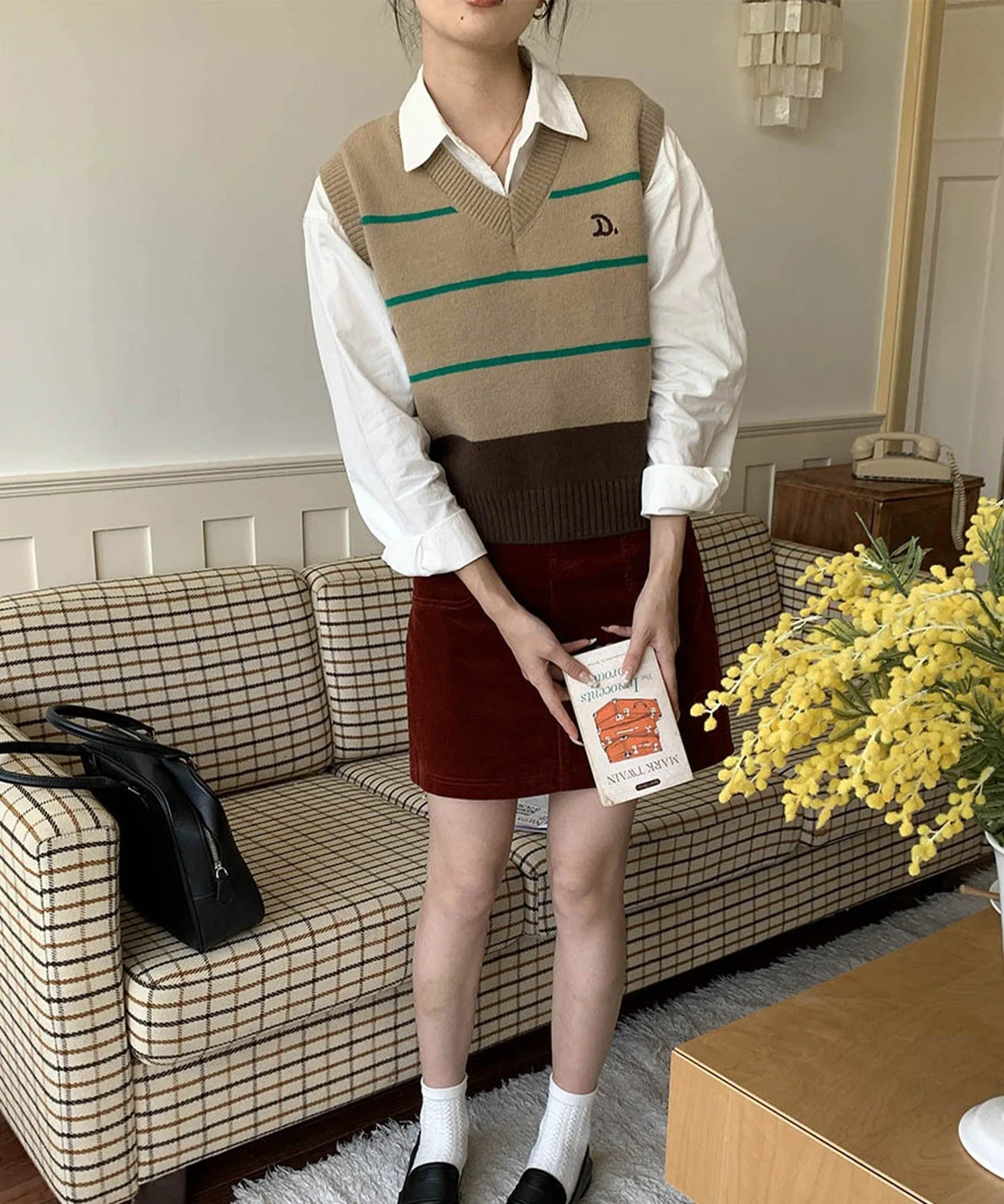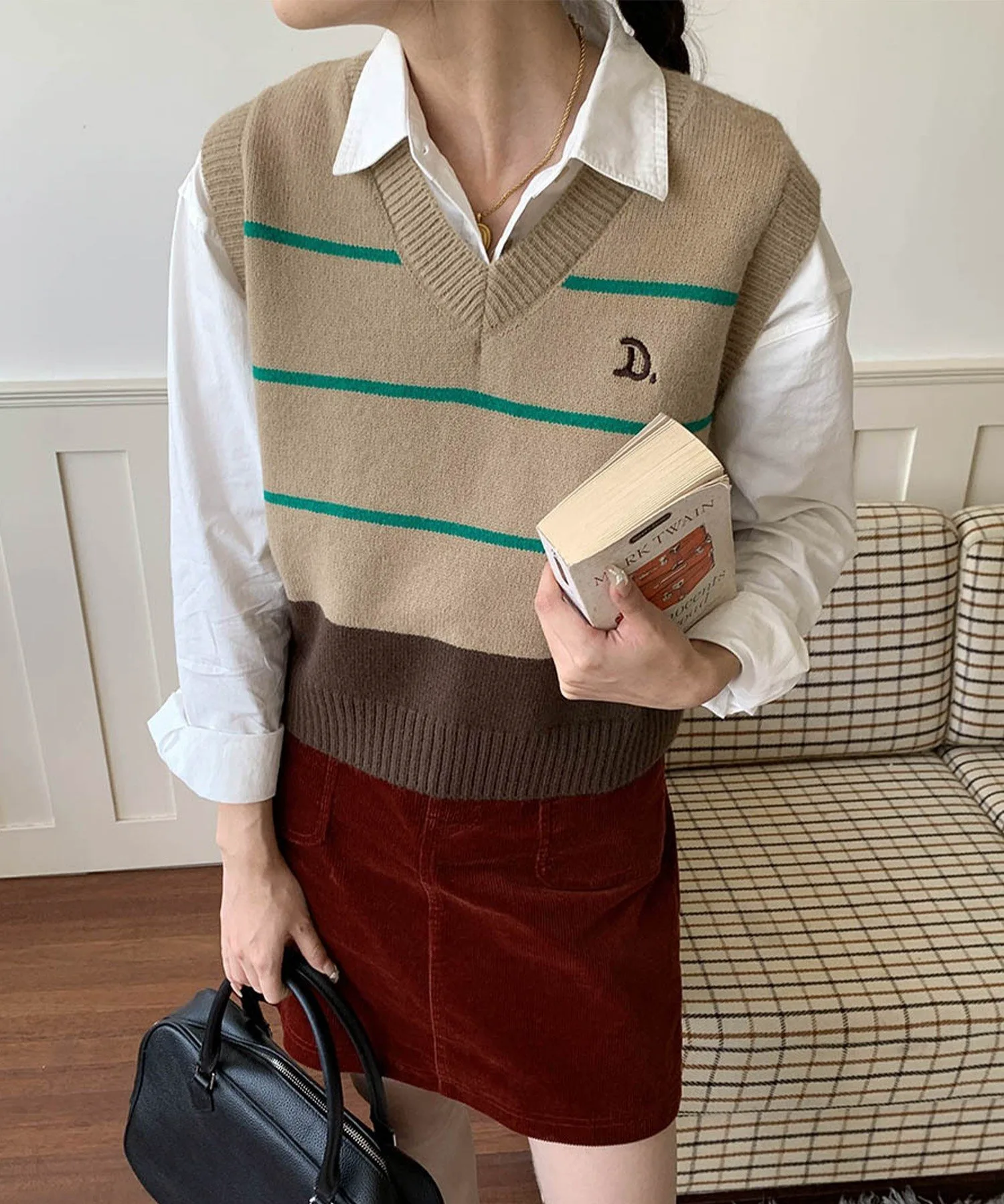 Вязаный жилет в стиле ретро благодаря спокойной цветовой гамме и дизайну.