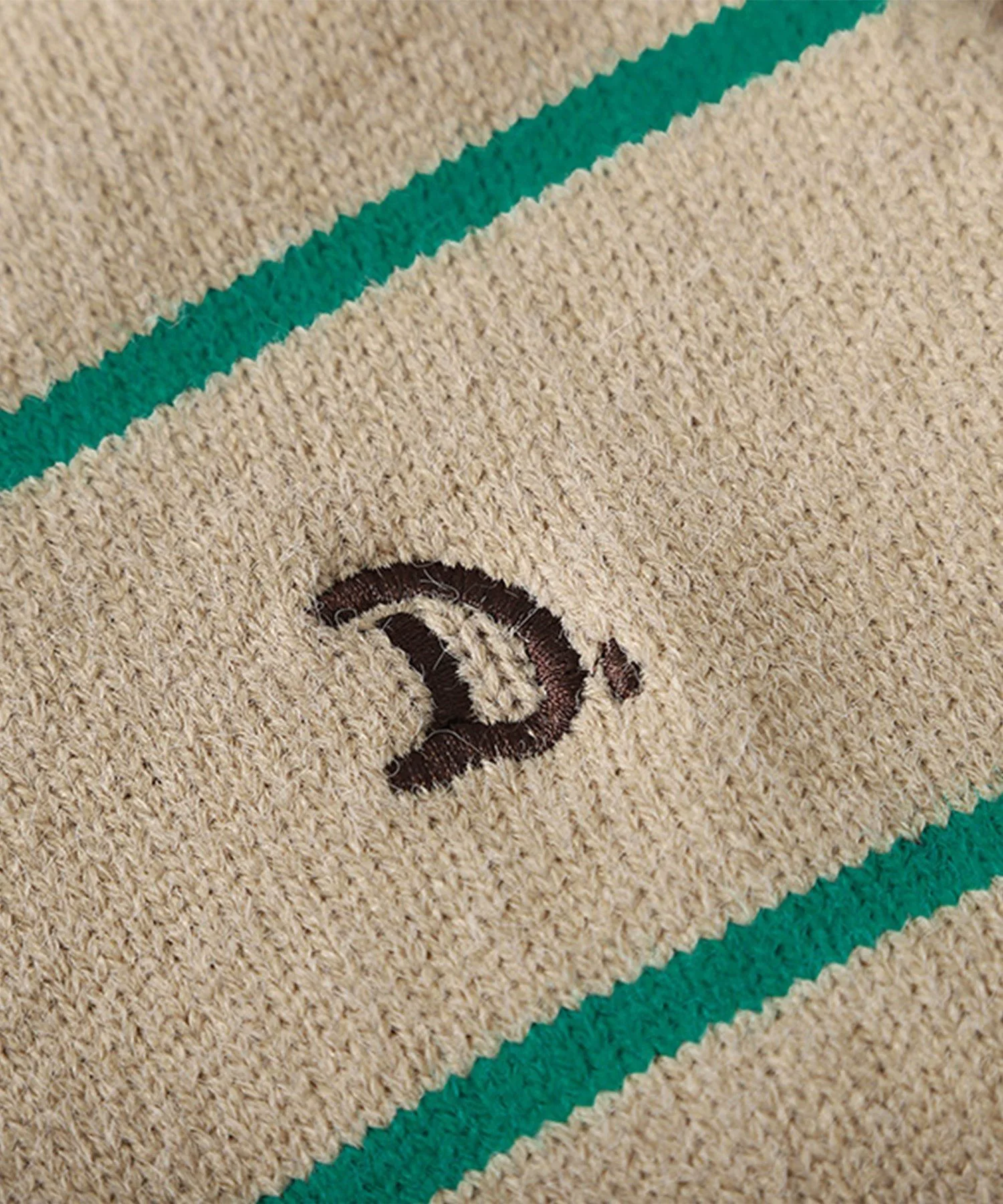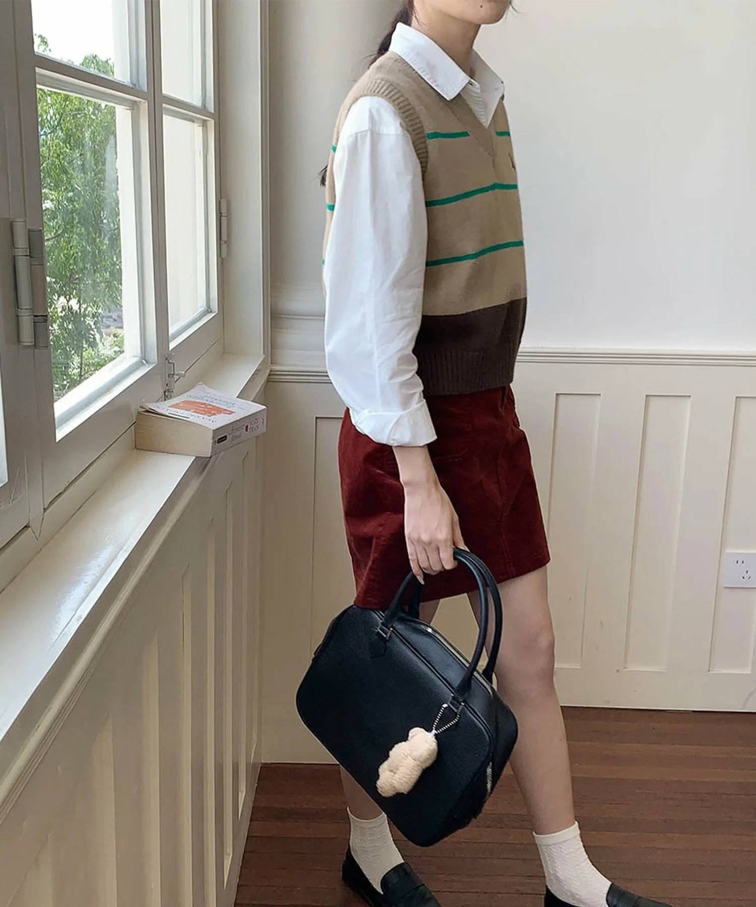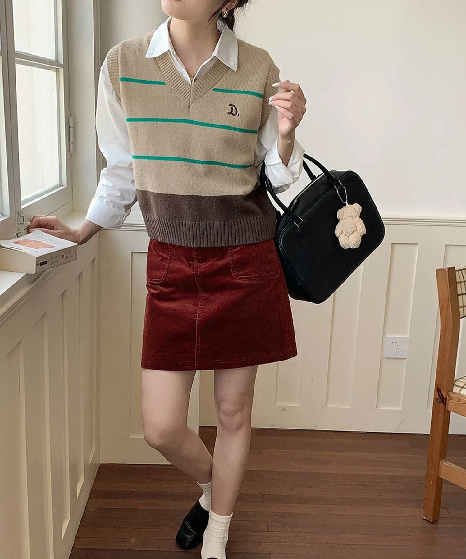 V-образный вырез и полосатый узор создают простой, но стильный образ.