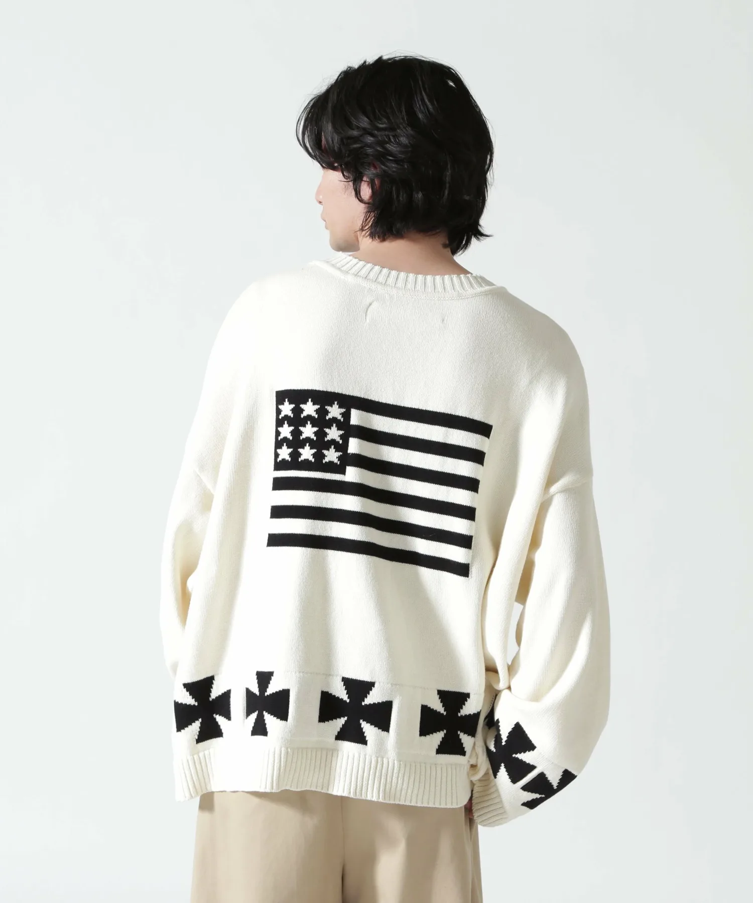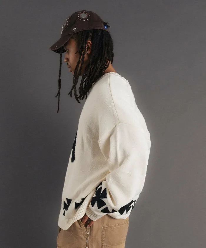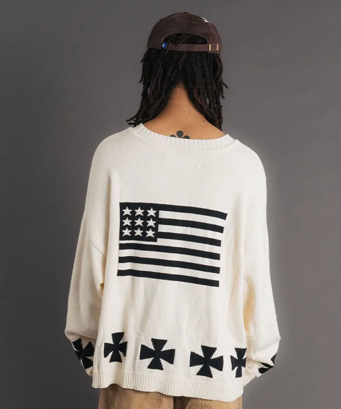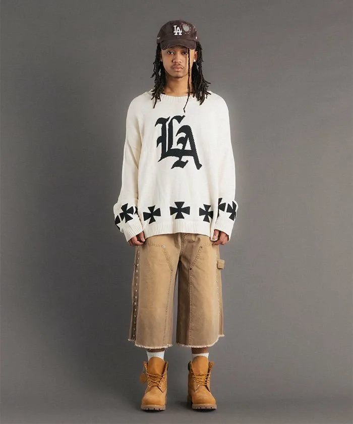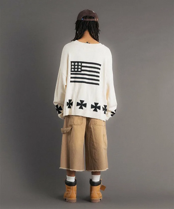 Этот объемный жаккардовый трикотаж украшен привлекательными графическими элементами. Спереди расположен логотип «LA» в староанглийском стиле, а сзади — смелый мотив американского флага. Нижний край также украшен крестообразным узором, создавая эффектный дизайн под любым углом. Материал: Изготовлен из 100% хлопка. Он приятен на ощупь и не вызывает типичного для шерсти зуда. Отличная воздухопроницаемость и влагоотводящие свойства делают его подходящим для всех сезонов, от осени до весны. Жаккардовая вязка имеет оптимальную толщину для комфортного ощущения пота. Силуэт и размер: Модный очень широкий силуэт со спущенными плечами и широким кроем. Тщательно разработанный свободный крой (размер F) дополняет широкий спектр стилей, от уличной моды до хип-хопа, дзимнкэй и Y2K.