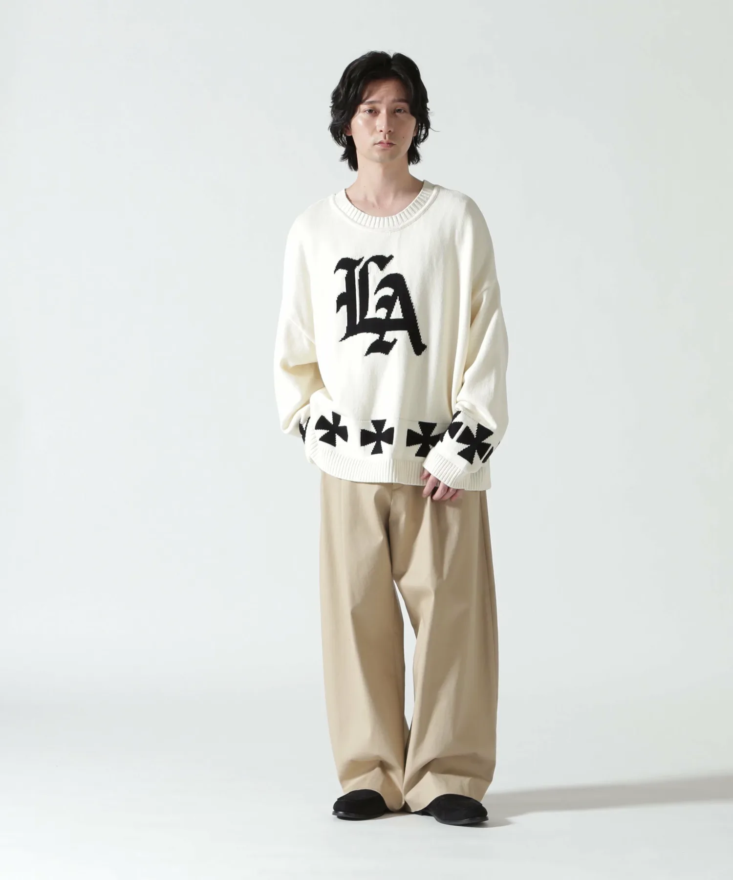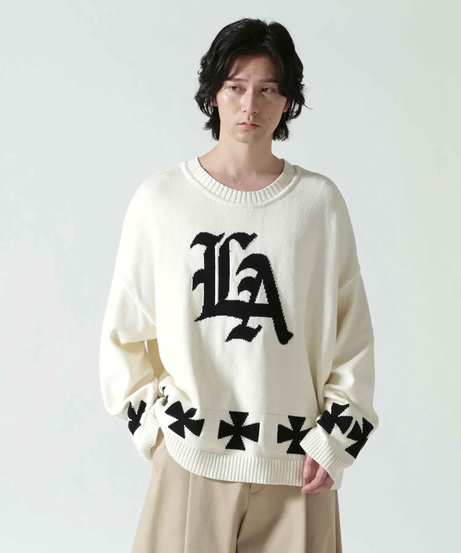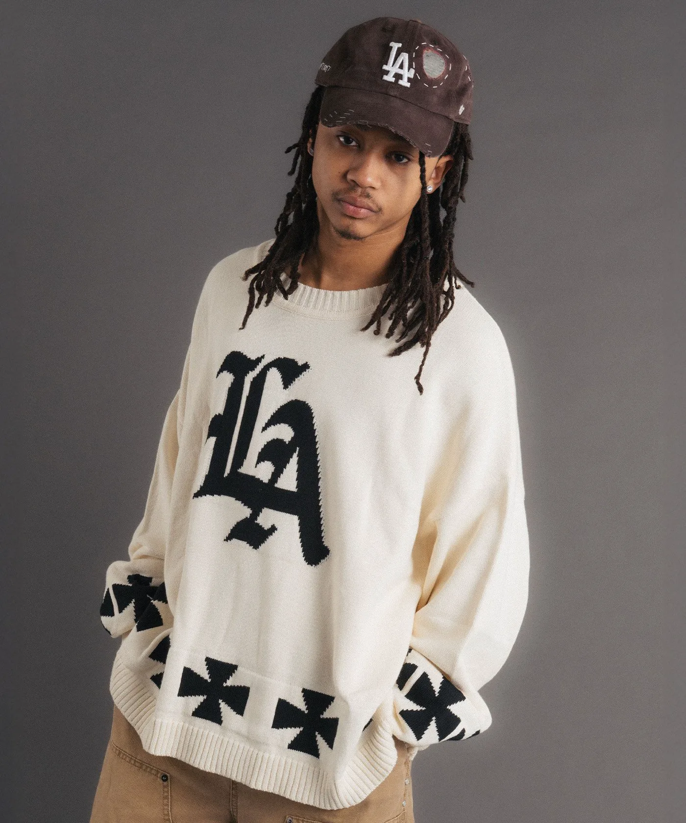 Этот объемный жаккардовый трикотаж украшен привлекательными графическими элементами. Спереди расположен логотип «LA» в староанглийском стиле, а сзади — смелый мотив американского флага. Нижний край также украшен крестообразным узором, создавая эффектный дизайн под любым углом. Материал: Изготовлен из 100% хлопка. Он приятен на ощупь и не вызывает типичного для шерсти зуда. Отличная воздухопроницаемость и влагоотводящие свойства делают его подходящим для всех сезонов, от осени до весны. Жаккардовая вязка имеет оптимальную толщину для комфортного ощущения пота. Силуэт и размер: Модный очень широкий силуэт со спущенными плечами и широким кроем. Тщательно разработанный свободный крой (размер F) дополняет широкий спектр стилей, от уличной моды до хип-хопа, дзимнкэй и Y2K.