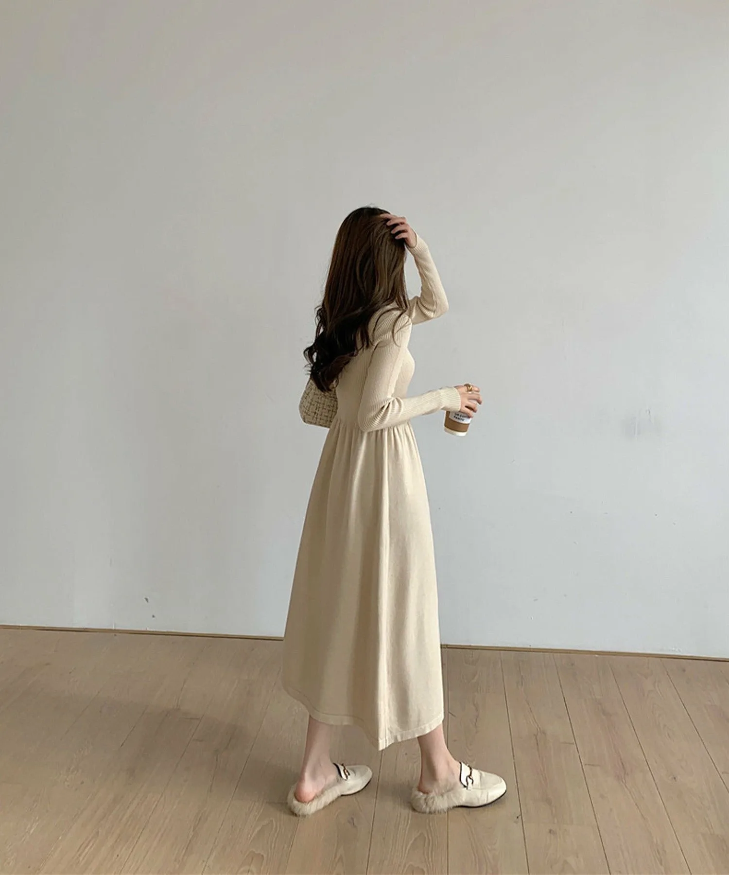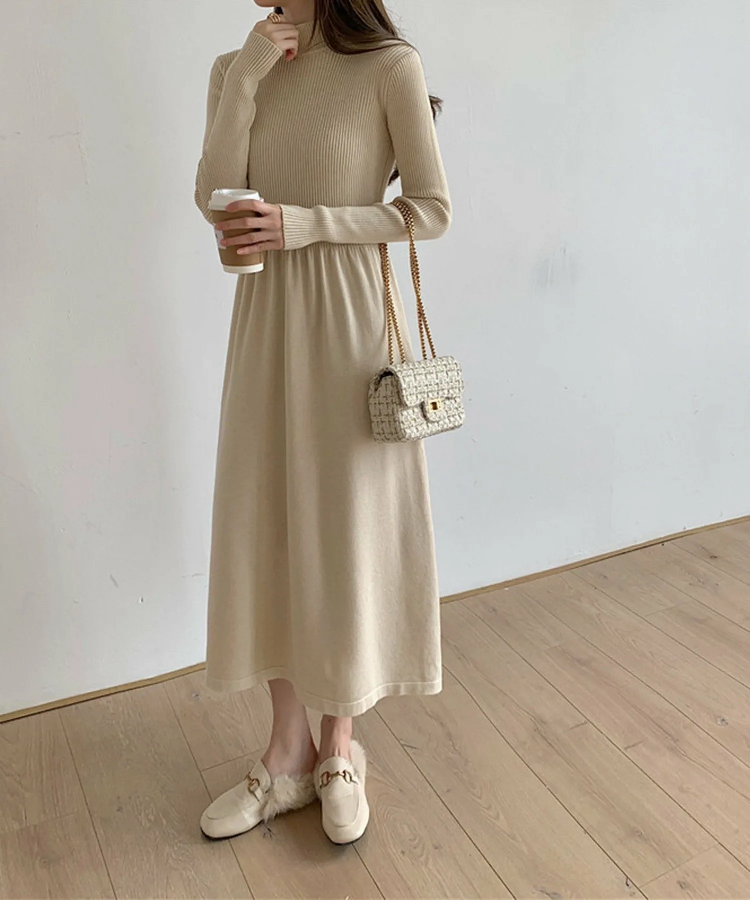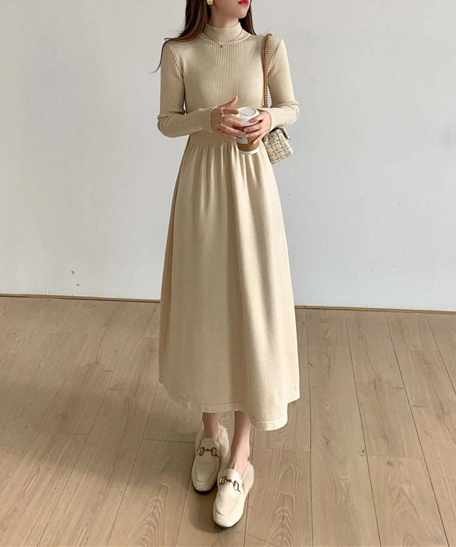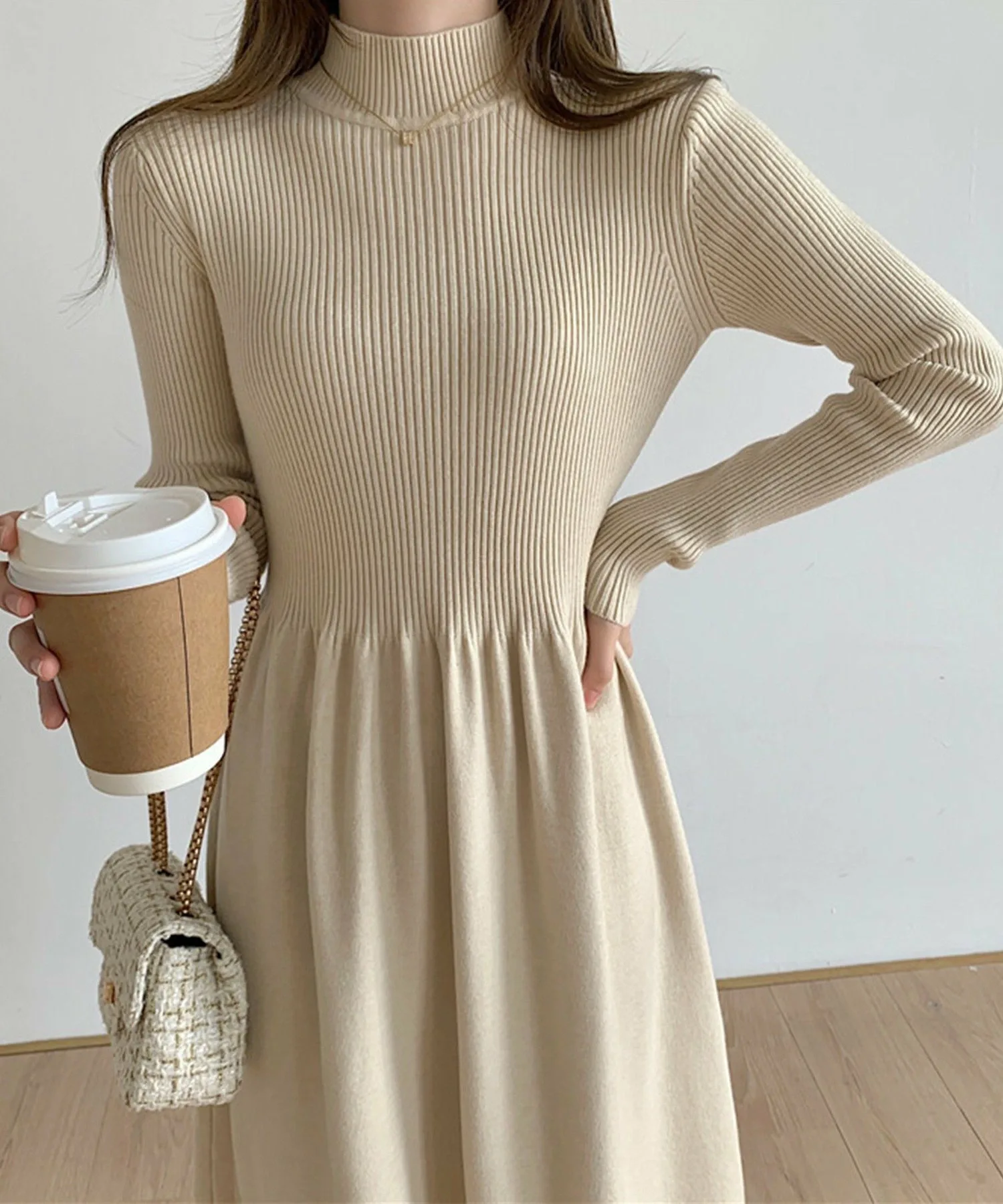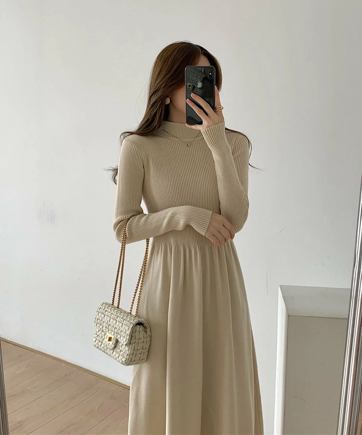 Дизайн: Отличается простым, но элегантным дизайном. Верхняя часть выполнена в рубчик для плотной посадки, а линия талии естественным образом подчеркивает ее, в то время как юбка имеет умеренный расклешенный низ для изящного образа. Сдержанный воротник-стойка создает утонченный вид.