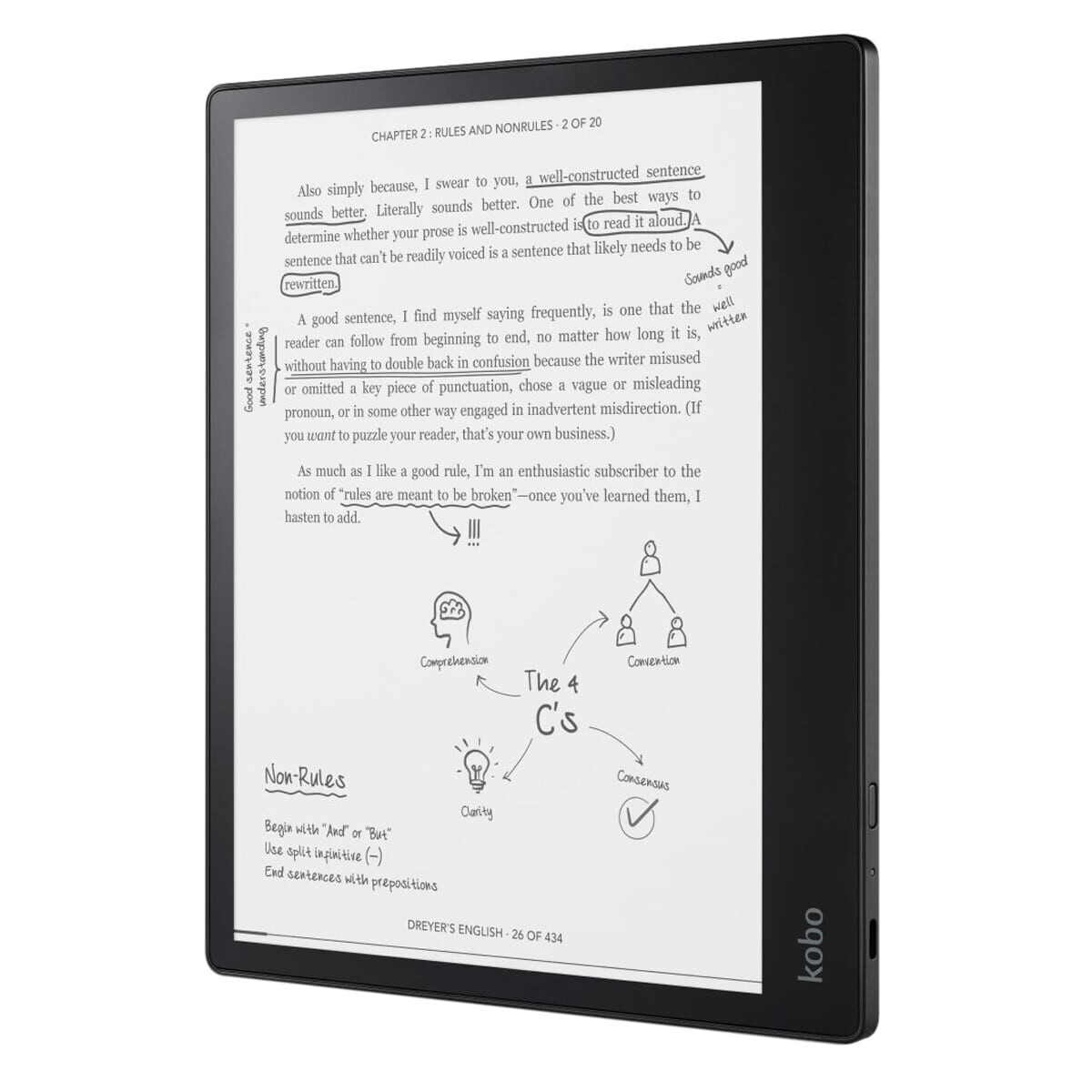 За быстродействие Rakuten Kobo Elipsa отвечает 4-х ядерный процессор с тактовой частотой 1,8 ГГц. В комплект входят обложка и цифровое перо. Умный чехол Kobo Elipsa SleepCover может служить подставкой, а также отправляет книгу в спящий режим, когда вы ее закрываете. Чехол соединен с корпусом ридера магнитным креплением и имеет отсек для хранения стилуса.