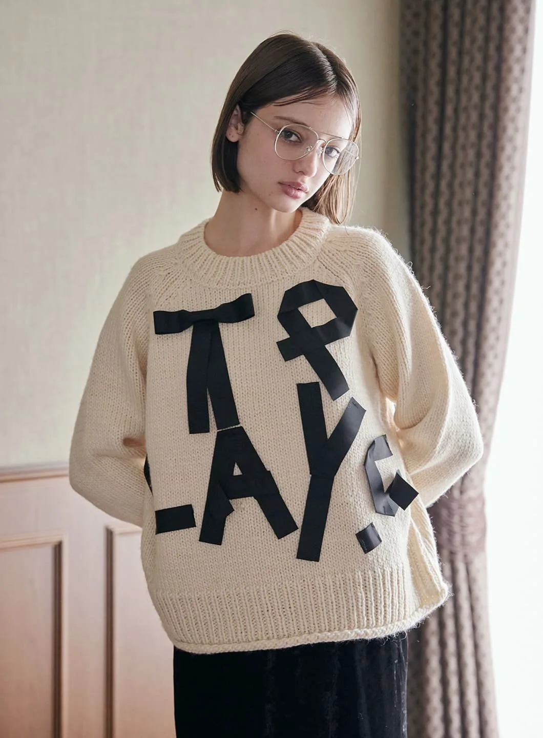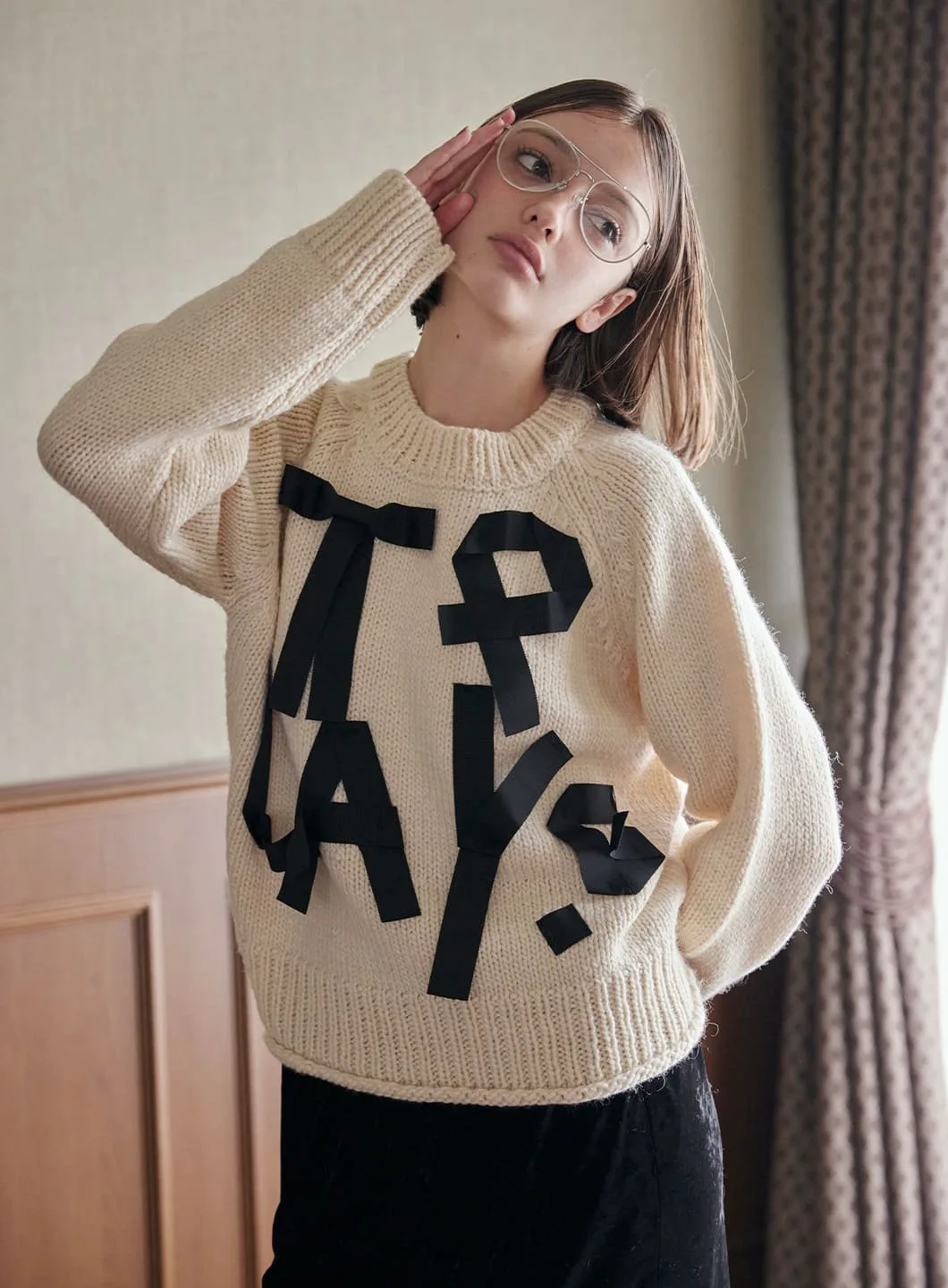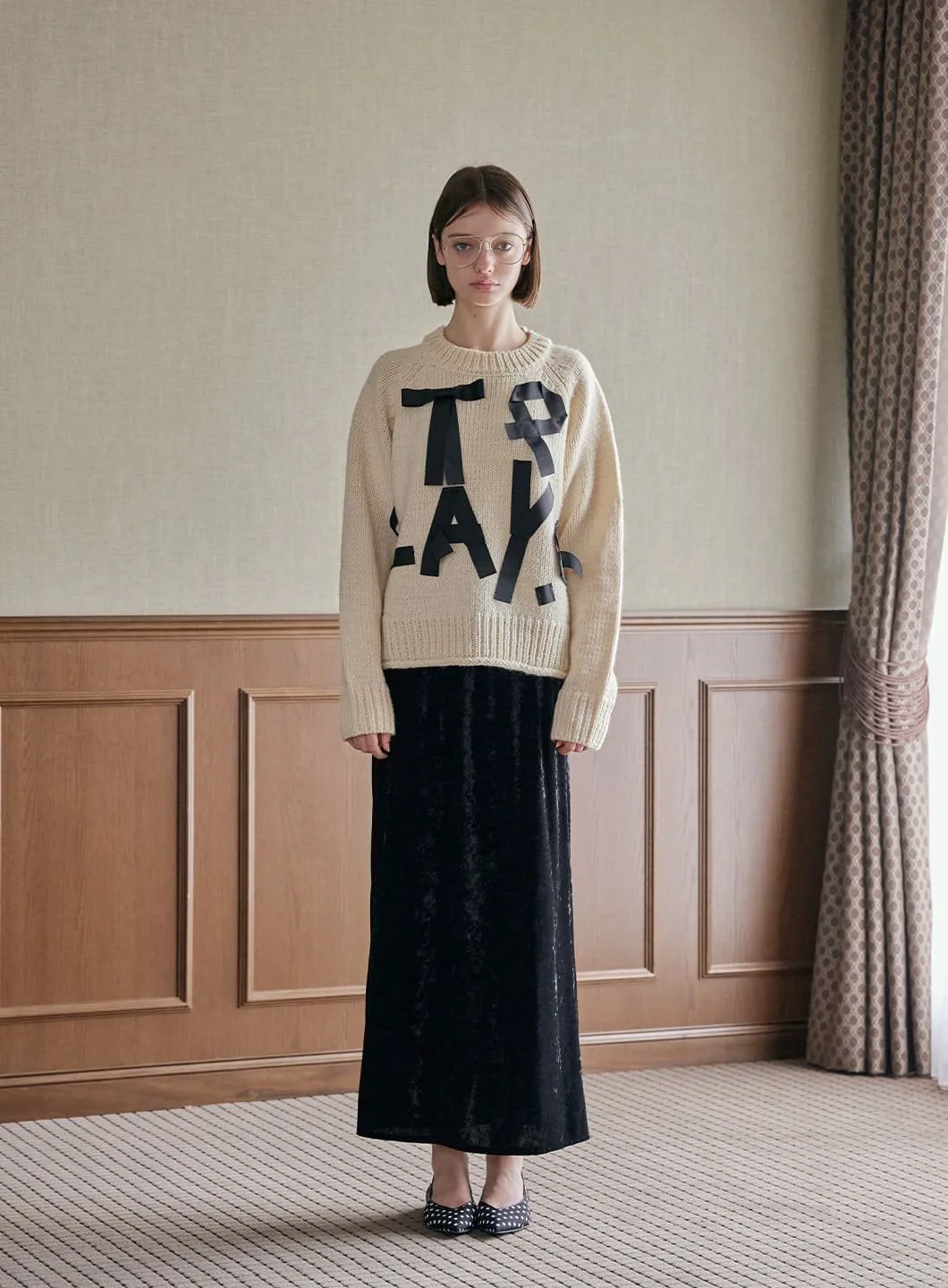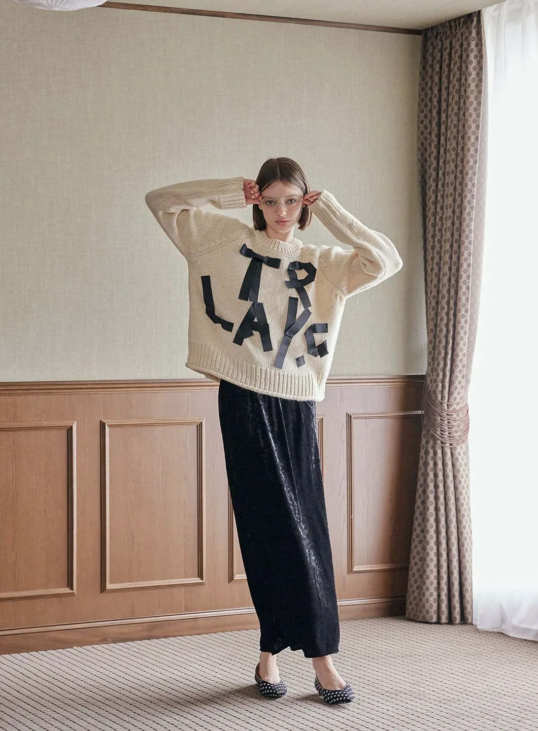 Изысканный вязаный топ с надписью из гросгрейновой ленты, прикрепленный к простому силуэту.