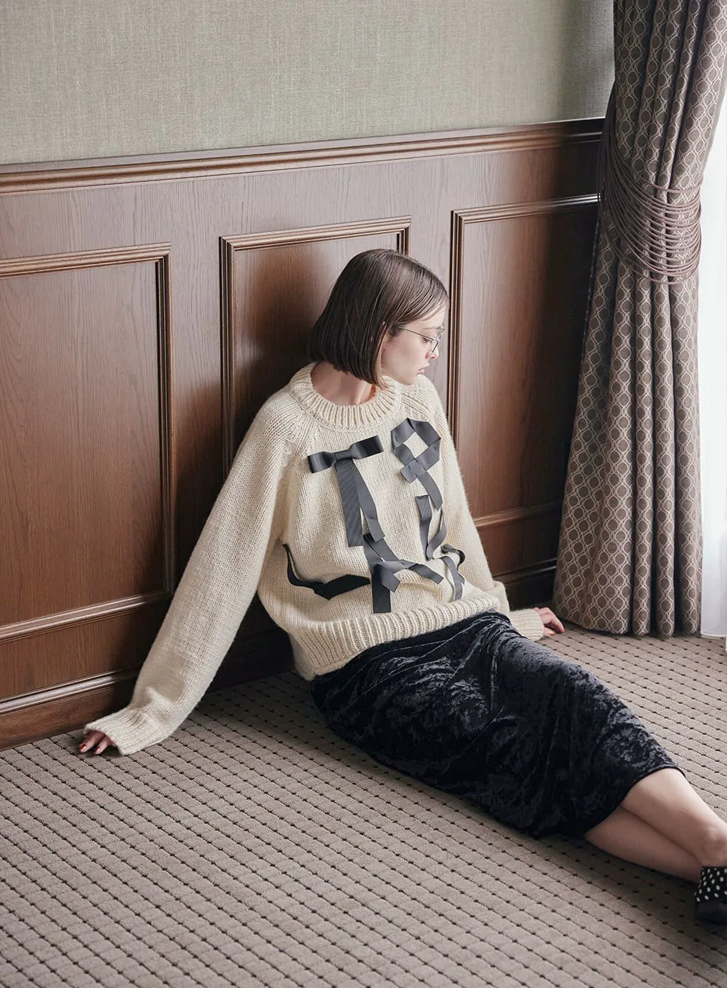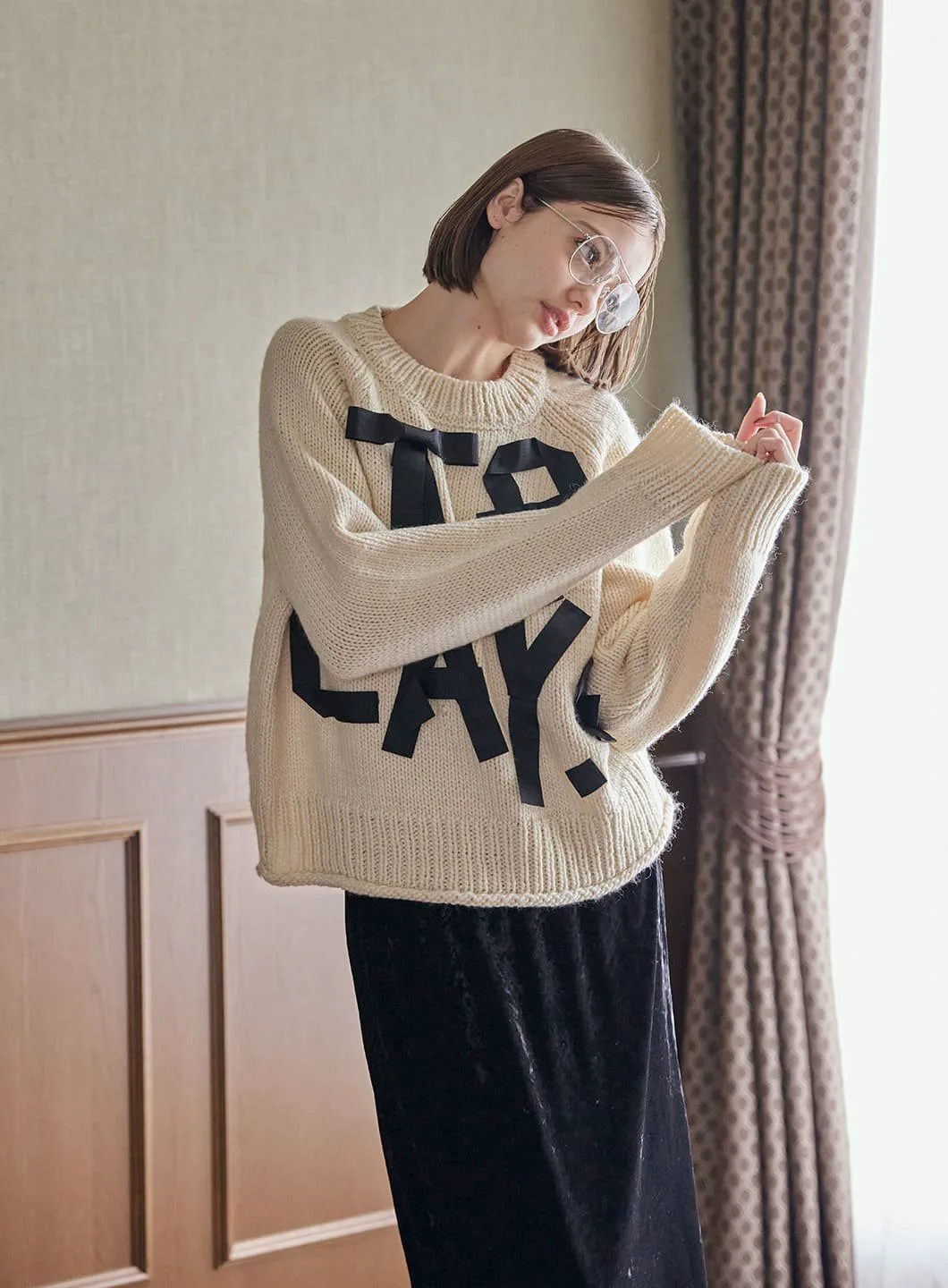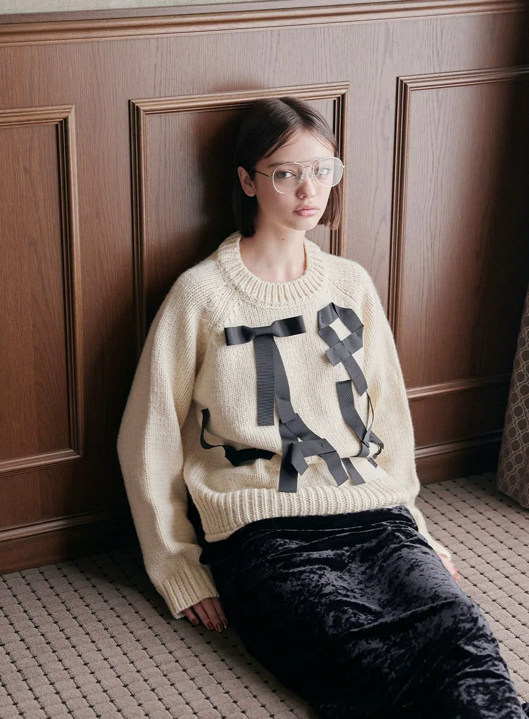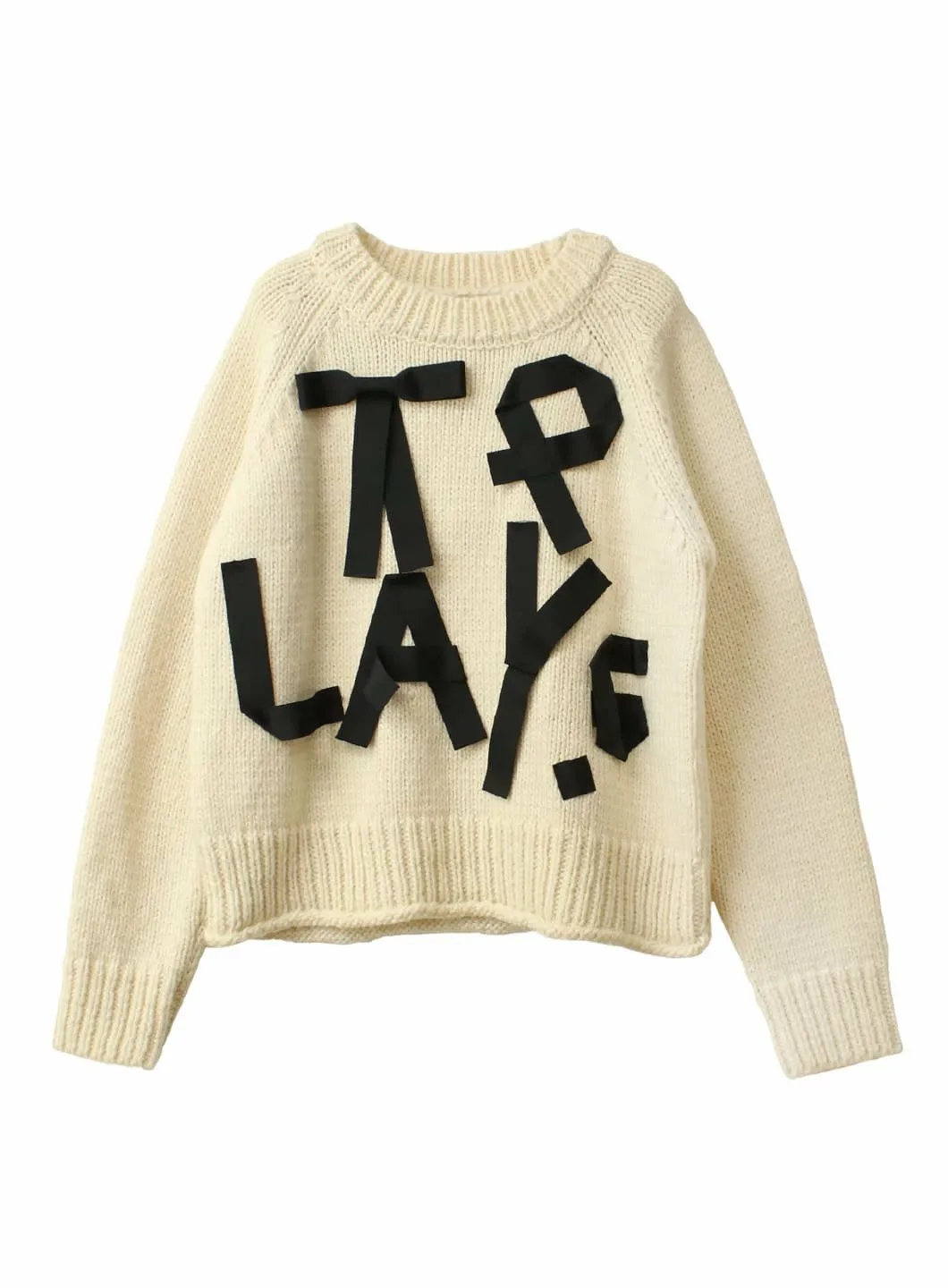 Изысканный вязаный топ с надписью из гросгрейновой ленты, прикрепленный к простому силуэту.