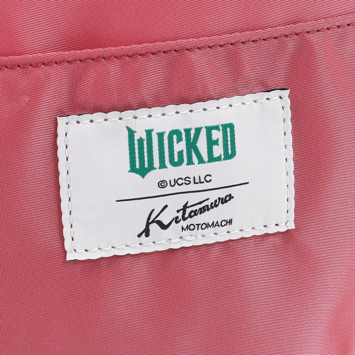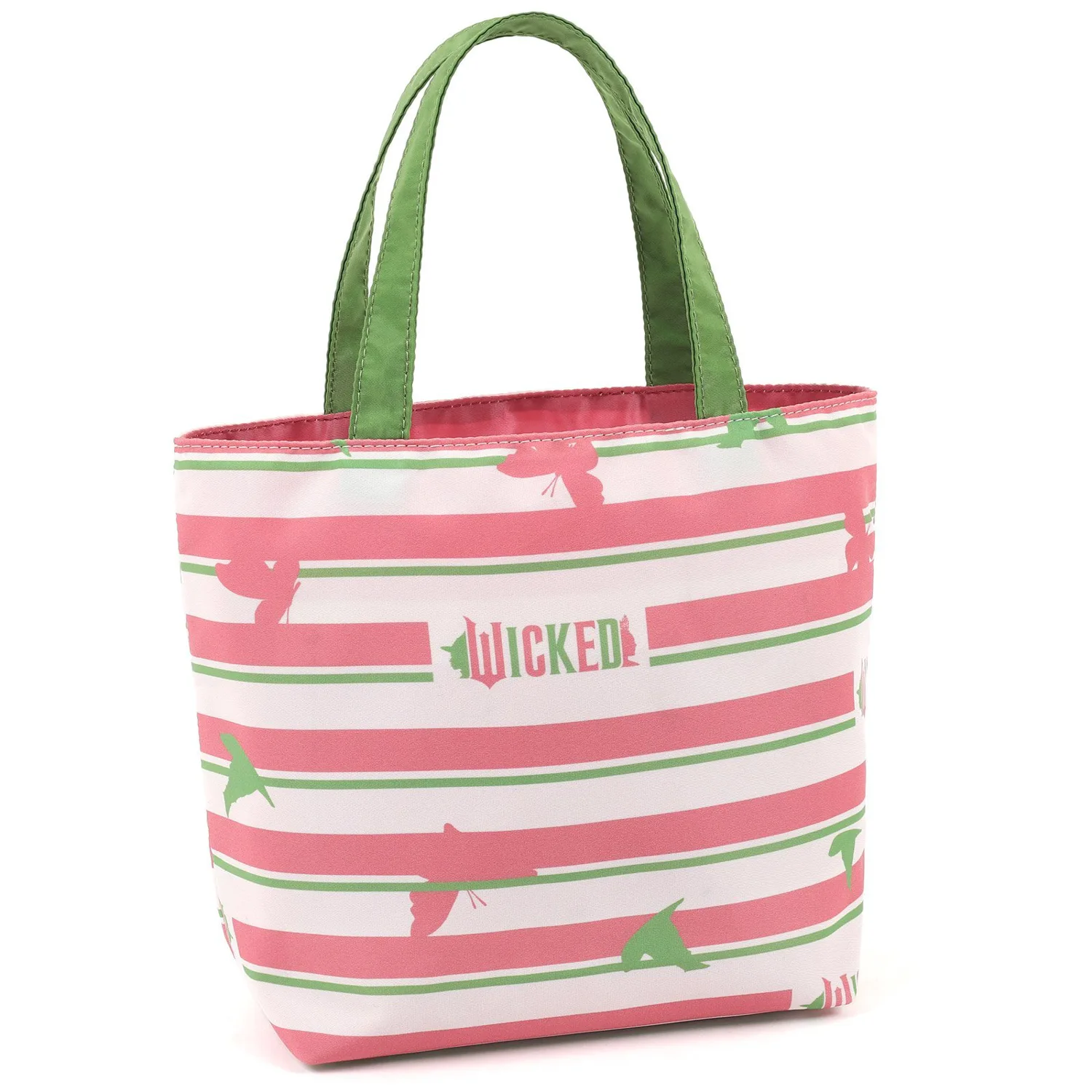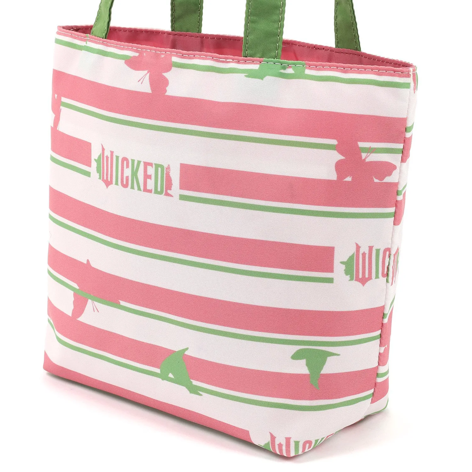 Эта сумочка с многослойным дизайном выполнена в фирменных цветах Глинды и Эльфабы — розовом и зеленом. Она изготовлена из ткани с оригинальным принтом, изображающим силуэты бабочек и шляп. Двубортная бирка "WICKED" и "Kitamura" внутри добавляет особый шарм. Это милая и яркая вещь.