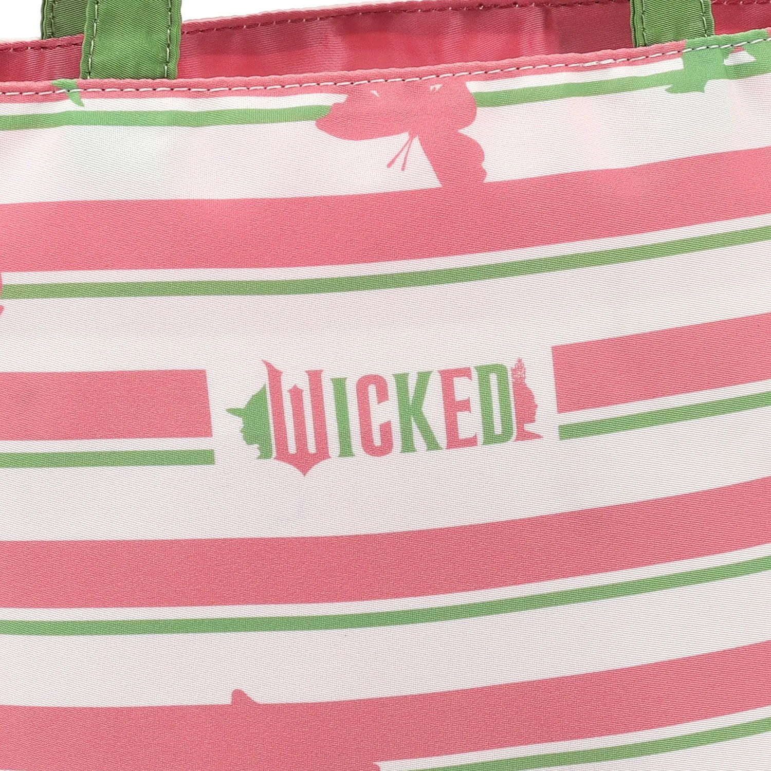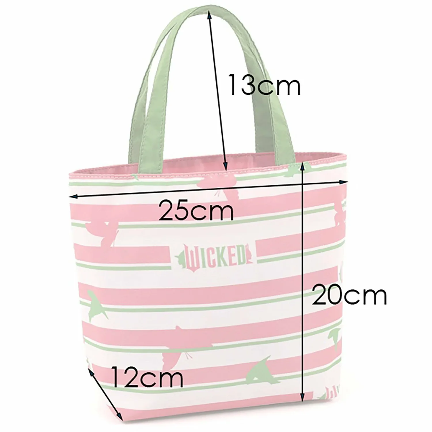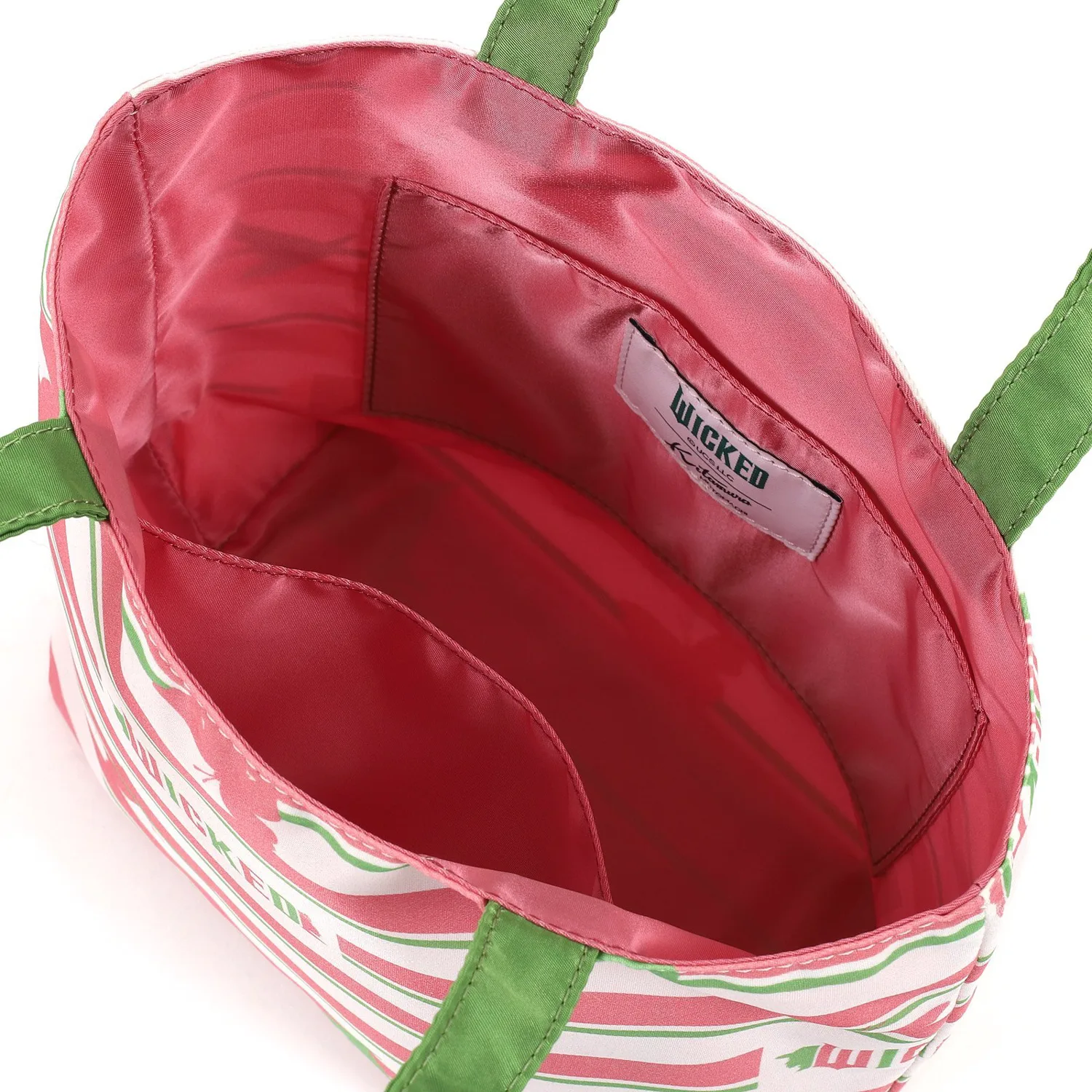 Эта сумочка с многослойным дизайном выполнена в фирменных цветах Глинды и Эльфабы — розовом и зеленом. Она изготовлена из ткани с оригинальным принтом, изображающим силуэты бабочек и шляп. Двубортная бирка "WICKED" и "Kitamura" внутри добавляет особый шарм. Это милая и яркая вещь.