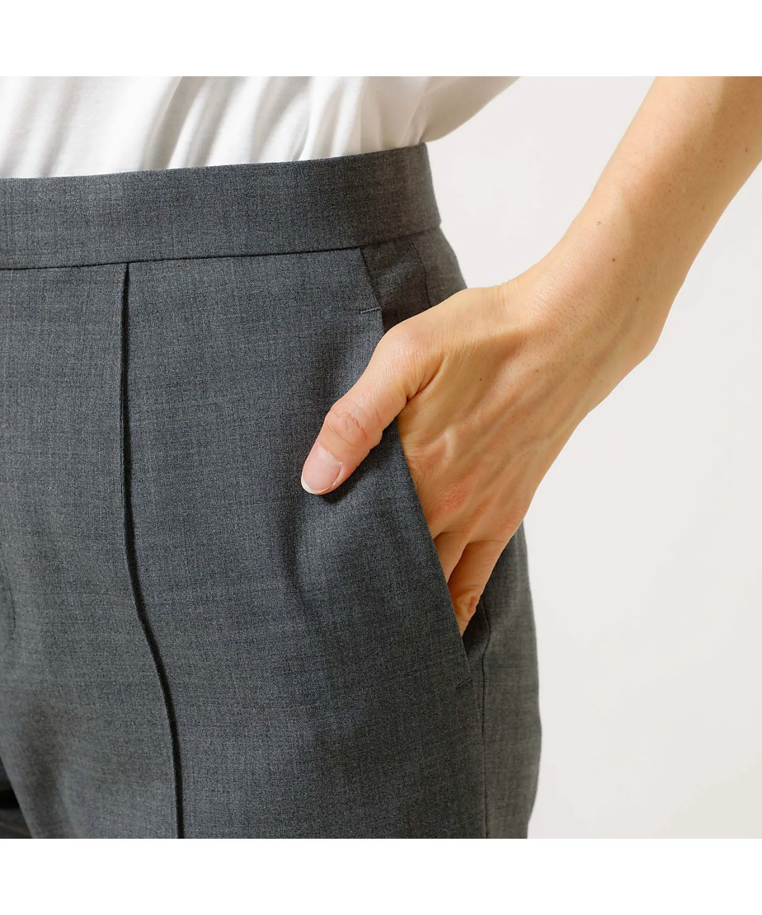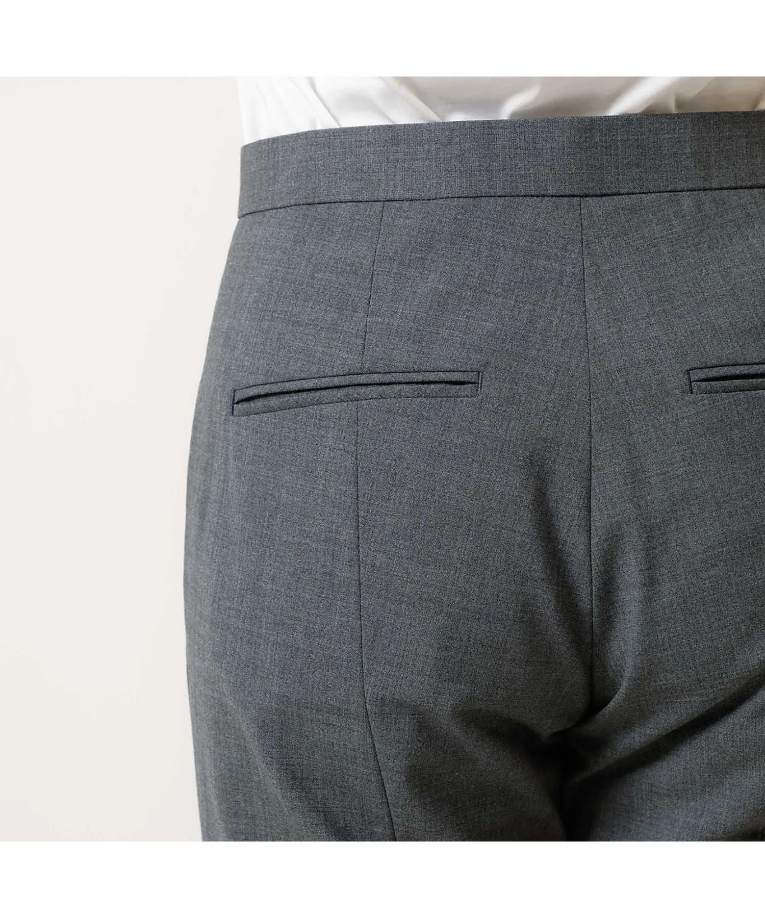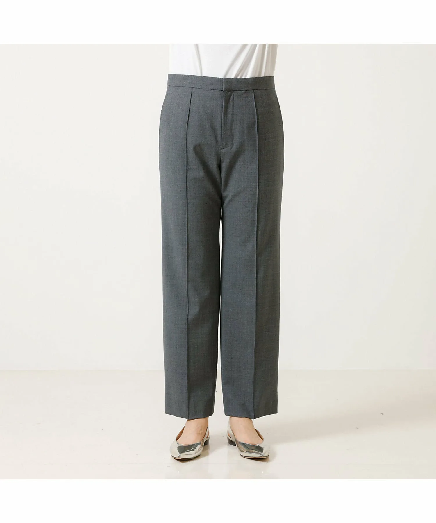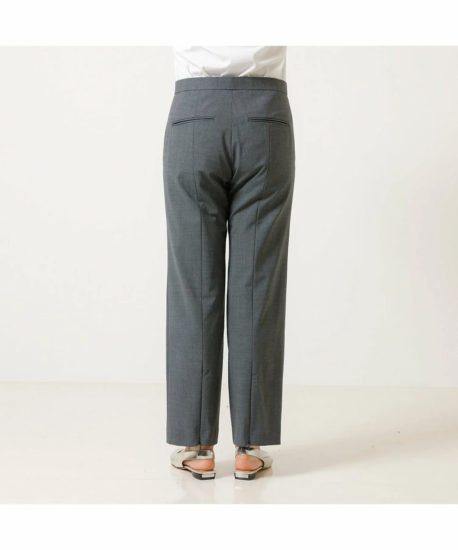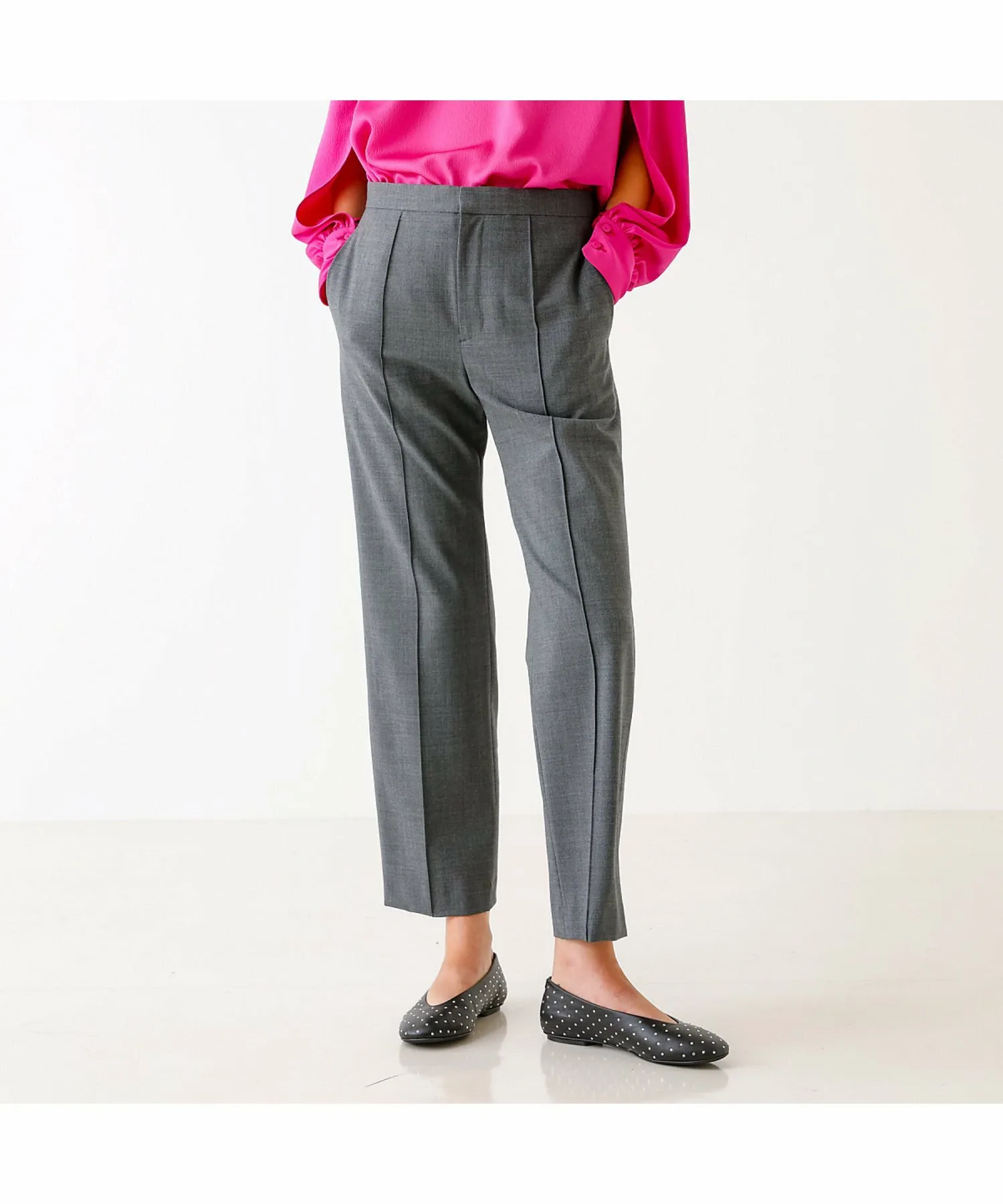 Эти брюки изготовлены из эластичного материала, растягивающегося в двух направлениях, с сухой текстурой, как у шерсти, они гладкие и менее склонны к образованию катышков, что делает их подходящими для длительного ношения. Эти брюки имеют прямой силуэт с центральной складкой, что делает их красивыми и создает иллюзию более длинных ног. Они также эластичны и чрезвычайно удобны в носке. Сделано в Японии.