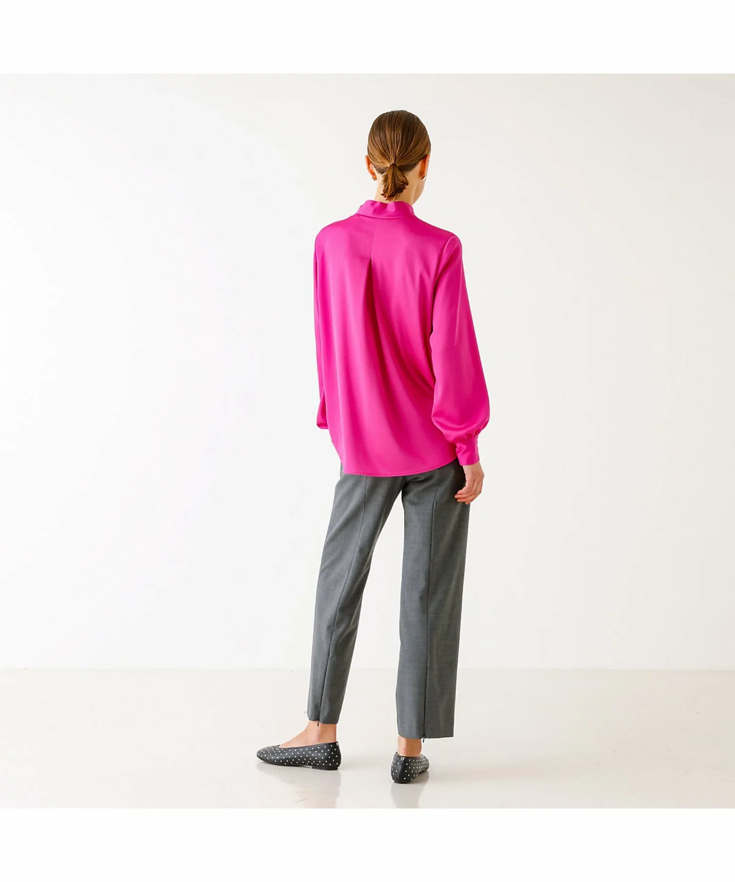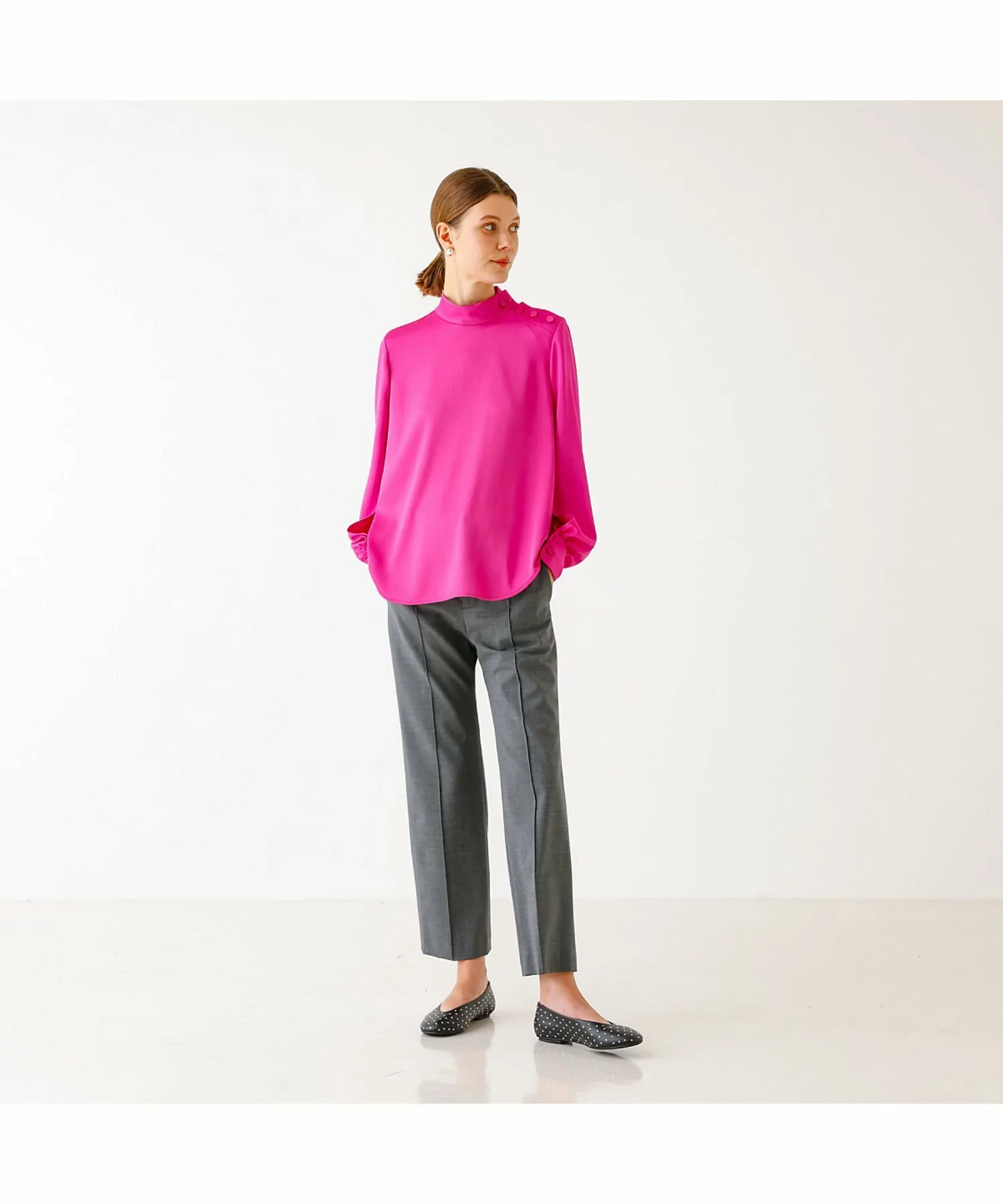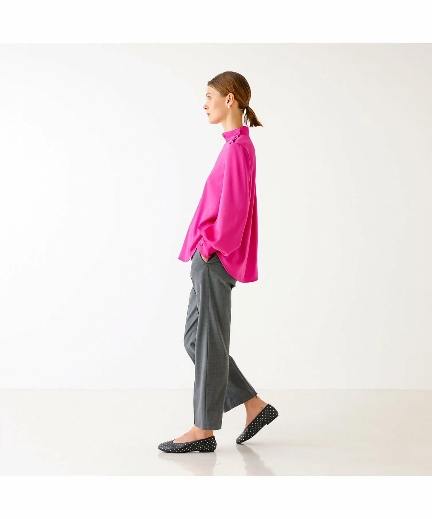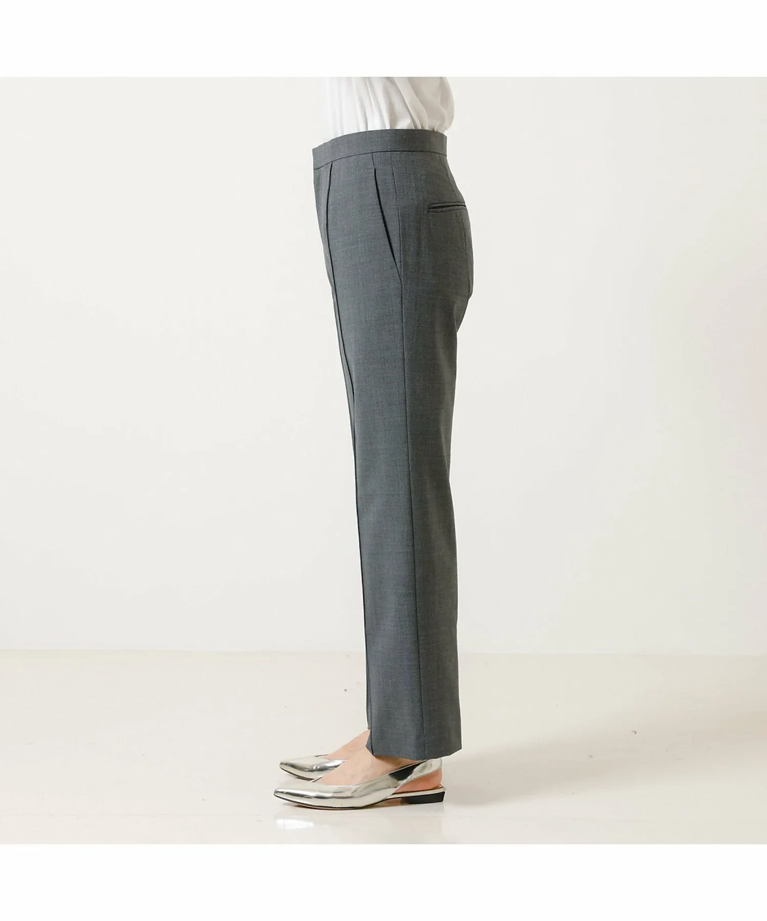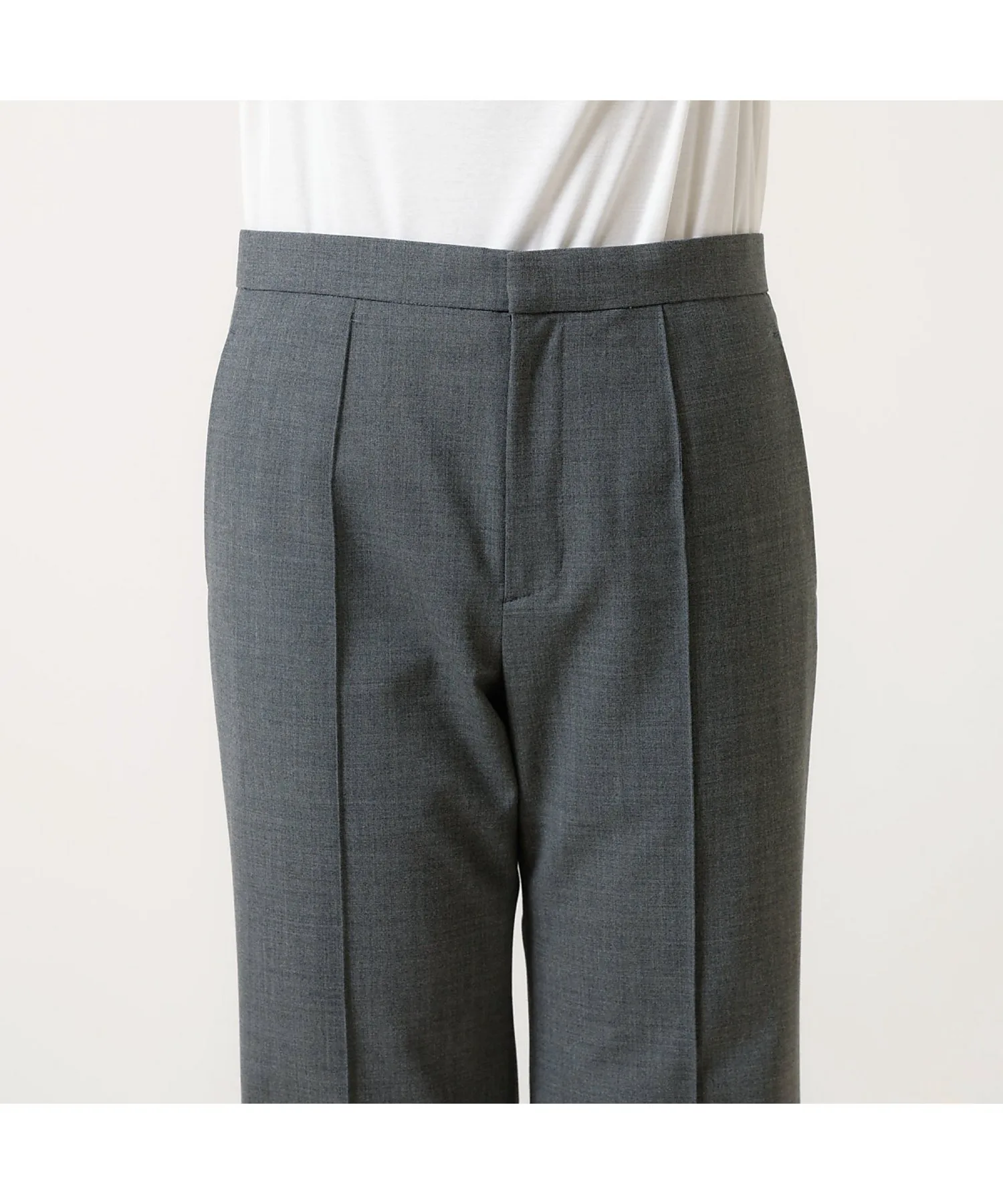 Эти брюки изготовлены из эластичного материала, растягивающегося в двух направлениях, с сухой текстурой, как у шерсти, они гладкие и менее склонны к образованию катышков, что делает их подходящими для длительного ношения. Эти брюки имеют прямой силуэт с центральной складкой, что делает их красивыми и создает иллюзию более длинных ног. Они также эластичны и чрезвычайно удобны в носке. Сделано в Японии.