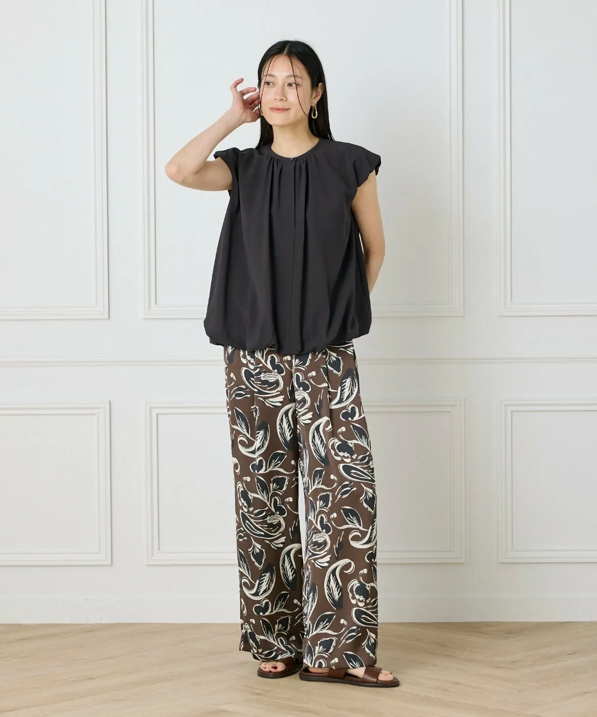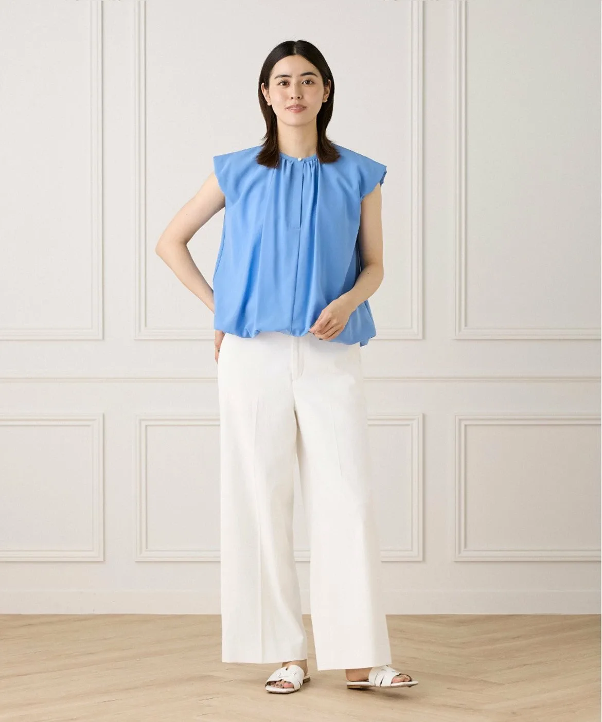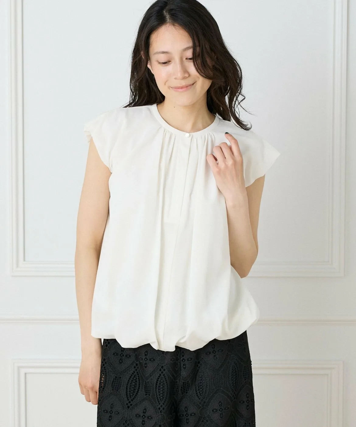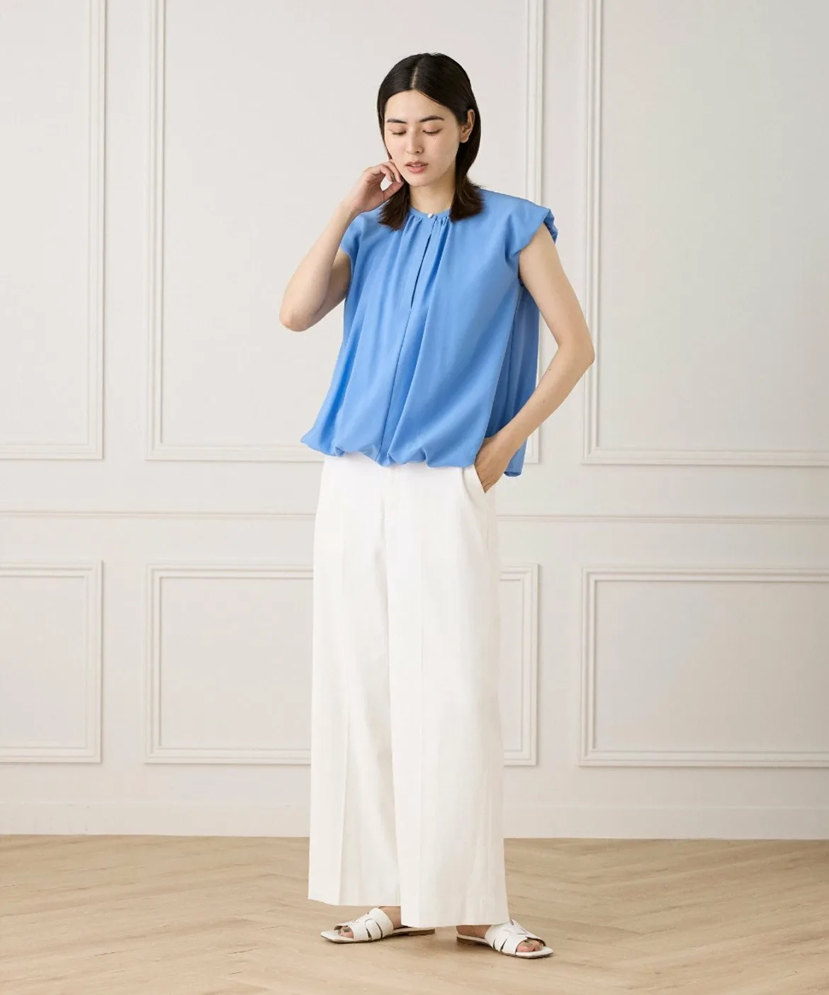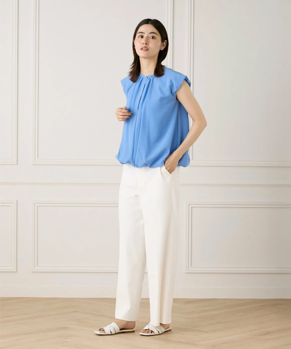 Эта блузка без рукавов отличается эффектным, объемным силуэтом-«баллоном». Простой вырез горловины создает аккуратный образ, а идеальная длина подчеркивает фигуру. Рукава, которые кажутся безрукавными, имеют слегка удлиненную длину, что уменьшает открытость и создает впечатление зрелости. Длина подола и компактный силуэт уравновешивают друг друга, что позволяет сочетать ее с различными стилями, от повседневного до современного.