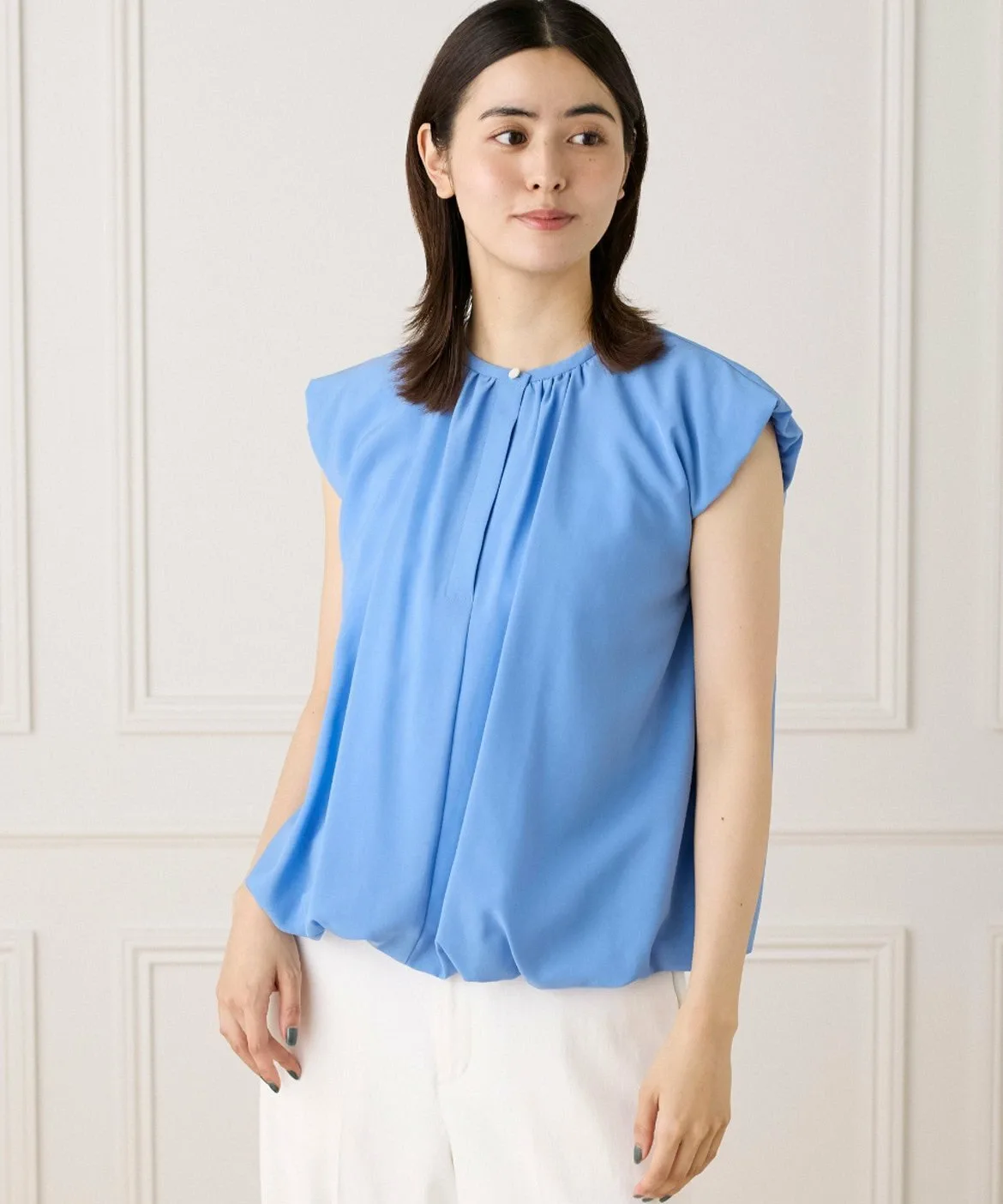 Эта блузка без рукавов отличается эффектным, объемным силуэтом-«баллоном». Простой вырез горловины создает аккуратный образ, а идеальная длина подчеркивает фигуру. Рукава, которые кажутся безрукавными, имеют слегка удлиненную длину, что уменьшает открытость и создает впечатление зрелости. Длина подола и компактный силуэт уравновешивают друг друга, что позволяет сочетать ее с различными стилями, от повседневного до современного.