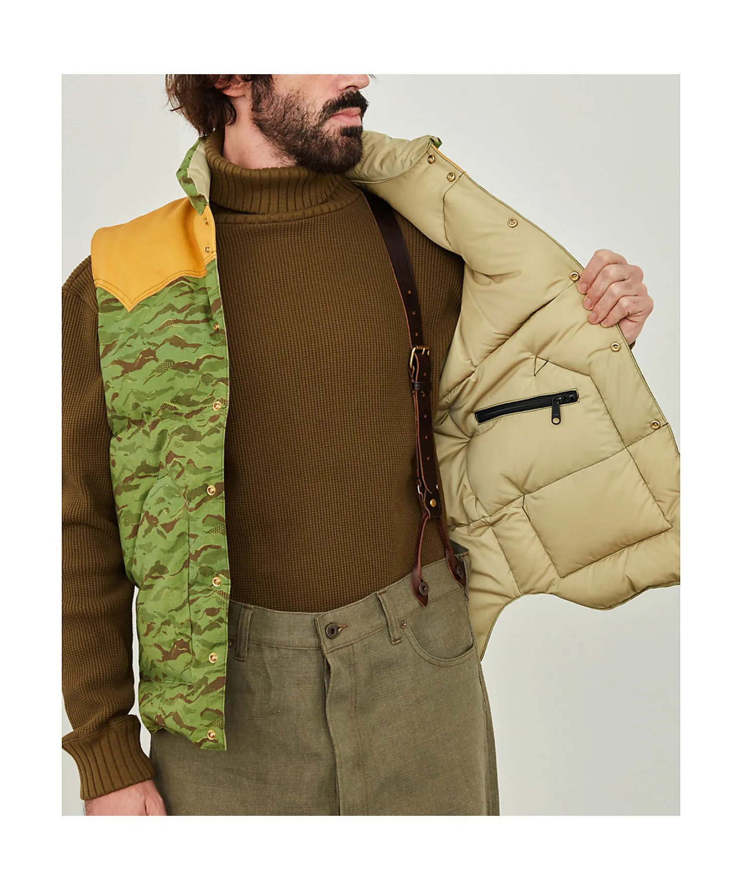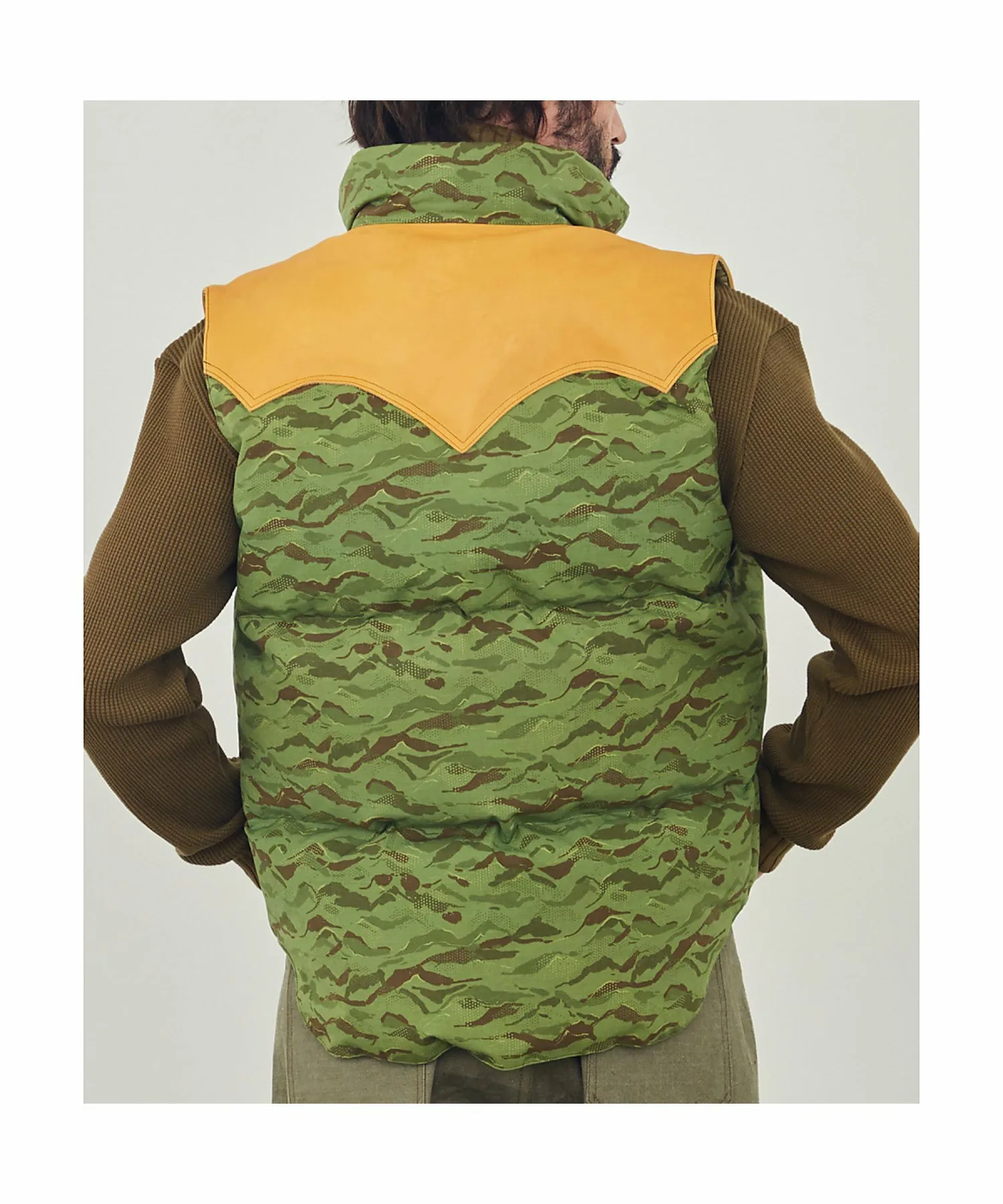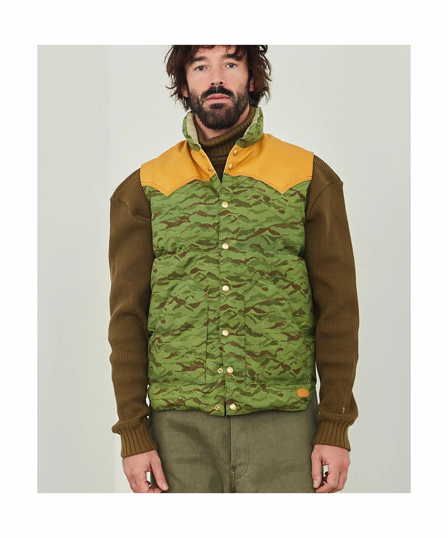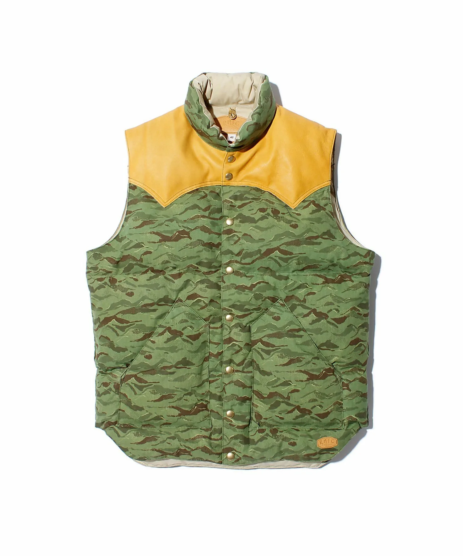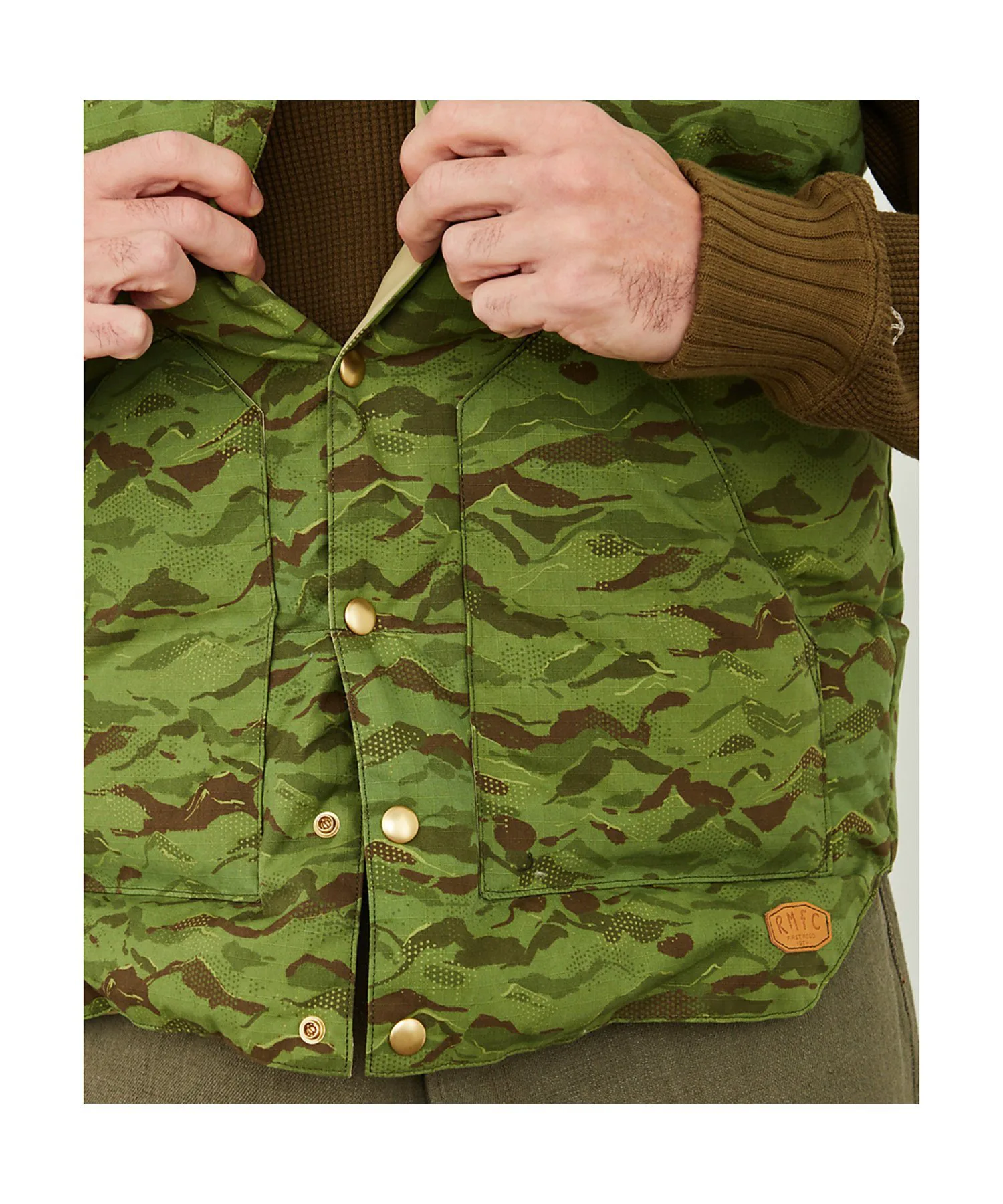 Культовый пуховый жилет Rocky Mountain Featherbed отличается фирменной цельной кожаной кокеткой RMFC, окрашенной дубильными веществами и хромом. Дубильные вещества сохраняют естественную текстуру кожи, а хром повышает износостойкость. Рисунок «Горный камуфляж» нанесен цифровым способом на гибридную хлопчатобумажную ткань Harry Stevensons. Этот пуховый жилет обеспечивает превосходную теплоизоляцию, состоя на 90% из пуха и на 10% из перьев, с показателем упругости 700. Пух поставляется из Европы и обработан водоотталкивающим покрытием. В то время как пух обычно теряет свои теплоизоляционные свойства во влажном состоянии, водоотталкивающая обработка позволяет ему сохранять свои теплоизоляционные свойства даже в ненастную погоду.