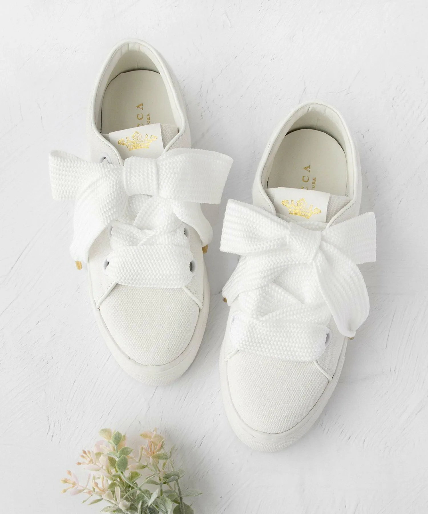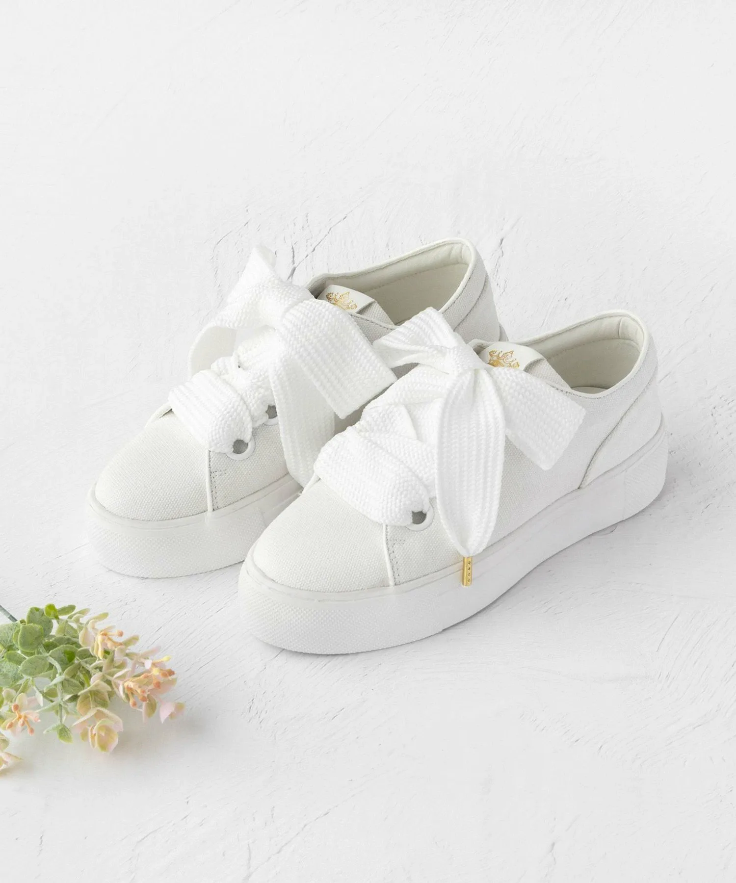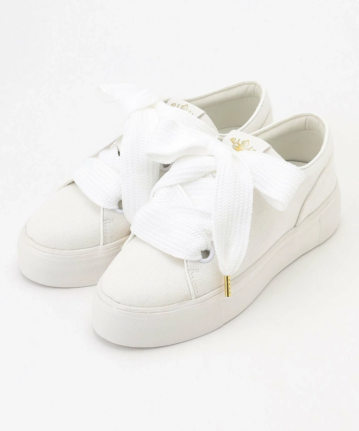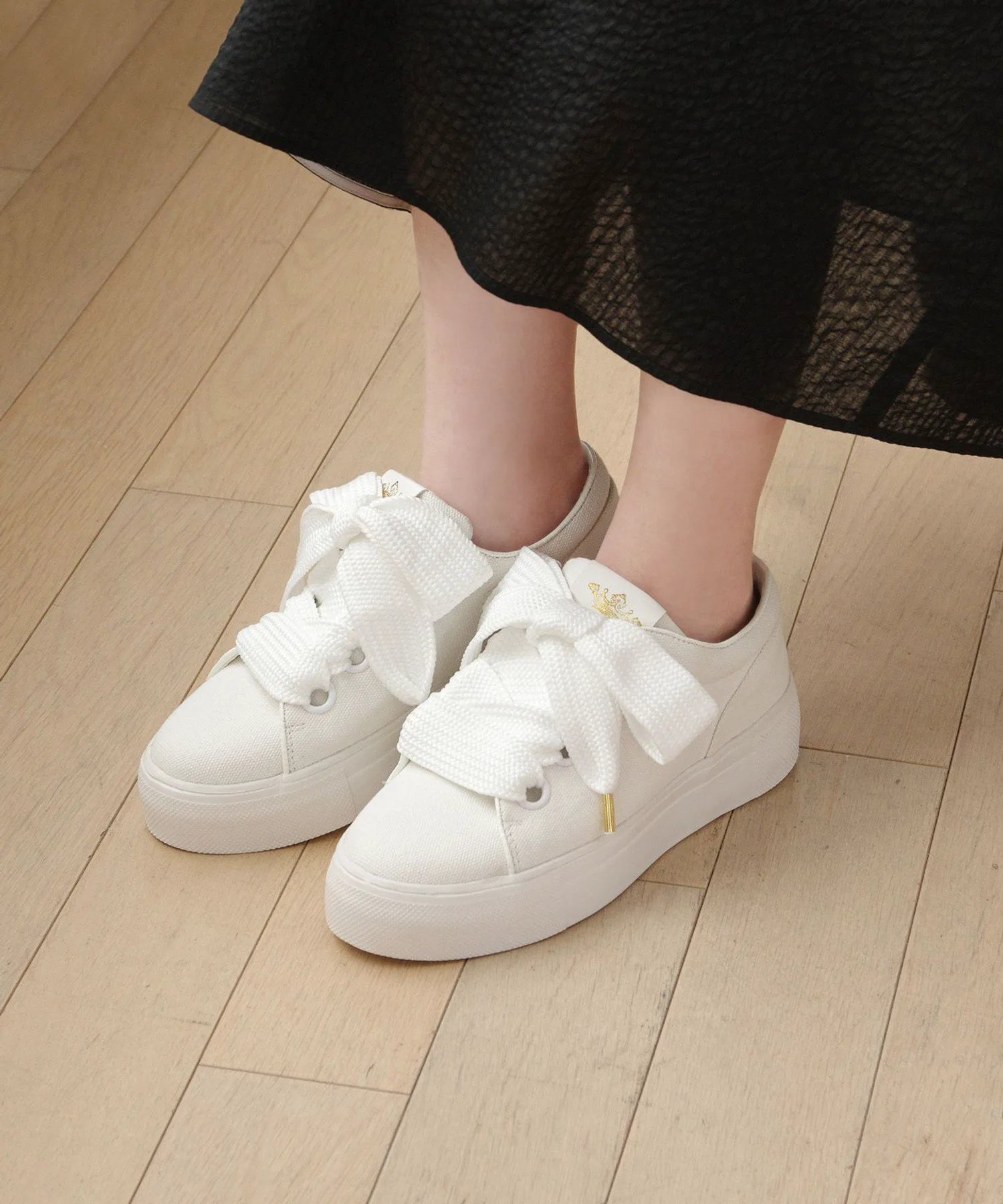 Базовые кеды из парусины с широкими шнурками. Просто завязав шнурки, вы получите подобие большой ленты, что придает простому дизайну более нежный вид. Легкие, но с платформенной подошвой высотой 4 см, они также подчеркнут ваш стиль. Логотип в виде короны из золотой фольги на язычке добавляет акцент. Они хорошо сочетаются с женственными вещами, такими как красивые платья, а также с простой футболкой и джинсами.