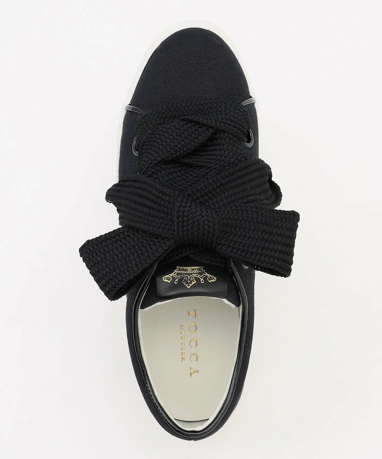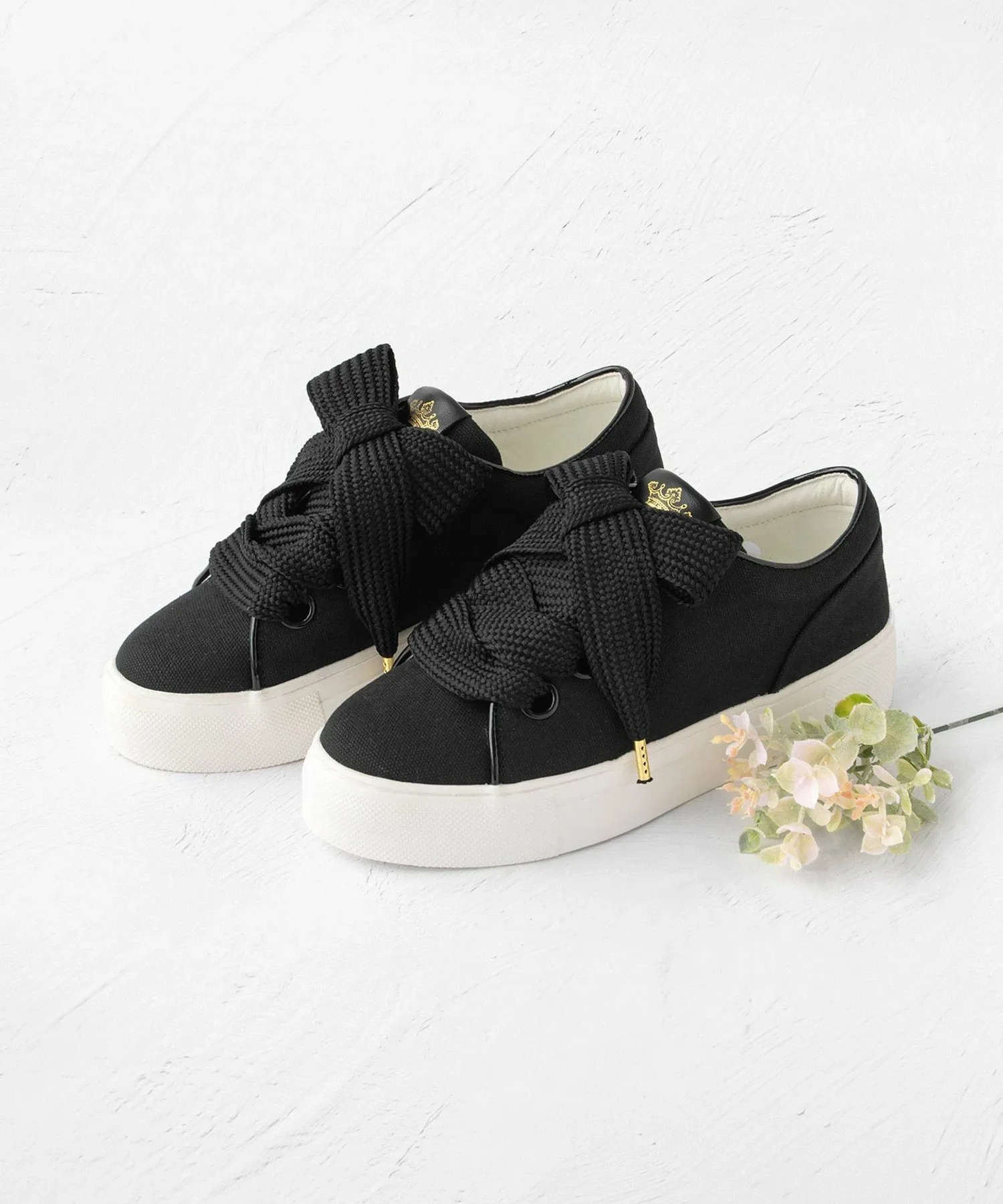 Базовые кеды из парусины с широкими шнурками. Просто завязав шнурки, вы получите подобие большой ленты, что придает простому дизайну более нежный вид. Легкие, но с платформенной подошвой высотой 4 см, они также подчеркнут ваш стиль. Логотип в виде короны из золотой фольги на язычке добавляет акцент. Они хорошо сочетаются с женственными вещами, такими как красивые платья, а также с простой футболкой и джинсами.