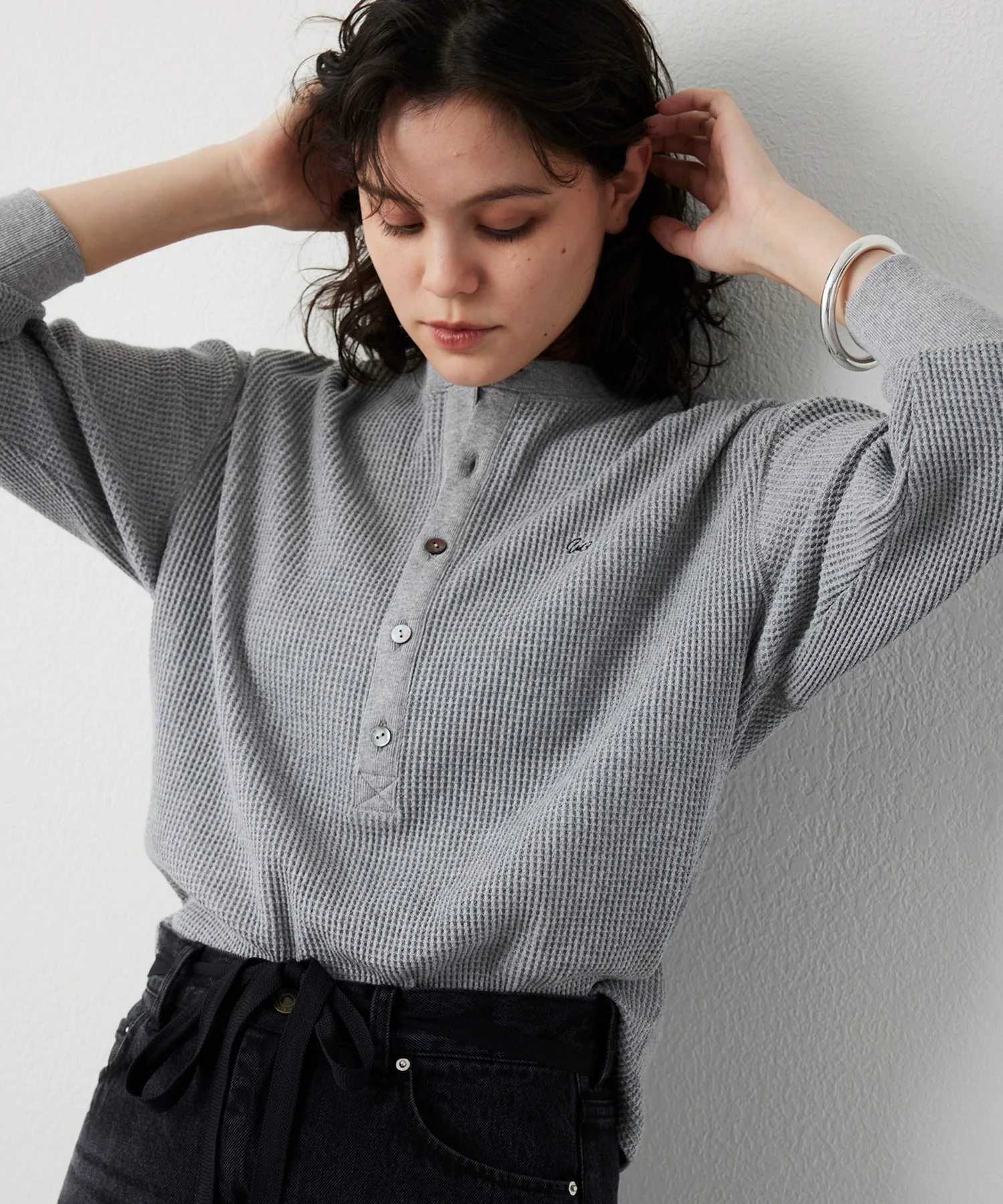 Пуловер с воротником-стойкой и вафельной текстурой ткани в качестве центрального элемента.