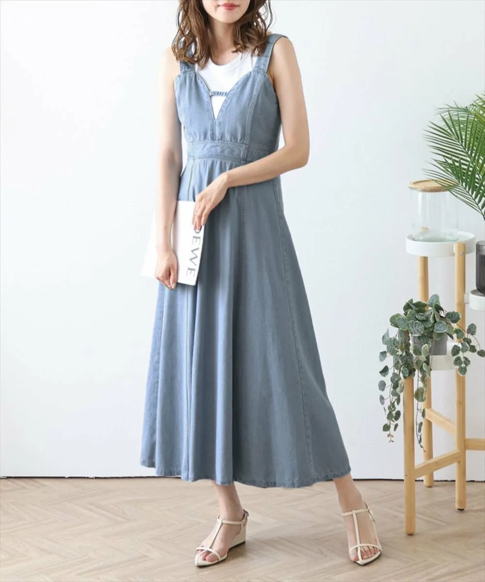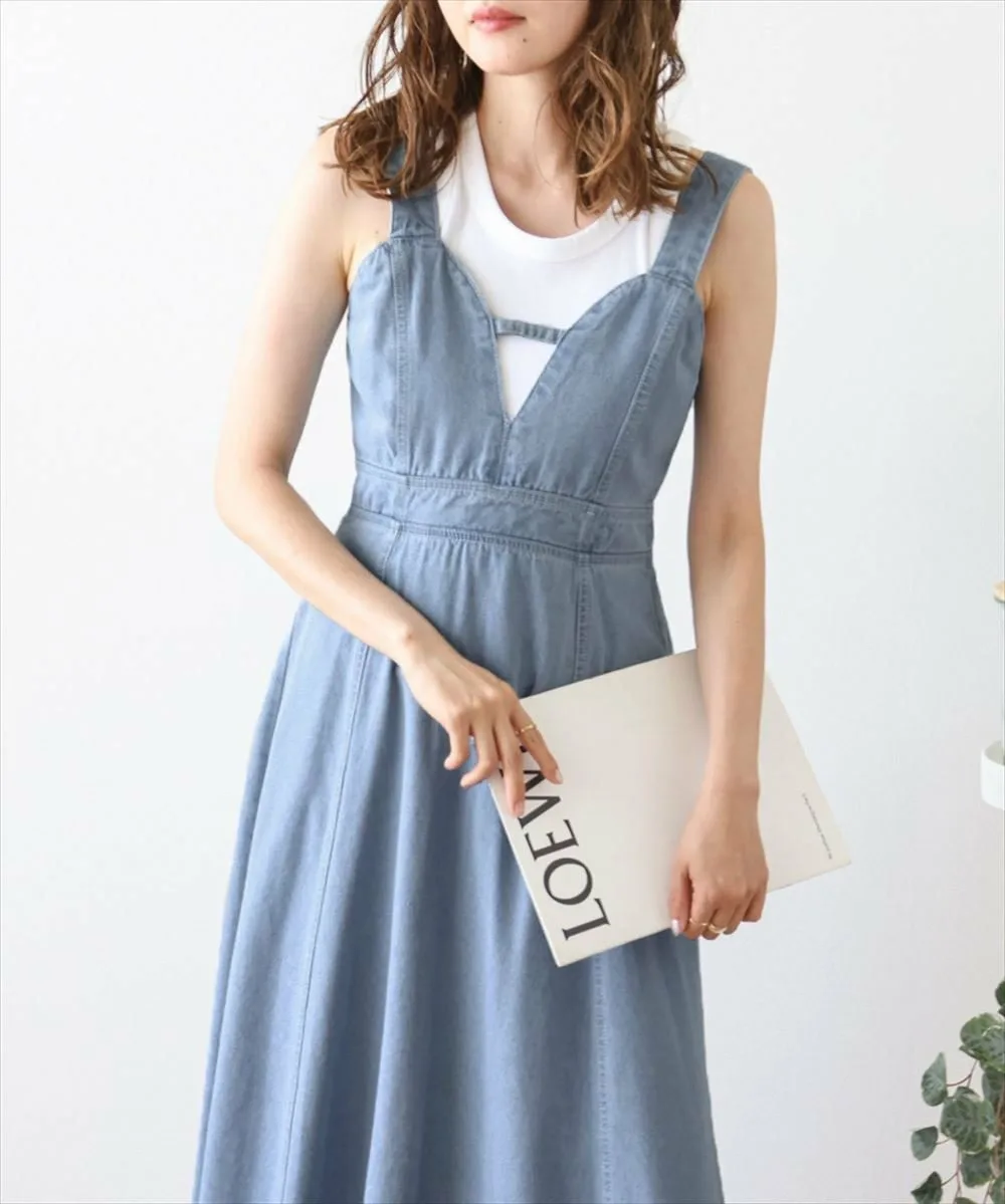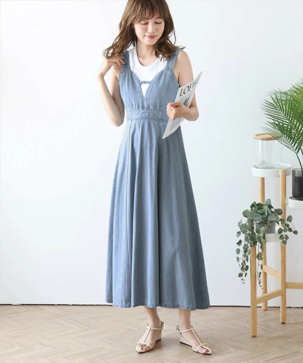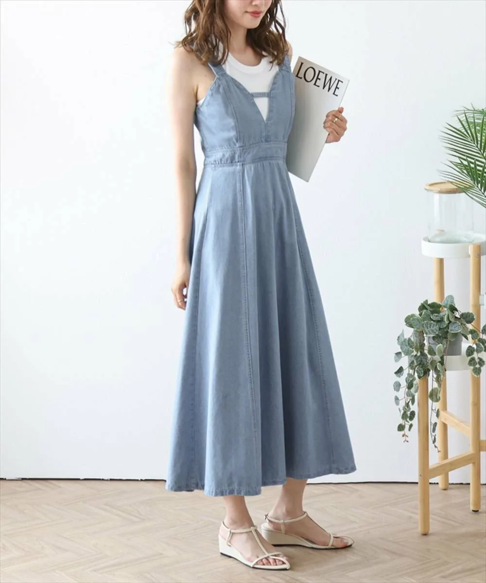 Джинсовое расклешенное платье, создающее утонченное и современное впечатление. Модный дизайн бюстье выглядит современно и женственно, а расклешенная юбка и джинсовая ткань создают изысканный повседневный стиль. Оно мило смотрится само по себе или в сочетании с футболкой или прозрачной блузкой. Эффект стройности: высокая талия и слегка расклешенный силуэт создают женственный, элегантный образ с четко очерченной линией талии. Даже спинка выглядит мило и изысканно. Эластичная сборка и молния на спине обеспечивают плотное прилегание и гладкий силуэт, а также свободную посадку. *Застежка-молния сзади в комплекте. Ткань: Мягкая, умеренно плотная джинсовая ткань. Приятная на ощупь, подходит для всех сезонов.