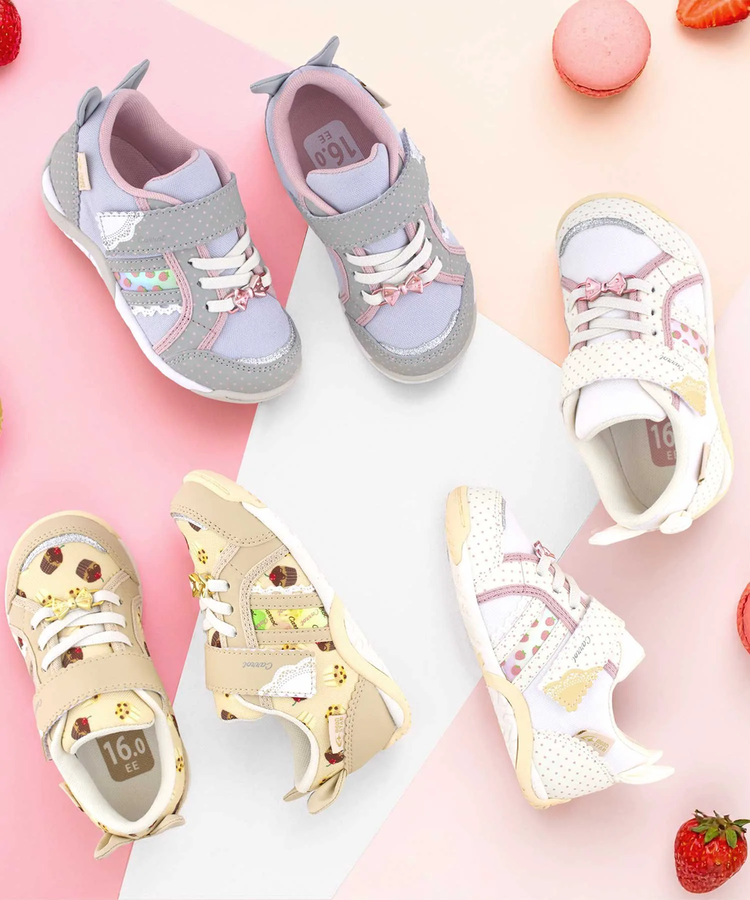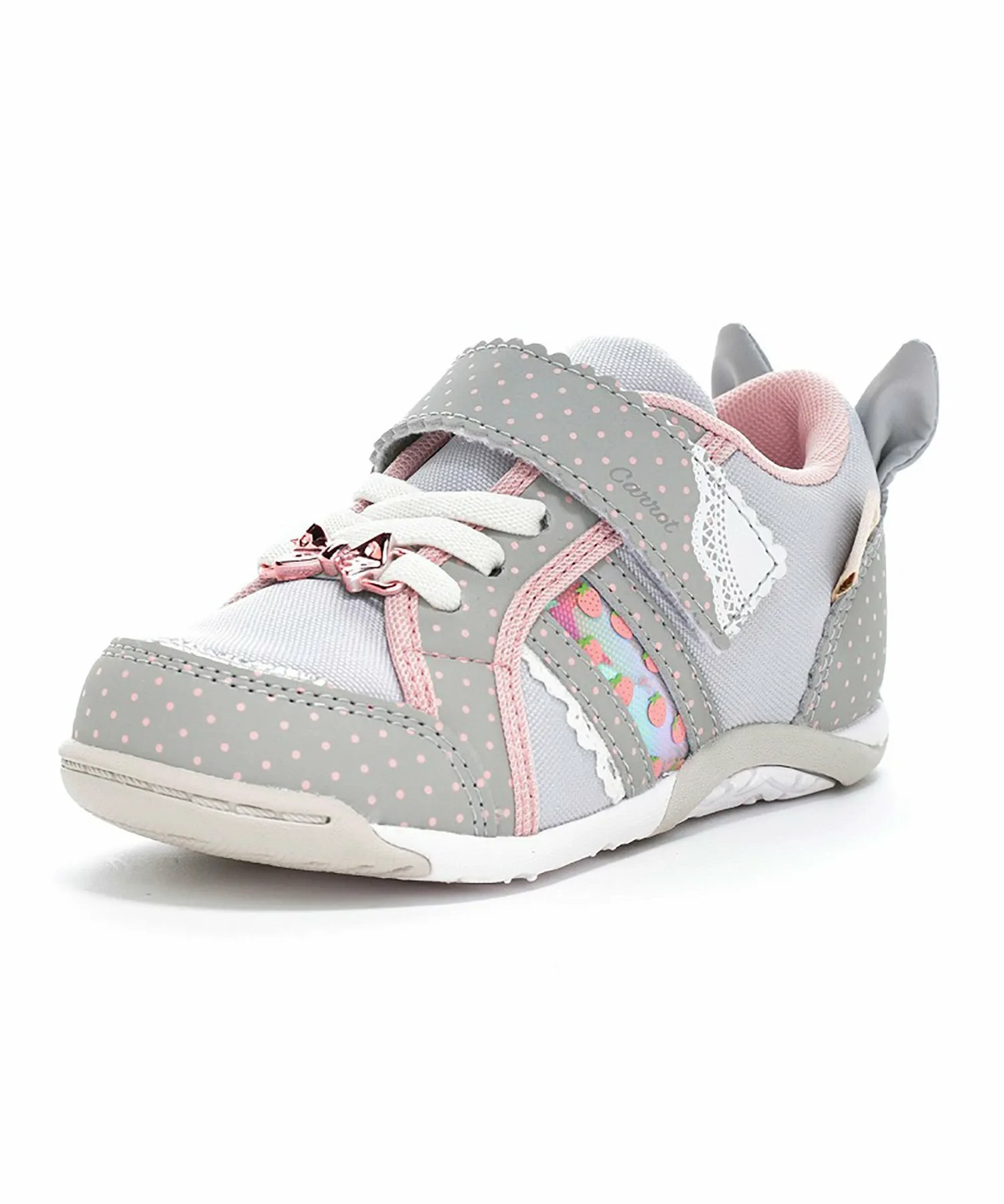 Эти детские туфли "Kinarinoco" от Moonstar Carrot, бренда функциональной обуви, созданного на основе идеи "все полезно для детских ножек", имеют дизайн в виде ремешка для удобства надевания и снимания. Тема этого сезона, идеально подходящая для повседневных прогулок, — "фика", скандинавская традиция отдыха и перекуса. Особое внимание привлекают принт с клубникой и заячьи ушки на пятке. Четыре особенности (просторный носок, задник, гибкий сустав и моющаяся стелька) способствуют здоровому развитию стопы и правильному росту. Стелька имеет "зону определения размера" для удобства подбора размера. Каждая туфля весит приблизительно 120 г для размера 16,0 см.