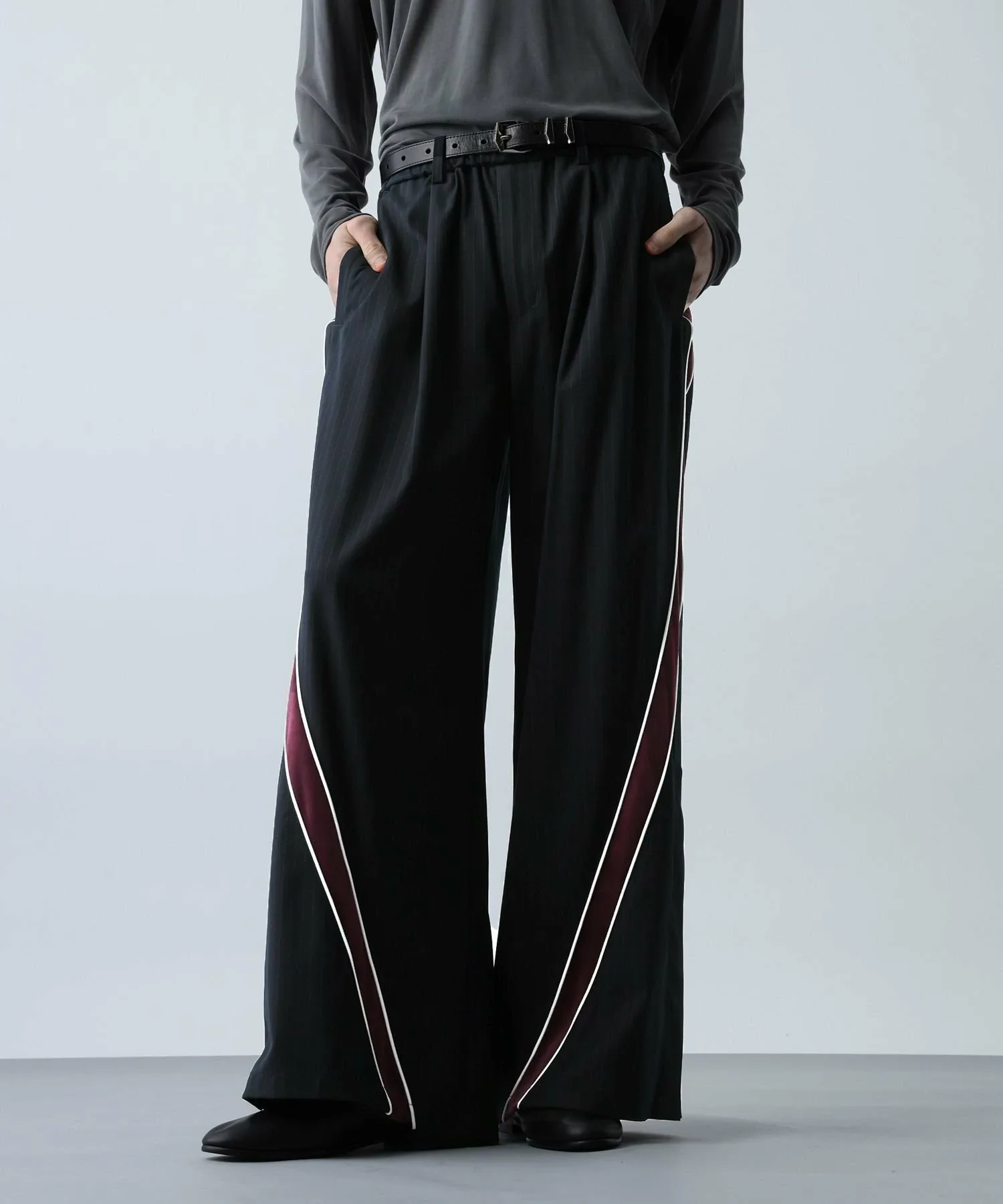 На основе изысканной ткани в тонкую полоску, эти уникальные брюки отличаются привлекательными бархатистыми переливами по бокам.