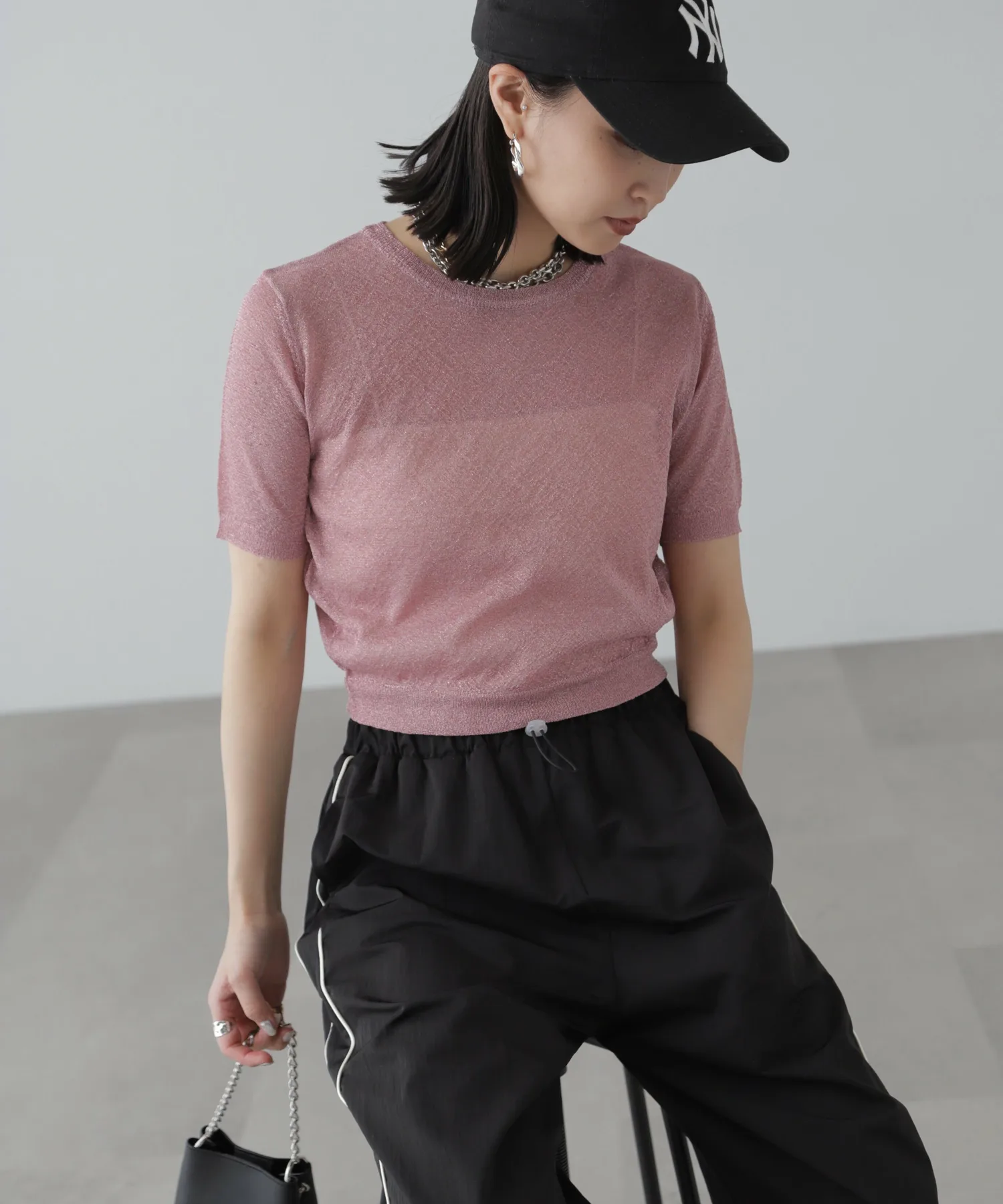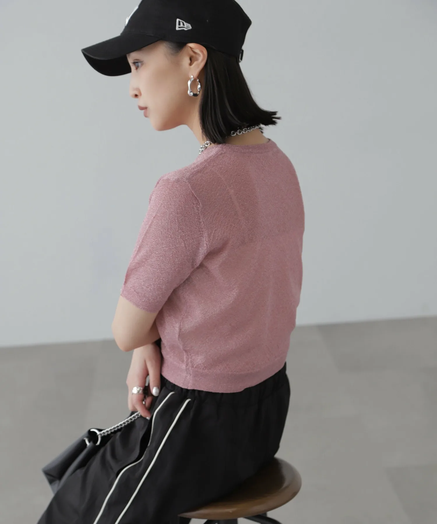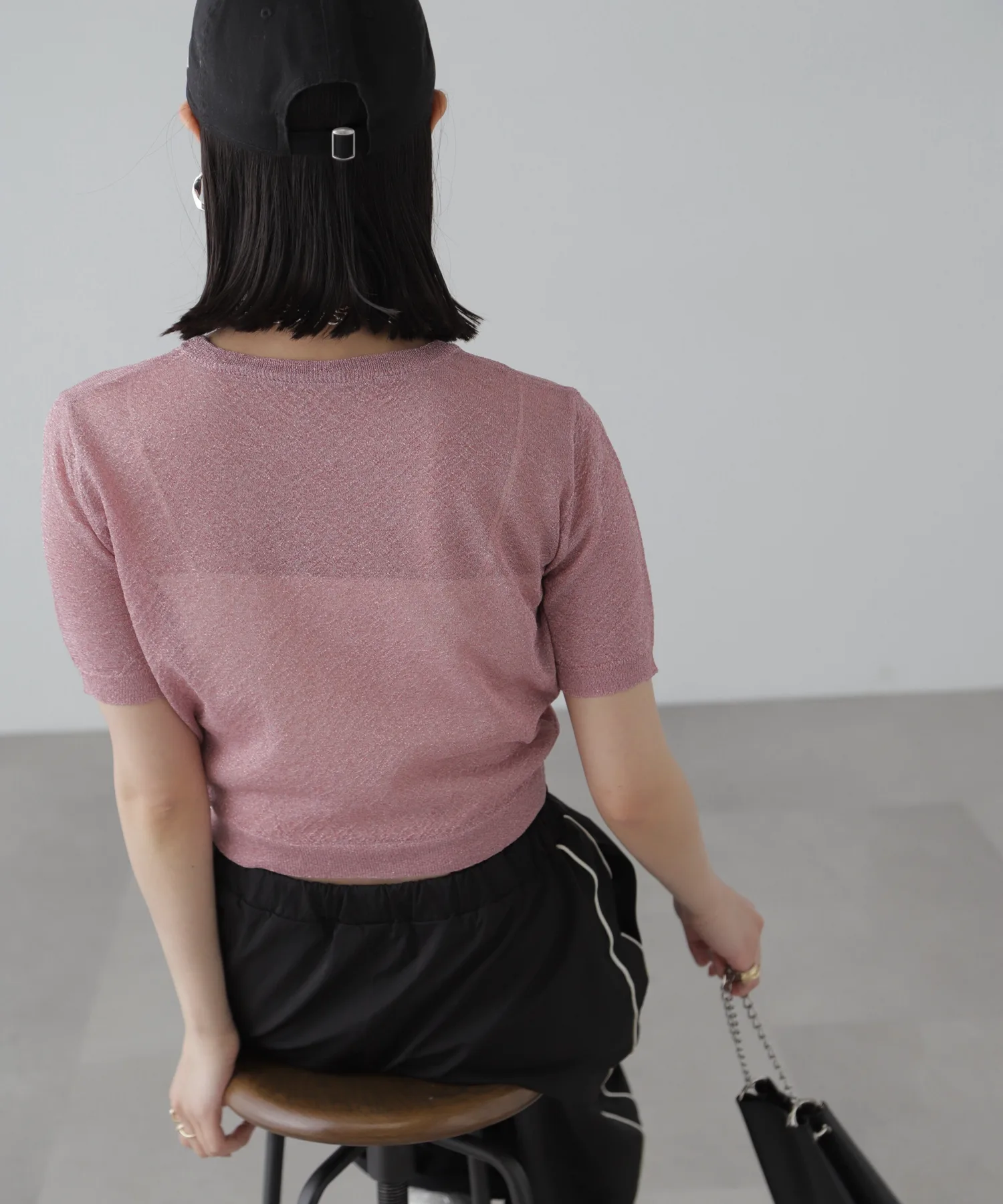 Это милый прозрачный топ с короткими рукавами, украшенный серебряными блестками. Несмотря на простой дизайн, использование блесток придает ему модный вид. Силуэт имеет умеренно узкий вырез и компактную длину, что позволяет легко заправлять его в жакет и сочетать с любыми брюками. Этот топ хорошо сочетается с широкими брюками, такими как мужские брюки или джинсы.