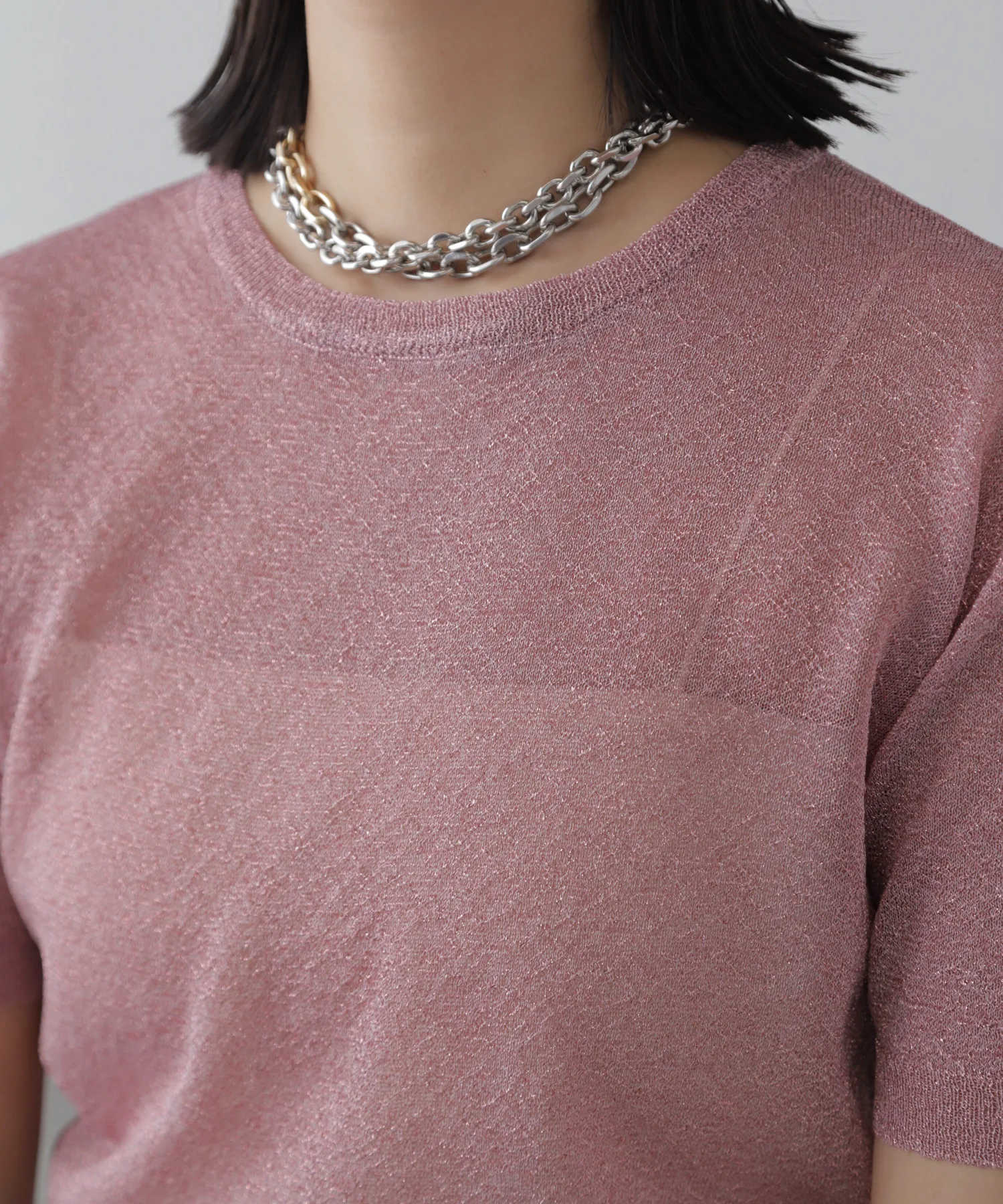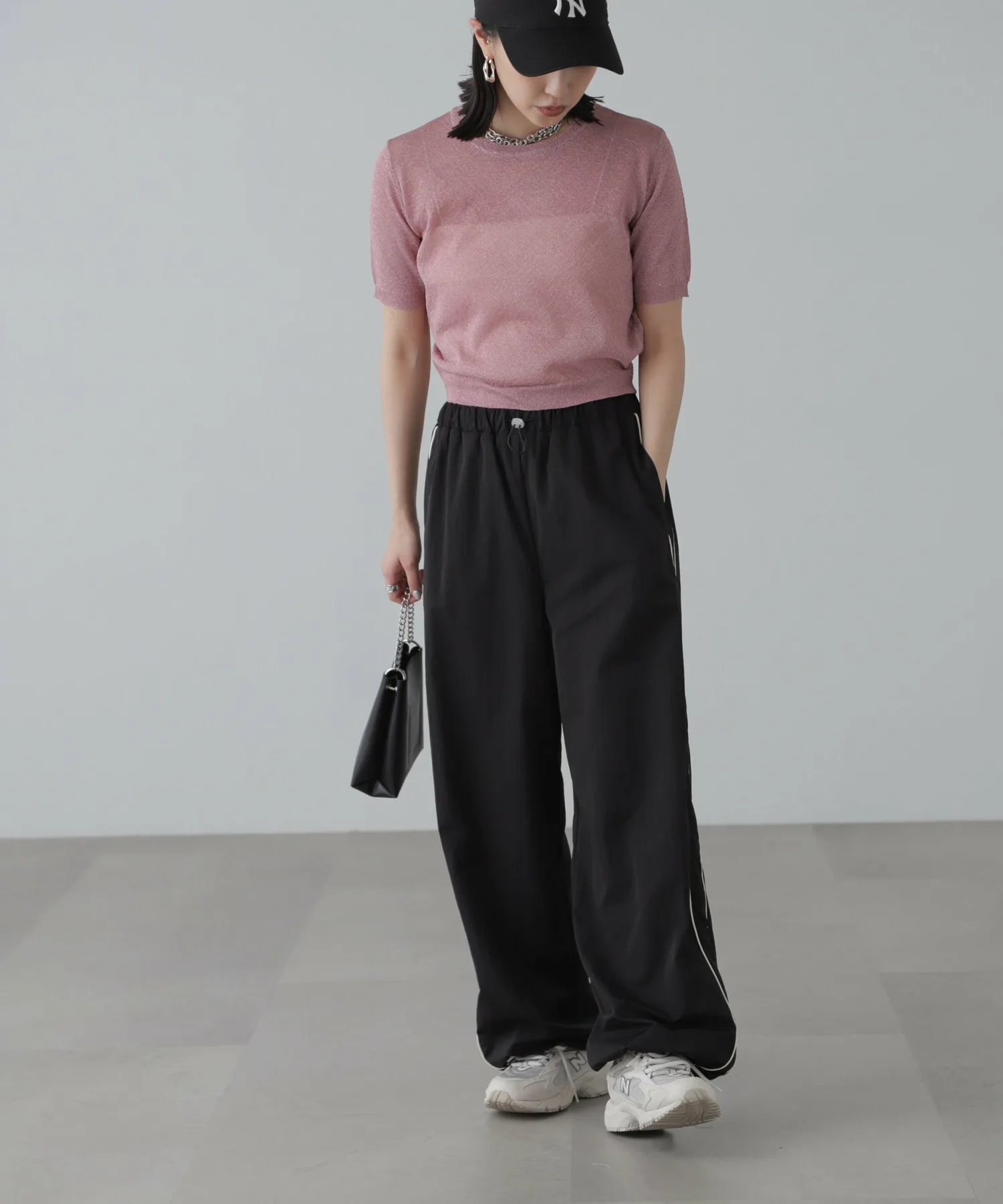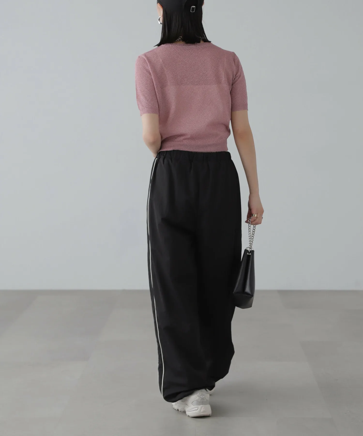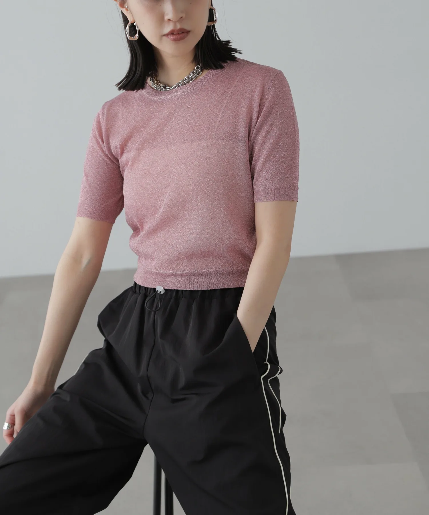 Это милый прозрачный топ с короткими рукавами, украшенный серебряными блестками. Несмотря на простой дизайн, использование блесток придает ему модный вид. Силуэт имеет умеренно узкий вырез и компактную длину, что позволяет легко заправлять его в жакет и сочетать с любыми брюками. Этот топ хорошо сочетается с широкими брюками, такими как мужские брюки или джинсы.