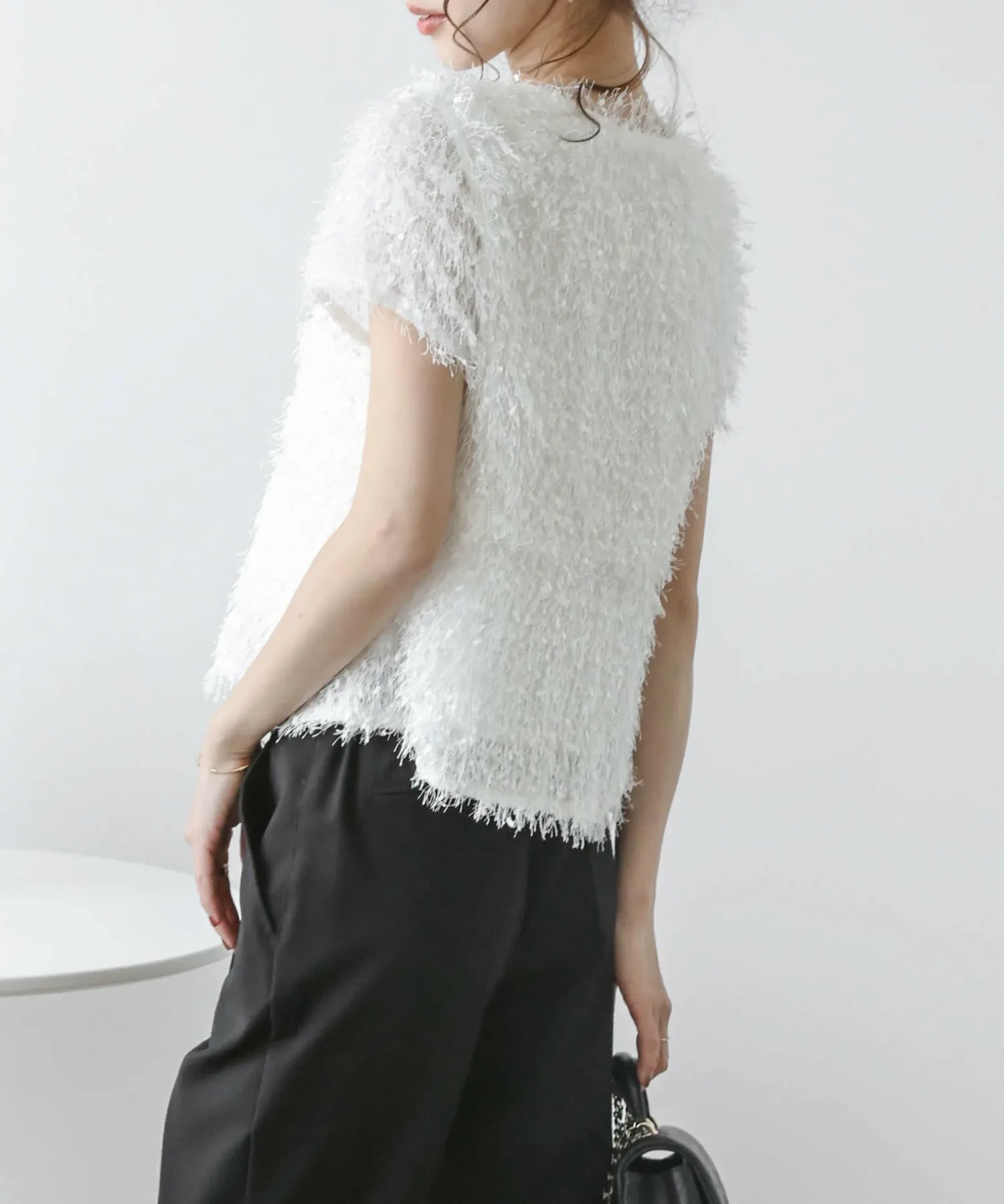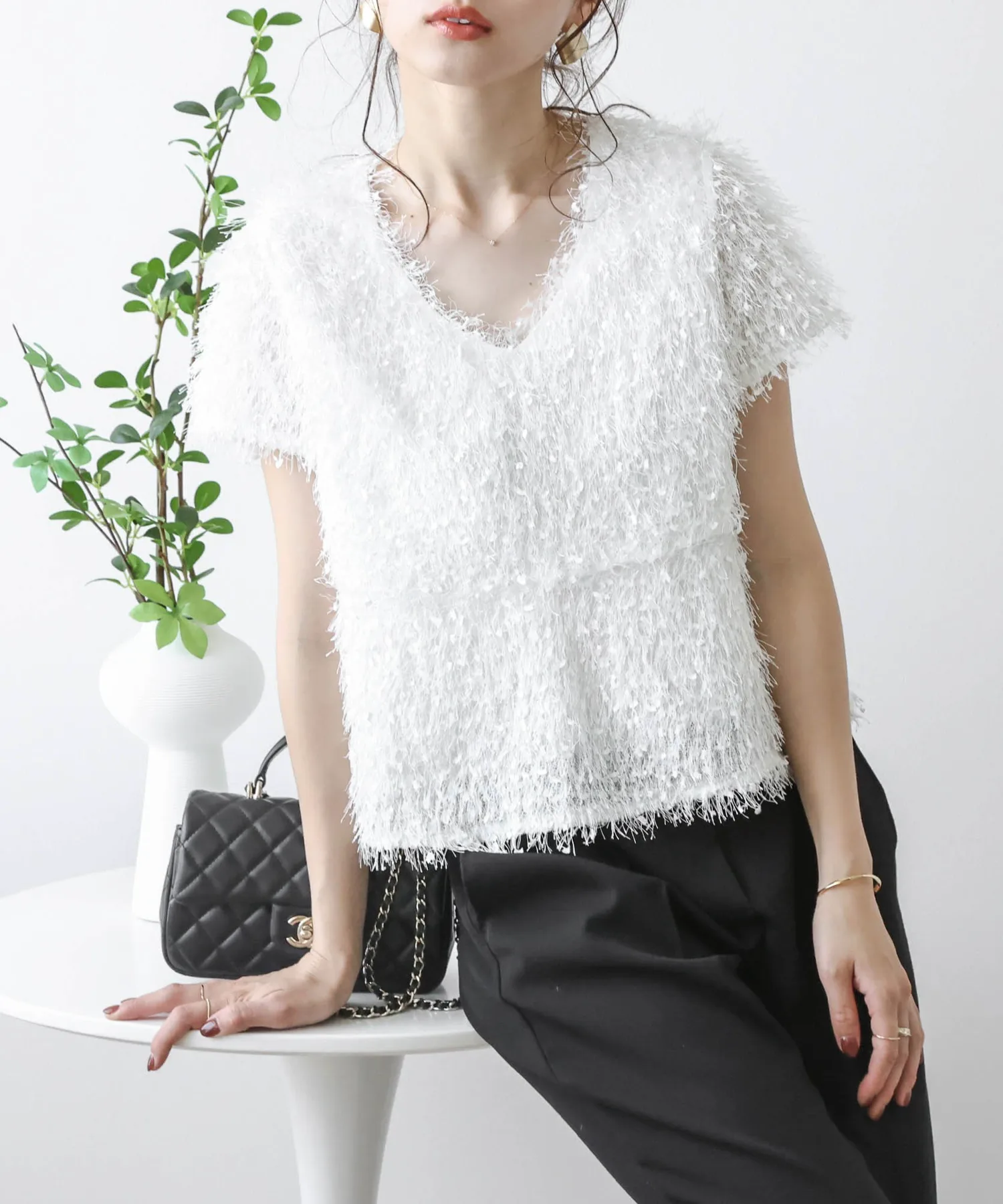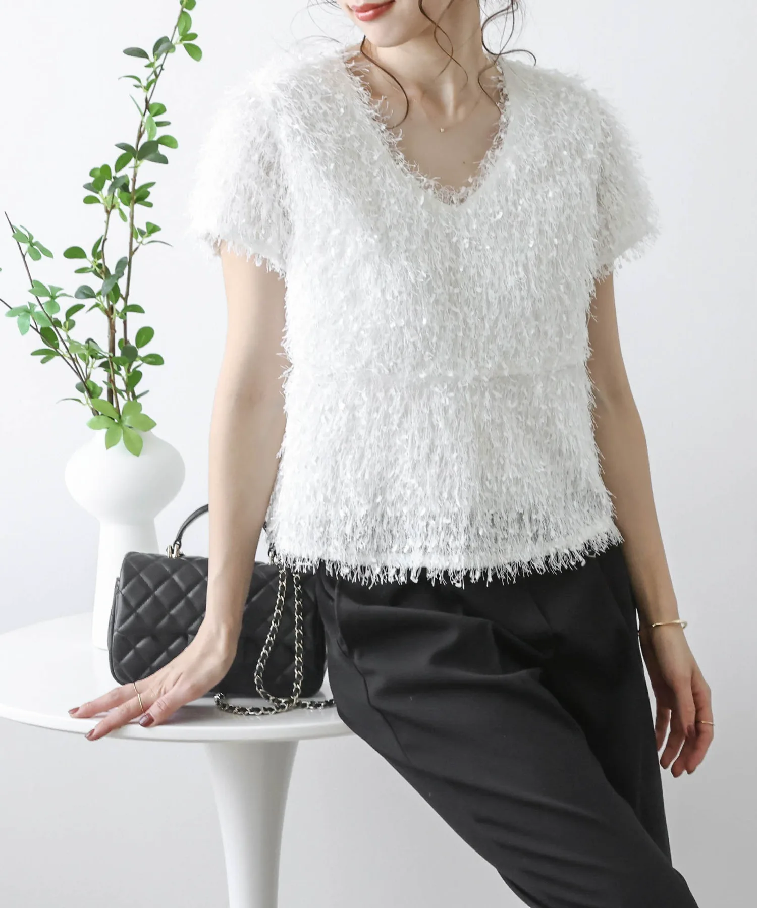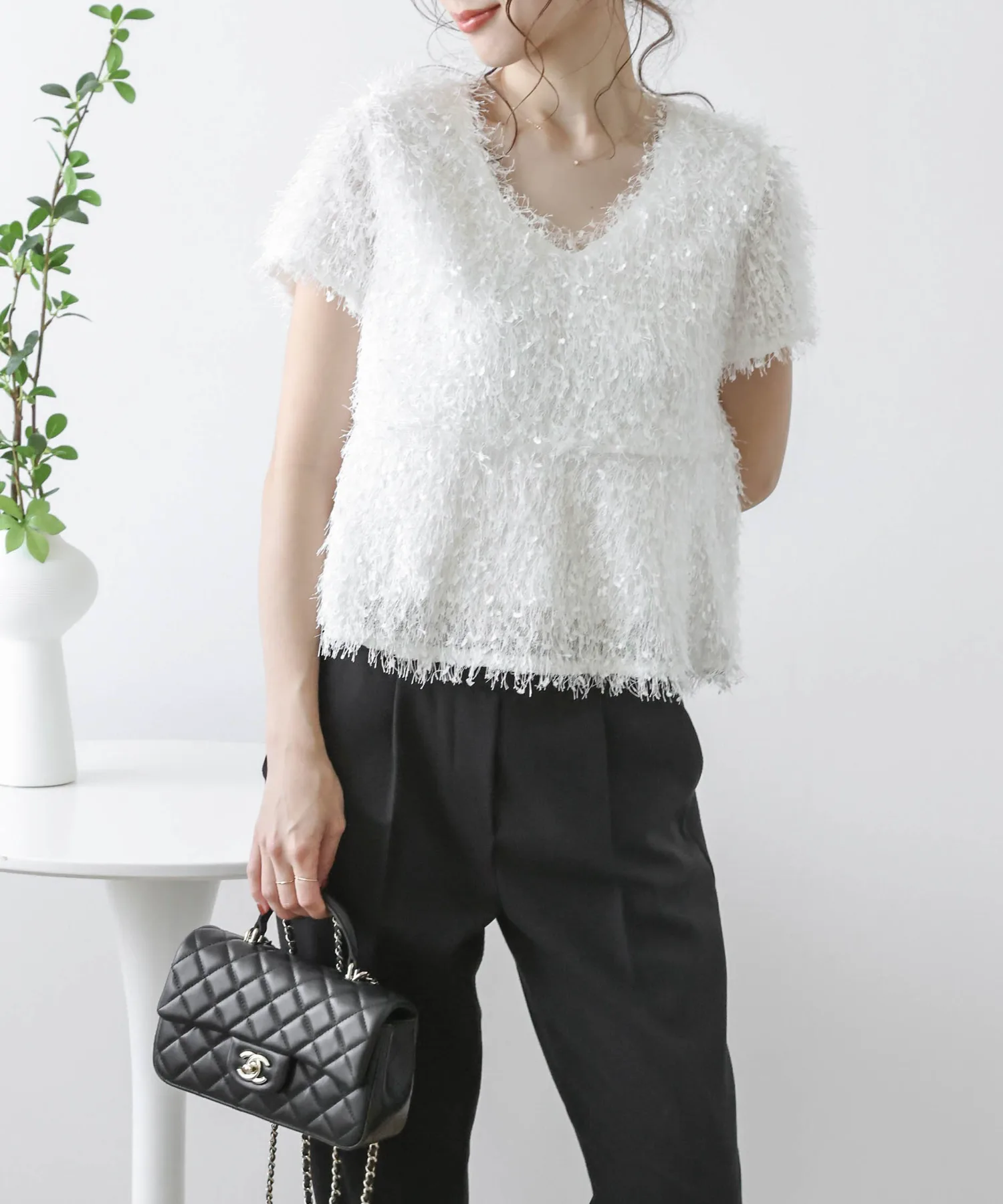 Изысканный, женственный топ с баской и привлекательной, пышной бахромой из перьев.