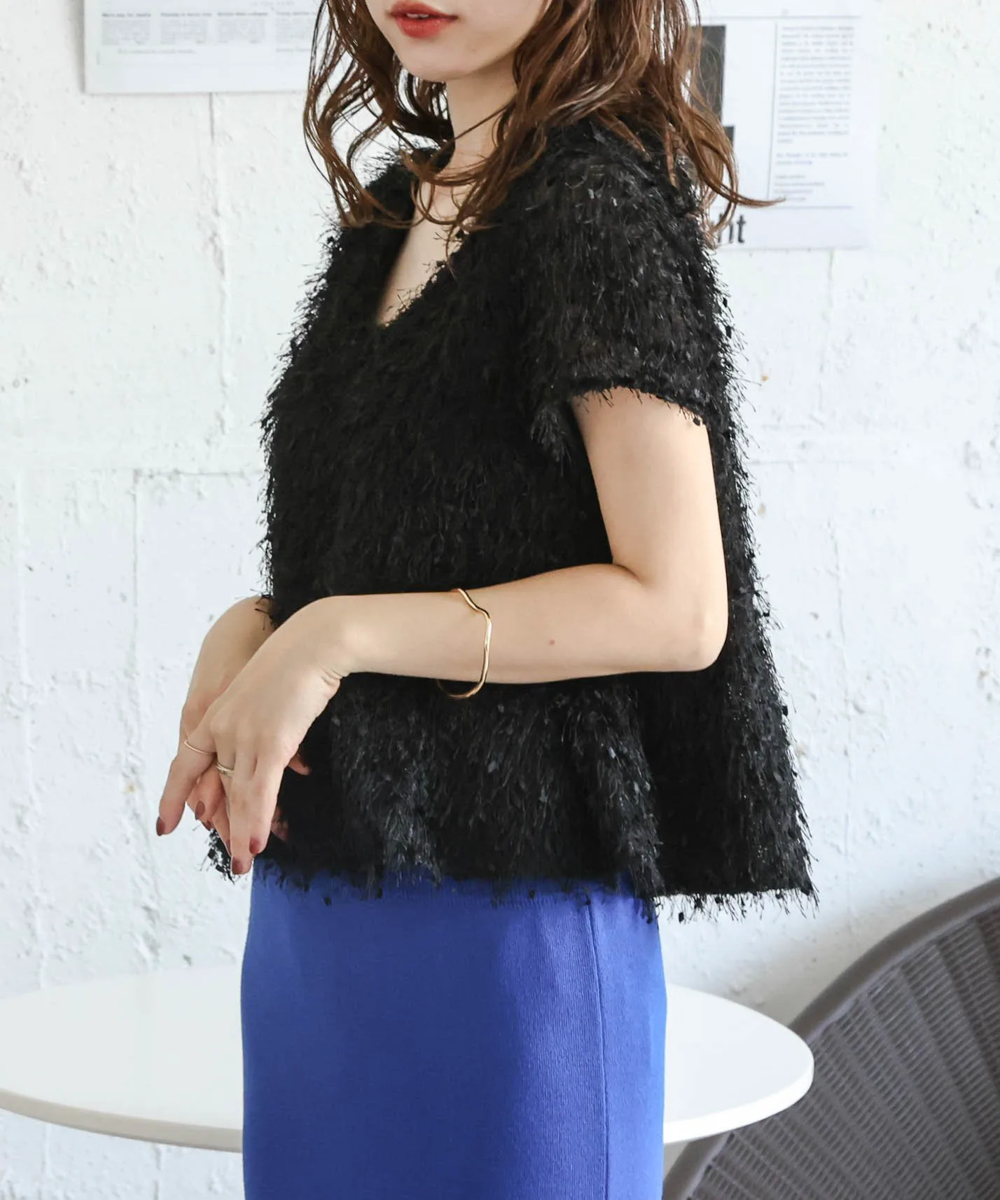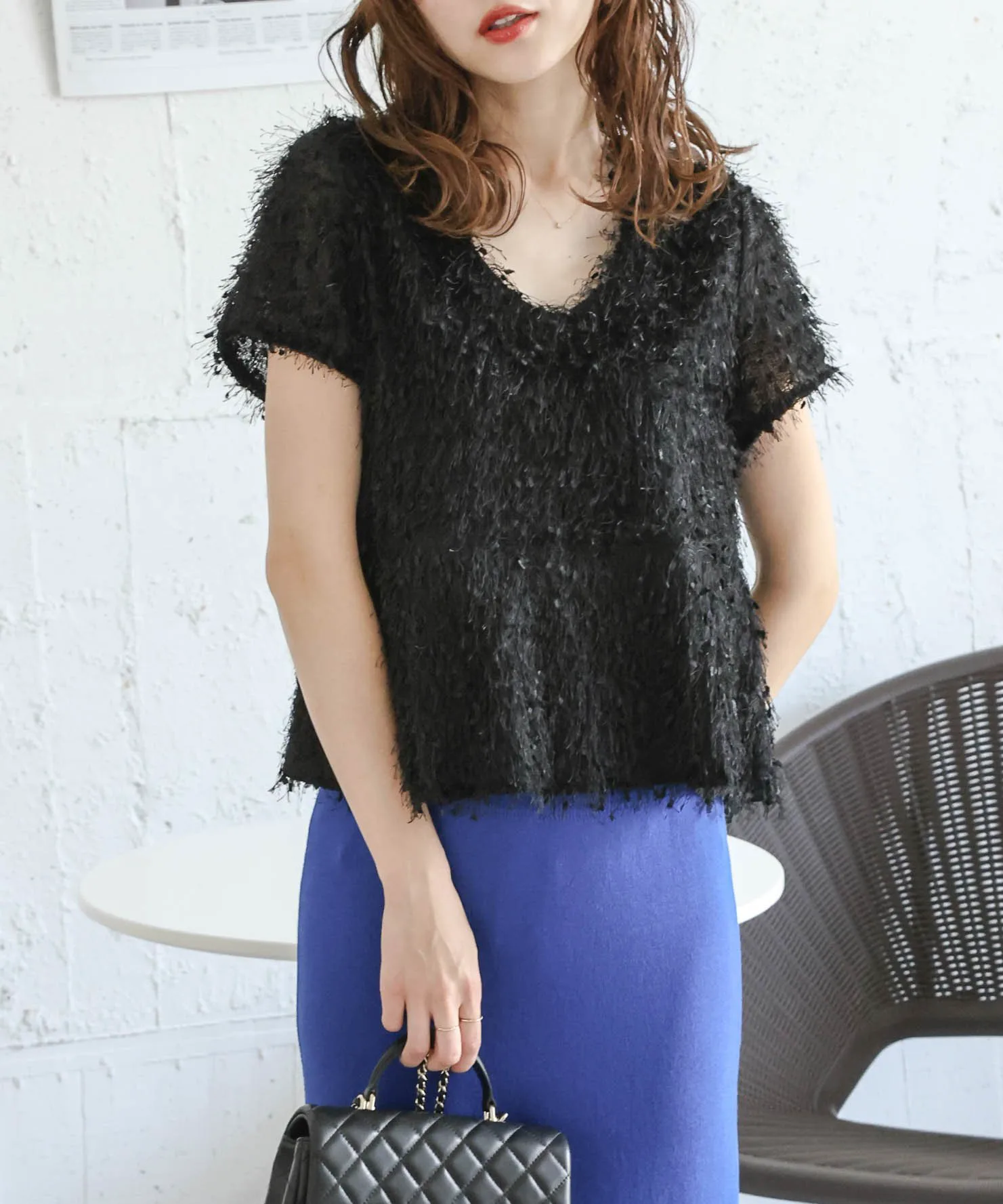 Изысканный, женственный топ с баской и привлекательной, пышной бахромой из перьев.