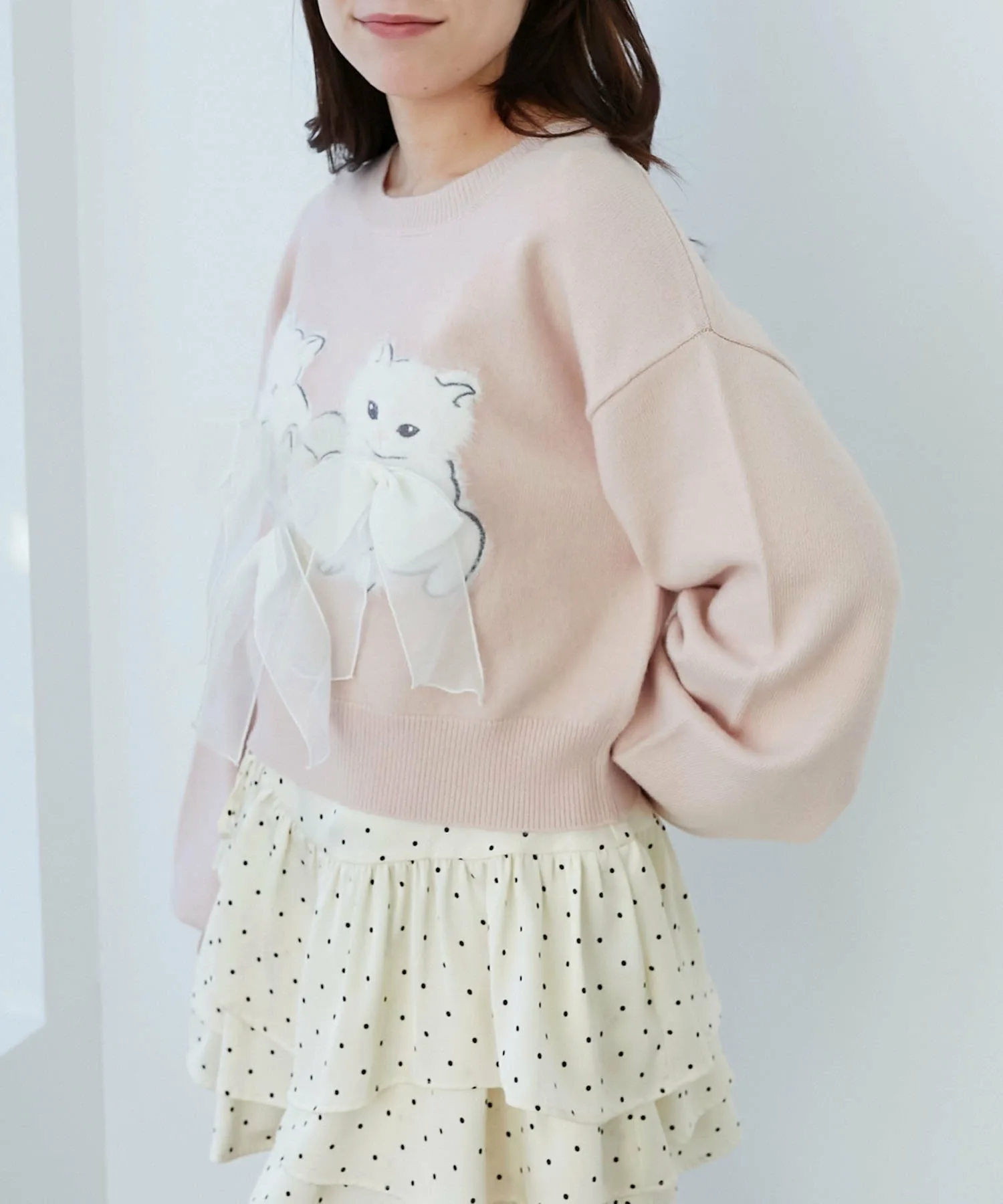Очаровательный вязаный свитер с изображением трех котят, украшенных объемными лентами.