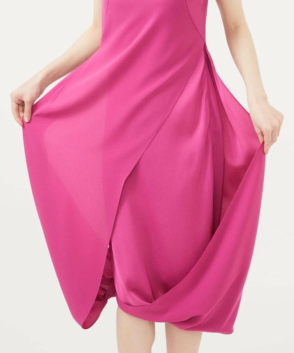 Диагональный разрез от талии до подола открывает атласную ткань сзади.