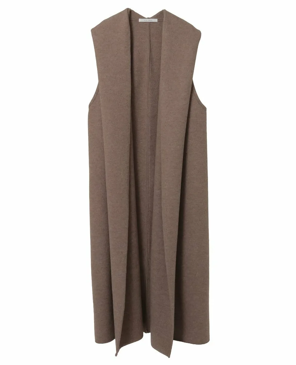 Это изысканное изделие создано путем сжатия трикотажного полотна перед раскроем и пошивом. Чрезвычайно тонкая, гладкая, объемная и теплая полукамвольная пряжа толщиной 17,5 микрон остается мягкой и нежной даже в сжатом состоянии, не становясь жесткой. Тщательно проработанная компрессионная отделка обеспечивает шероховатую поверхность и идеальный баланс упругости и мягкости. Этот длинный жилет напоминает шаль. Дизайн создает обильную драпировку спереди, придавая изделию красивый оттенок уже при первом надевании. Большой воротник можно носить по-разному: как капюшон или сложить, чтобы получилась шаль. Мы рекомендуем сочетать его с компрессионным платьем FLOAT (A1553KA802), но это также универсальная вещь, которую можно носить поверх топа без рукавов в зависимости от сезона.