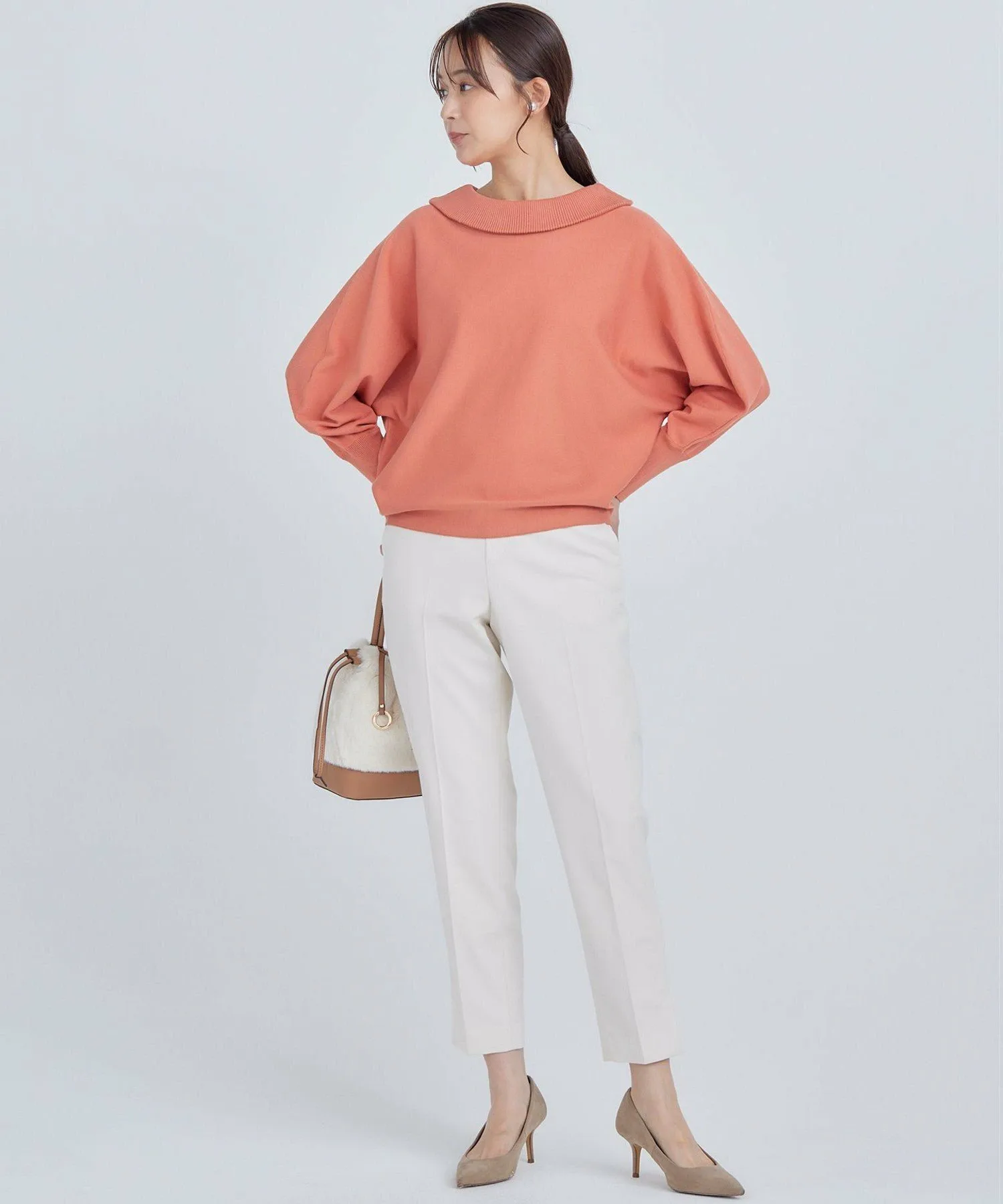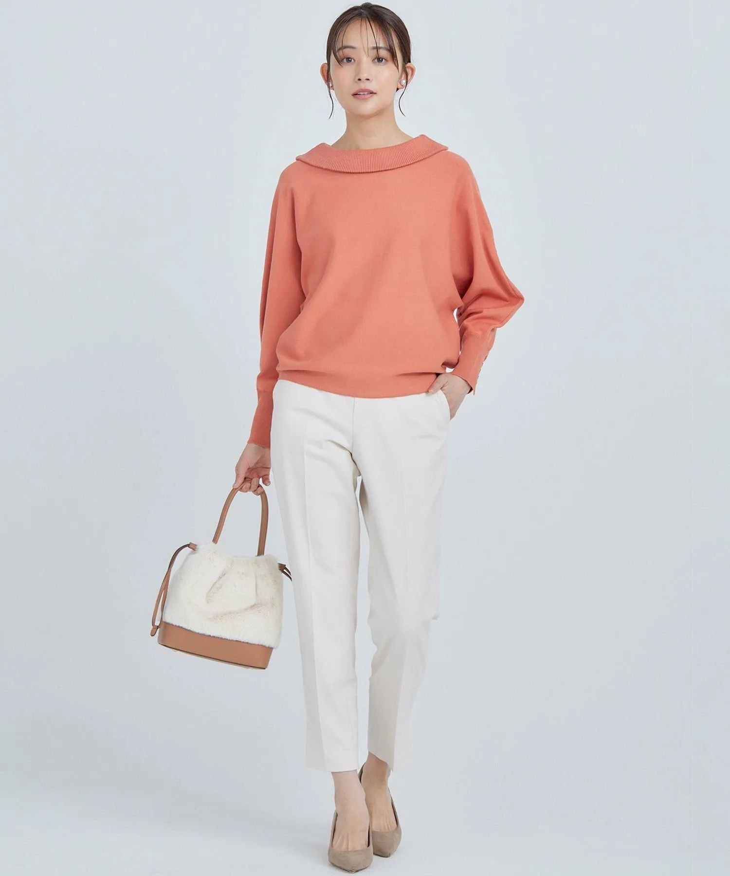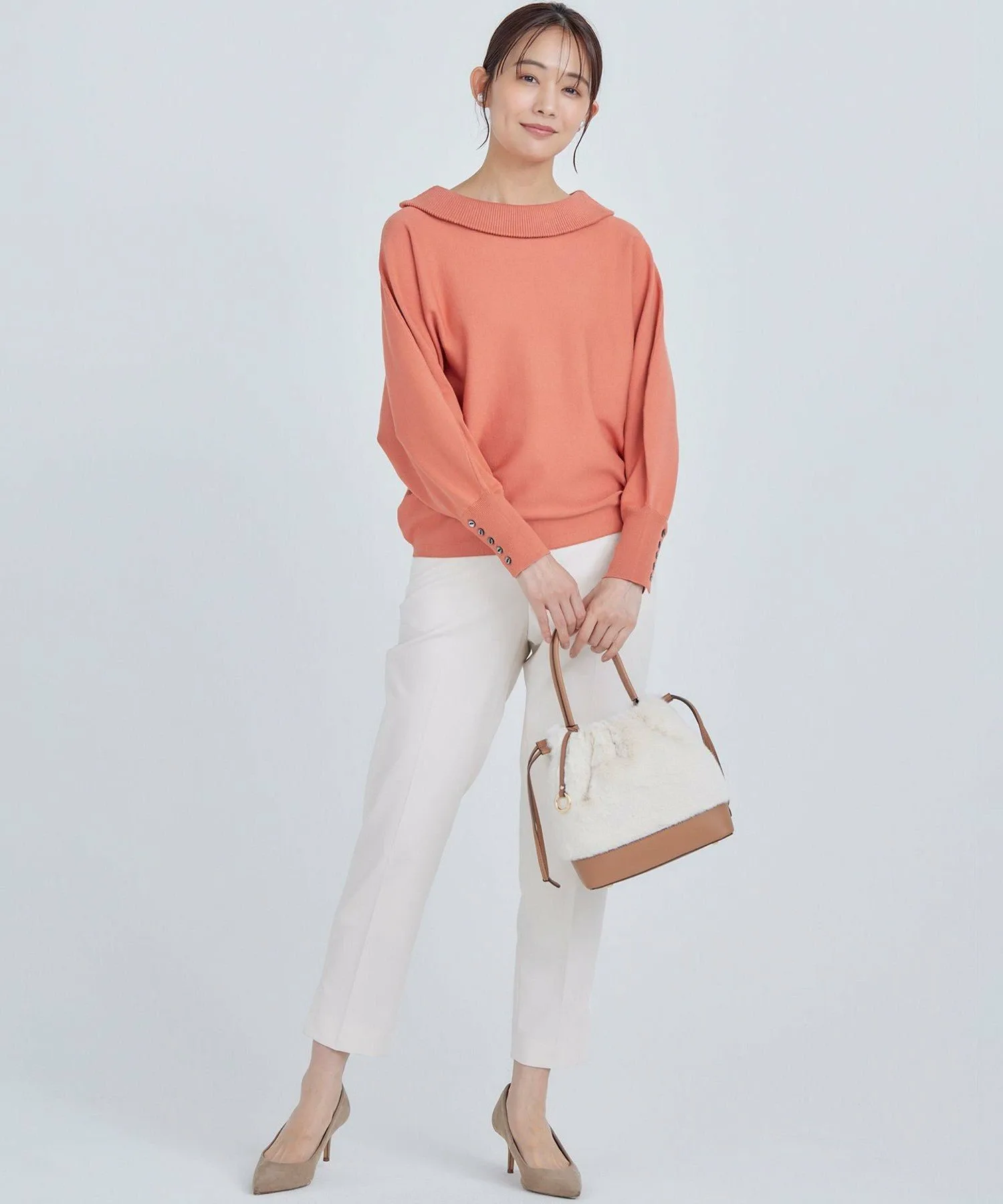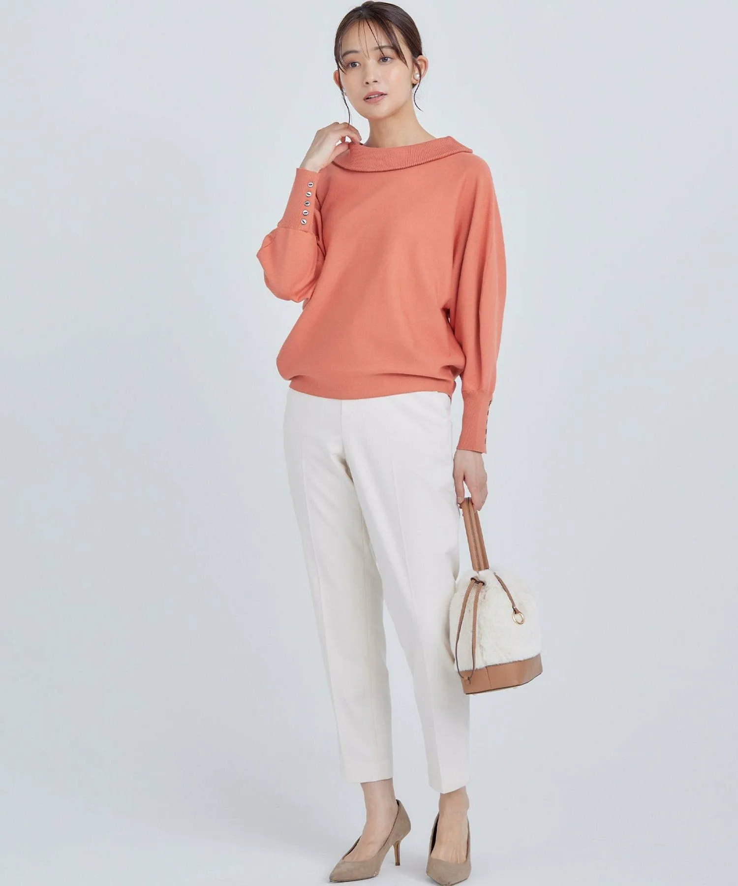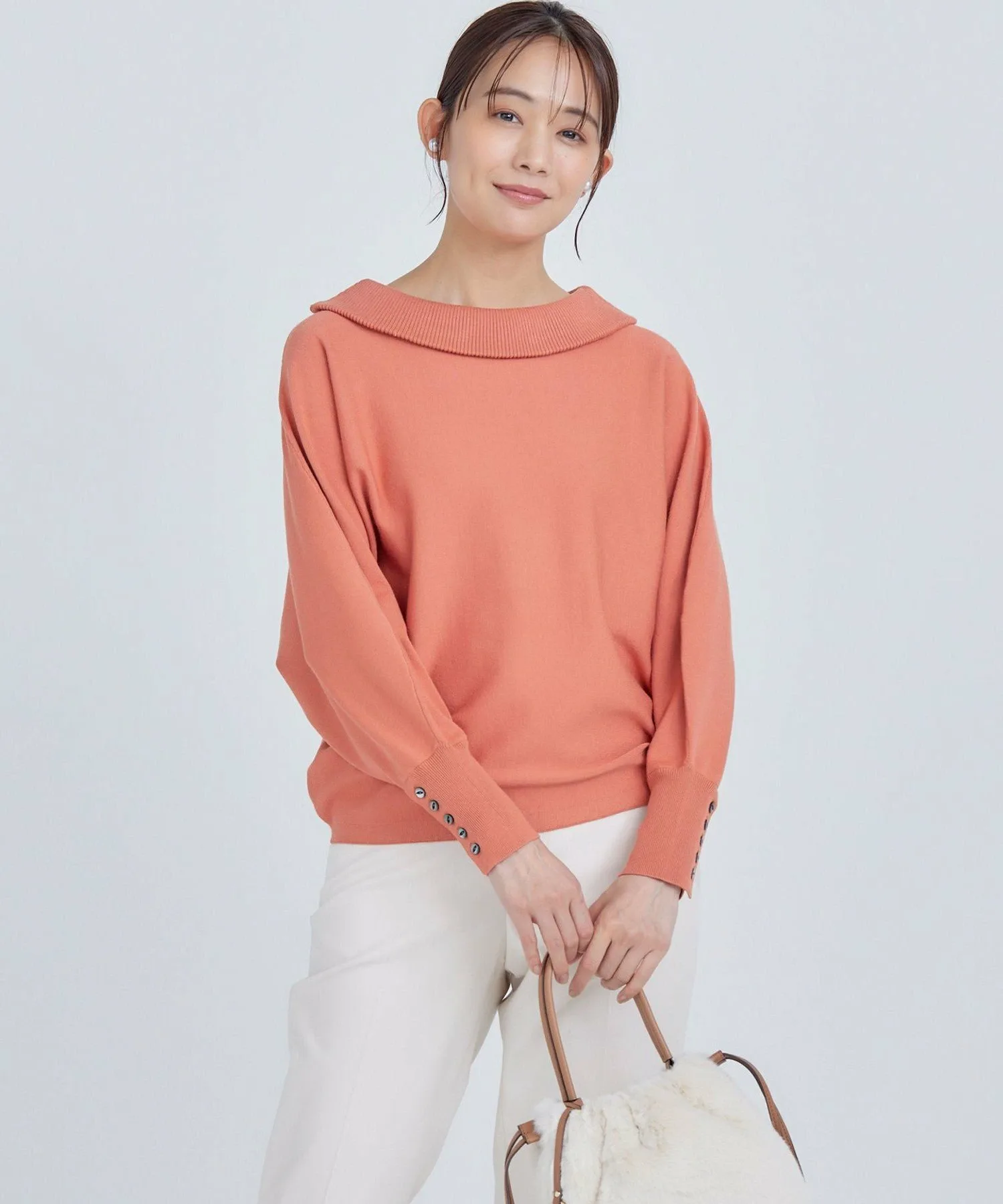 Этот пуловер имеет оптимальный объем в рукавах-летучая мышь и воротник с открытыми плечами. Дополнительные пуговицы на длинных ребристых манжетах добавляют стиля. Его силуэт женственный, мягкий и эластичный, но при этом не подчеркивает линии тела. Длина спереди и сзади различается, создавая сбалансированный силуэт, который отлично смотрится как заправленным, так и навыпуск. Простой дизайн позволяет легко сочетать его с широким спектром нарядов, от повседневных до нарядных.