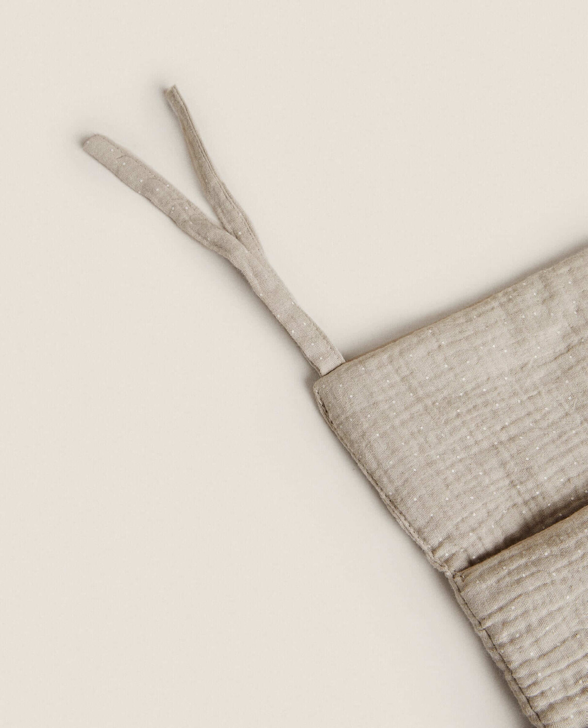 Стеганый подвесной органайзер для детской кровати из хлопкового муслина с принтом в горошек. Имеет несколько карманов и застегивается на лямки.