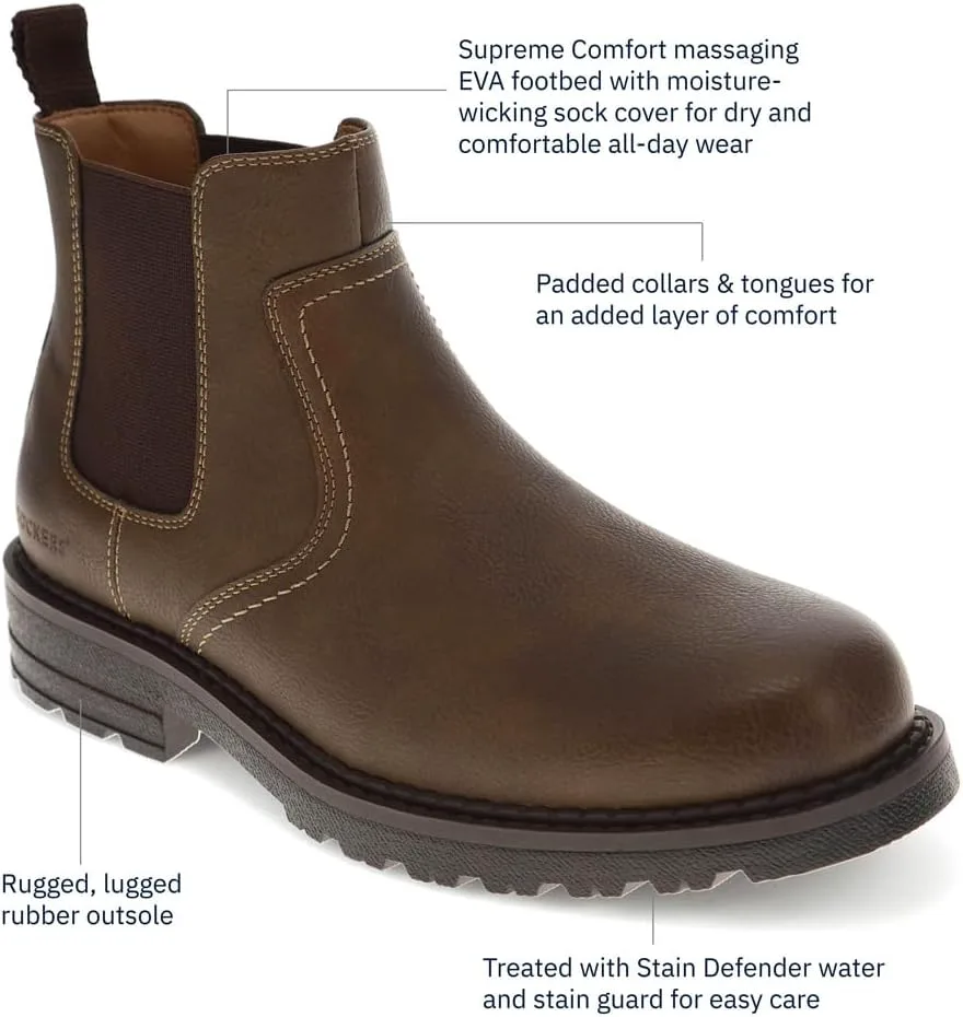 НЕПРЕВЗОЙДЕННЫЙ, НЕПРЕХОДЯЩИЙ КОМФОРТ. Оснащенная передовой стелькой Dockers в открытом космосе и массажными текстурами, эти мужские туфли обеспечивают исключительный уровень комфорта. Влагозабирающая чехол для носков обеспечивает сухой и комфортный опыт, который сохраняется весь день. ДОПОЛНИТЕЛЬНАЯ ПОДКЛАДКА ДЛЯ ДОПОЛНИТЕЛЬНОЙ ПОДДЕРЖКИ. Мягкий воротник и язык обеспечивают дополнительную амортизацию вокруг лодыжки. Эти продуманные элементы дизайна предотвращают дискомфорт и раздражение, обеспечивая мягкое и поддерживающее ощущение на каждом шаге. СЛЕДУЮЩИЙ УРОВЕНЬ СЦЕПЛЕНИЯ НА ЛЮБОЙ МЕСТНОСТИ. Подошва TPR с тягой обеспечивает впечатляющую прочность и превосходное сцепление на различных поверхностях. Будь то скользкие улицы или грязные дорожки, эти ботинки Dockers гарантируют вам устойчивость и безопасность. ТЕХНОЛОГИЯ STAIN DEFENDER. Обработка Stain Defender гарантирует, что гладкая синтетическая кожаная верхняя часть этих ботинок защищена от воды и пятен. Ваши ботинки Dockers дольше останутся чище, даже в суровых условиях.-УДОБНЫЕ; ЛЕГКО УКЛАДЫВАЮТСЯ. Оснащенные внутренними молниями, эти мужские ботинки позволяют легко и быстро надевать и снимать их. Классический силуэт, аккуратная строчка и прочный повседневный дизайн делают их идеальными для сочетания с любым нарядом - от джинсов до хлопковых брюк.