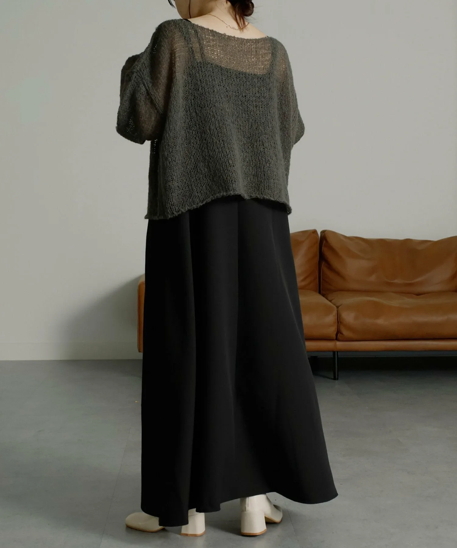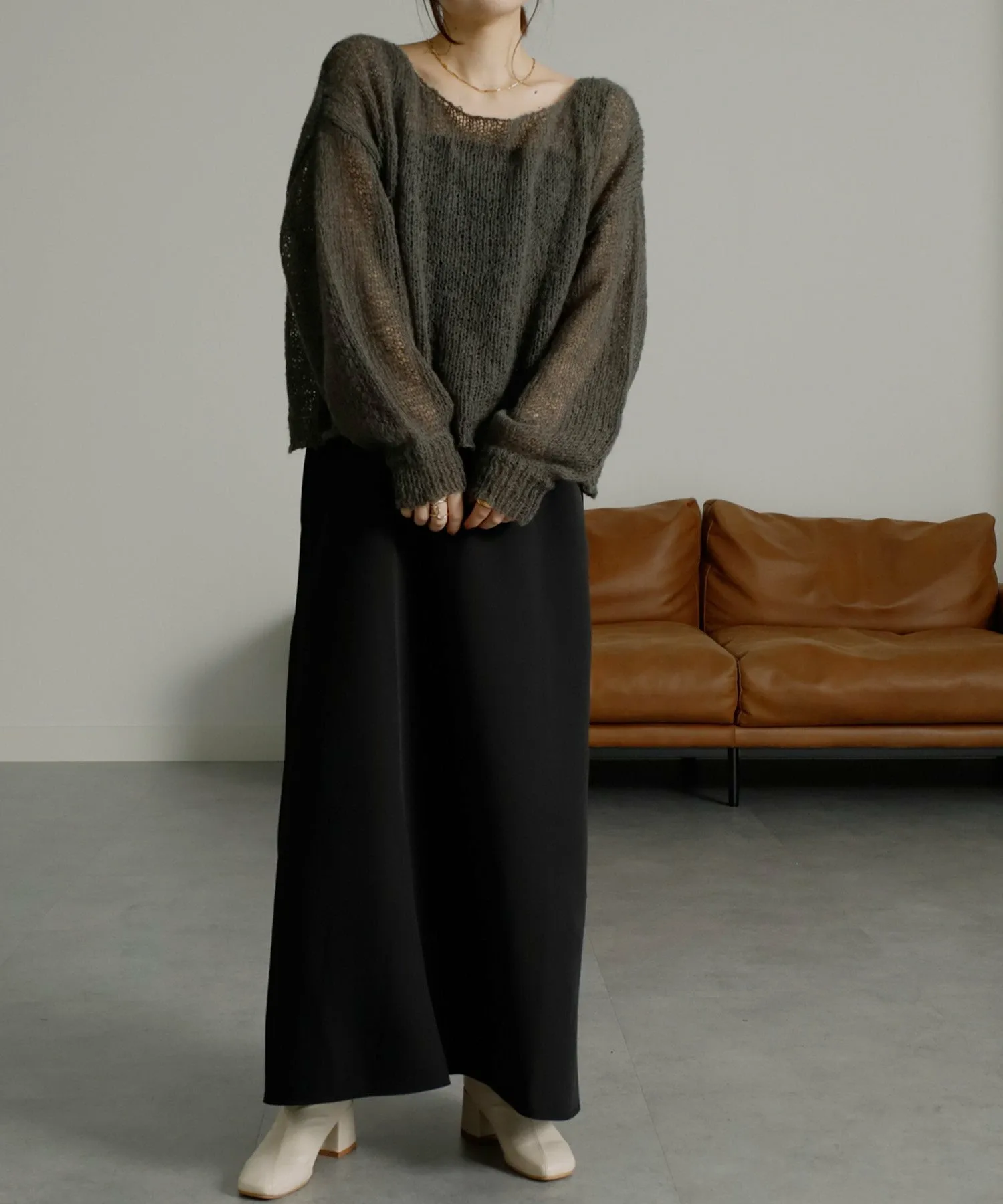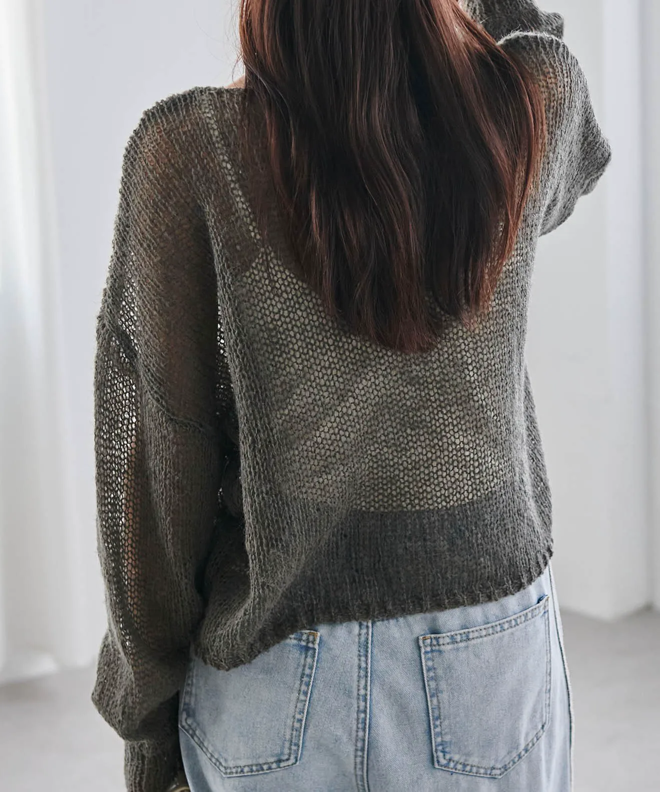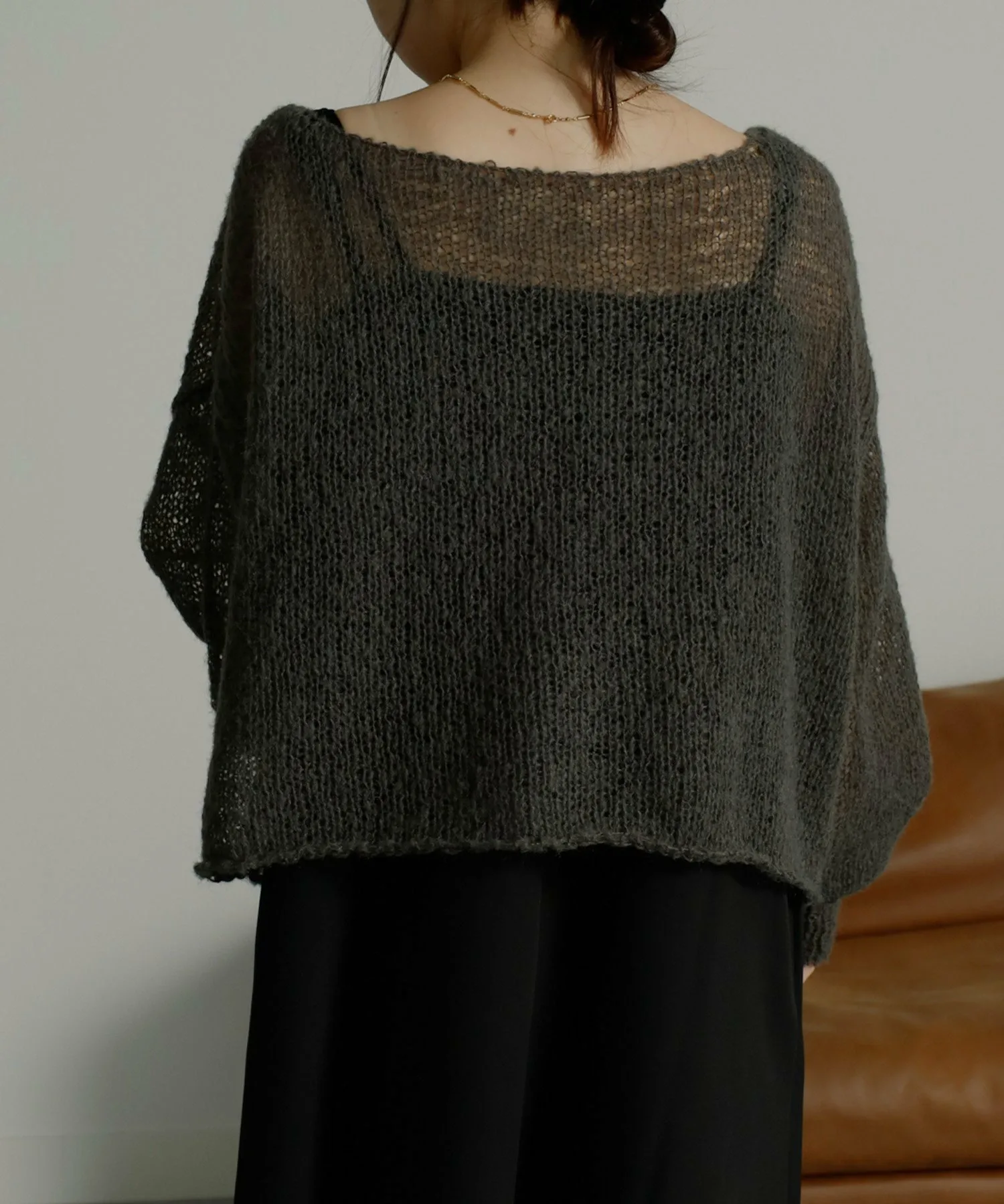 Изготовлено из пряжи, мягкой и пушистой на ощупь, как мохер. Ткань теплая, но при этом имеет свободную вязку, создающую эффект прозрачности. Свободный силуэт подчеркивает мягкость материала.