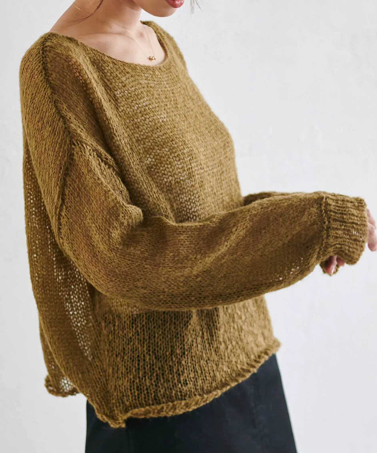 Изготовлено из пряжи, мягкой и пушистой на ощупь, как мохер. Ткань теплая, но при этом имеет свободную вязку, создающую эффект прозрачности. Свободный силуэт подчеркивает мягкость материала.