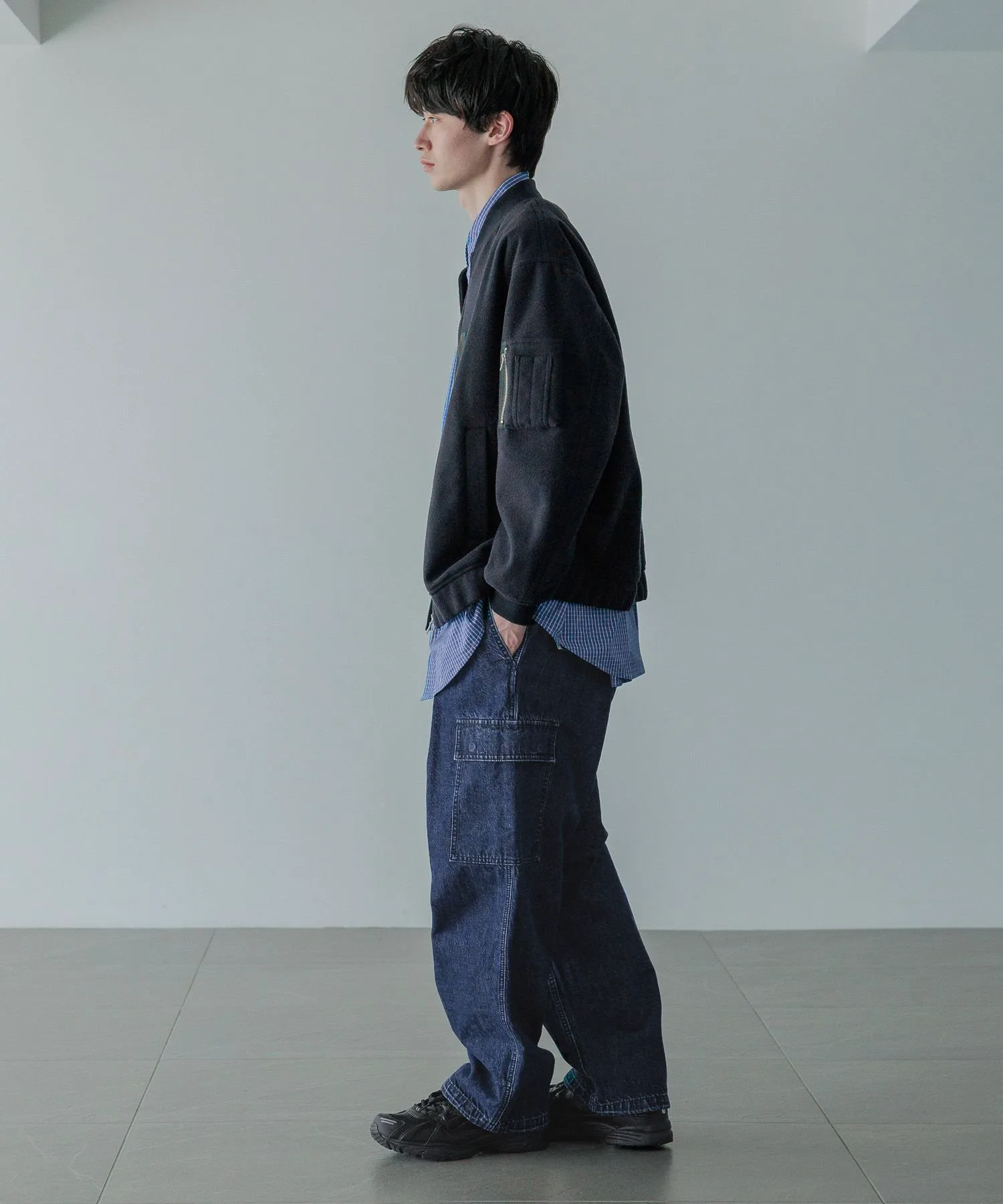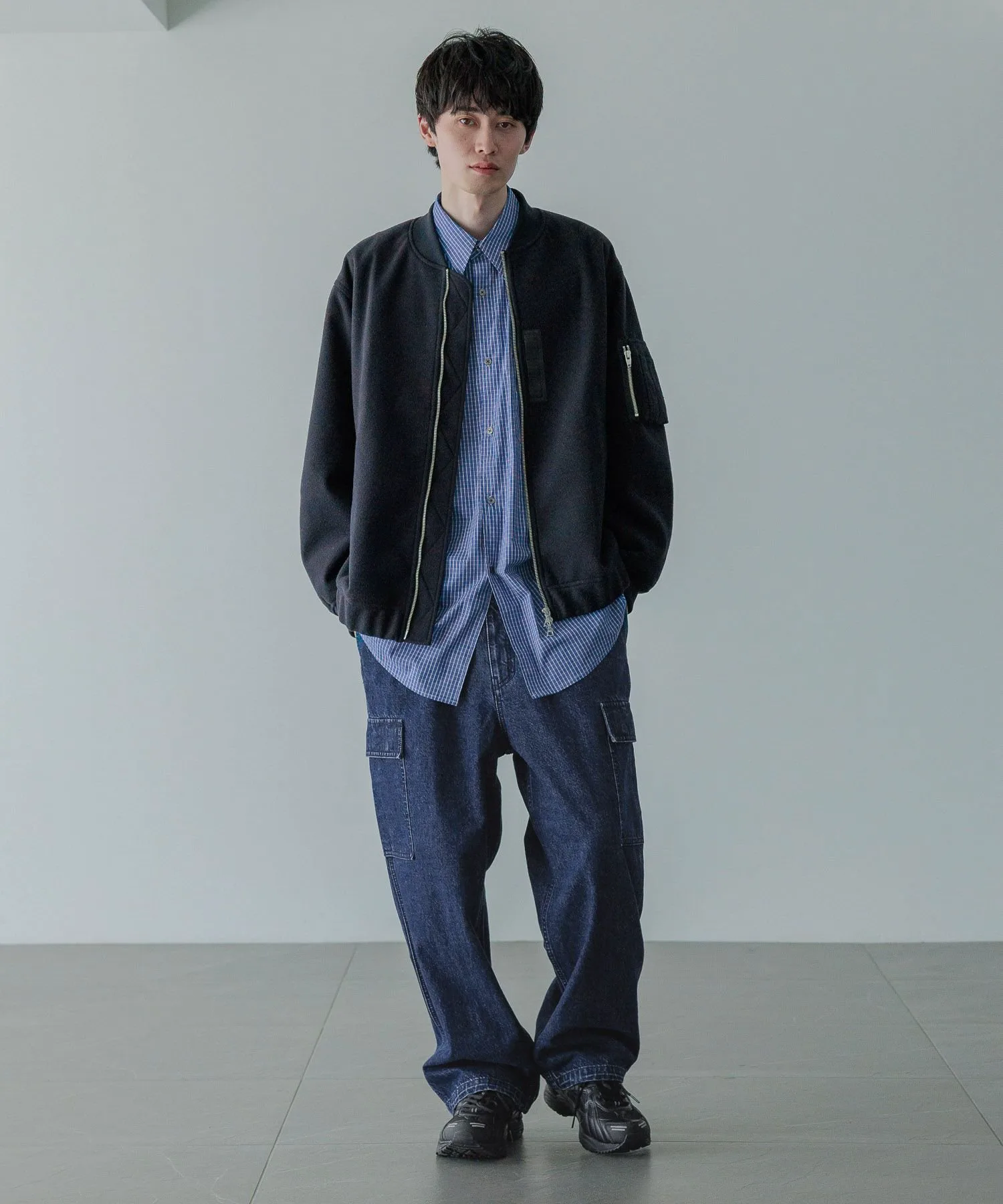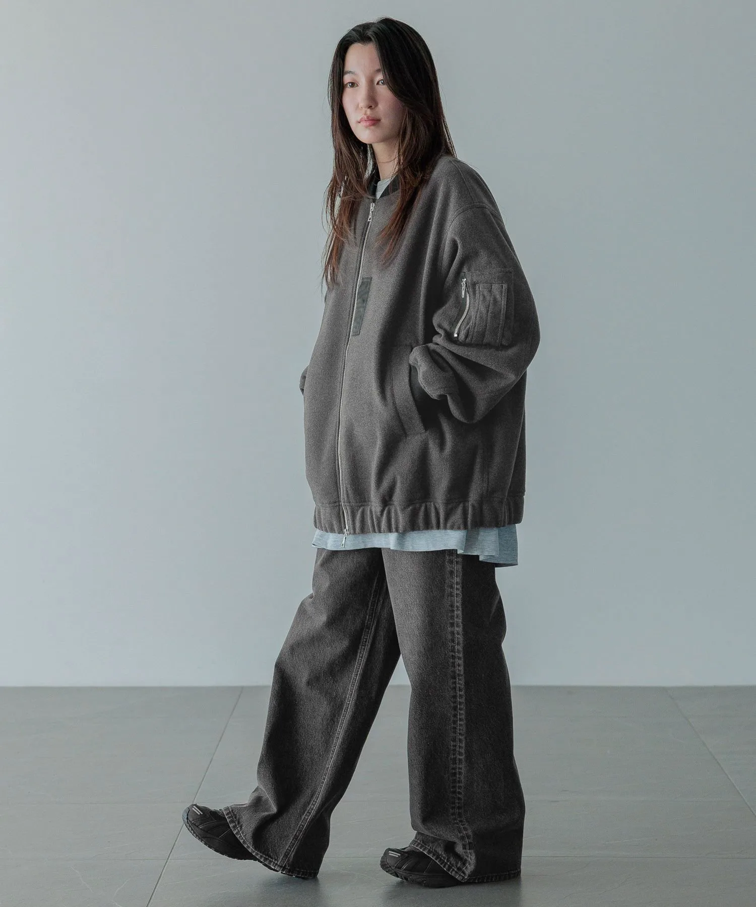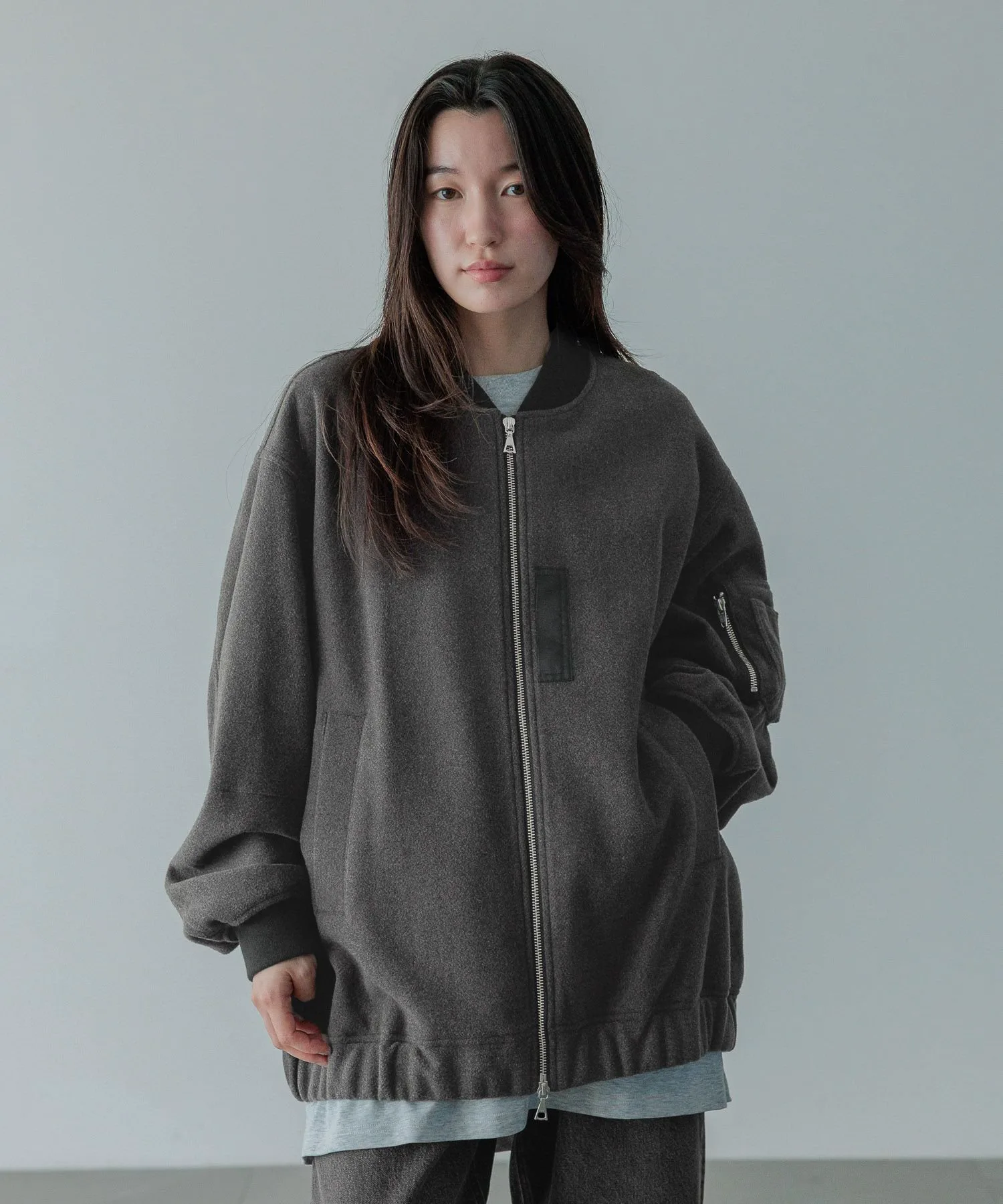 Базовый дизайн MA-1 воплощен в материале, похожем на шерсть, с присборкой из того же материала на манжетах и подоле для минималистичного вида.