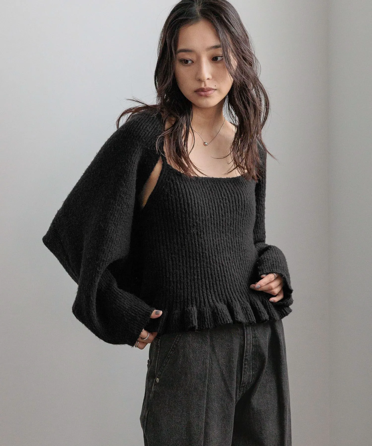Вязаный комплект, состоящий из майки с оборками по низу и короткого болеро.