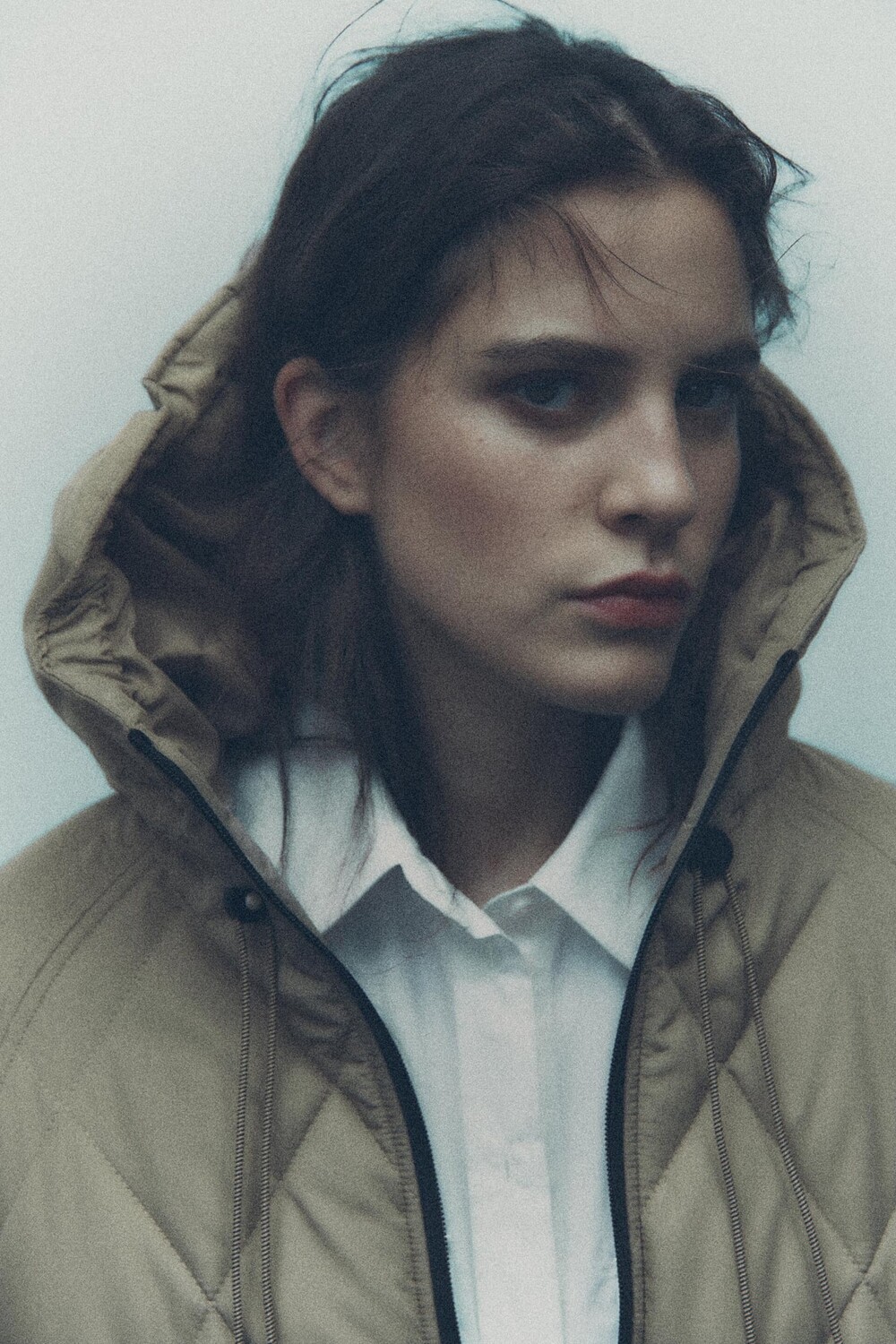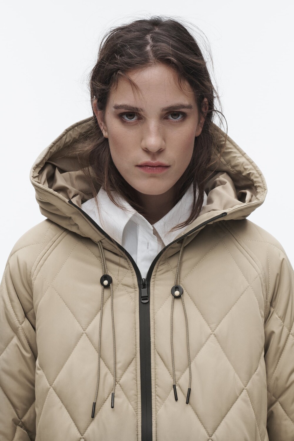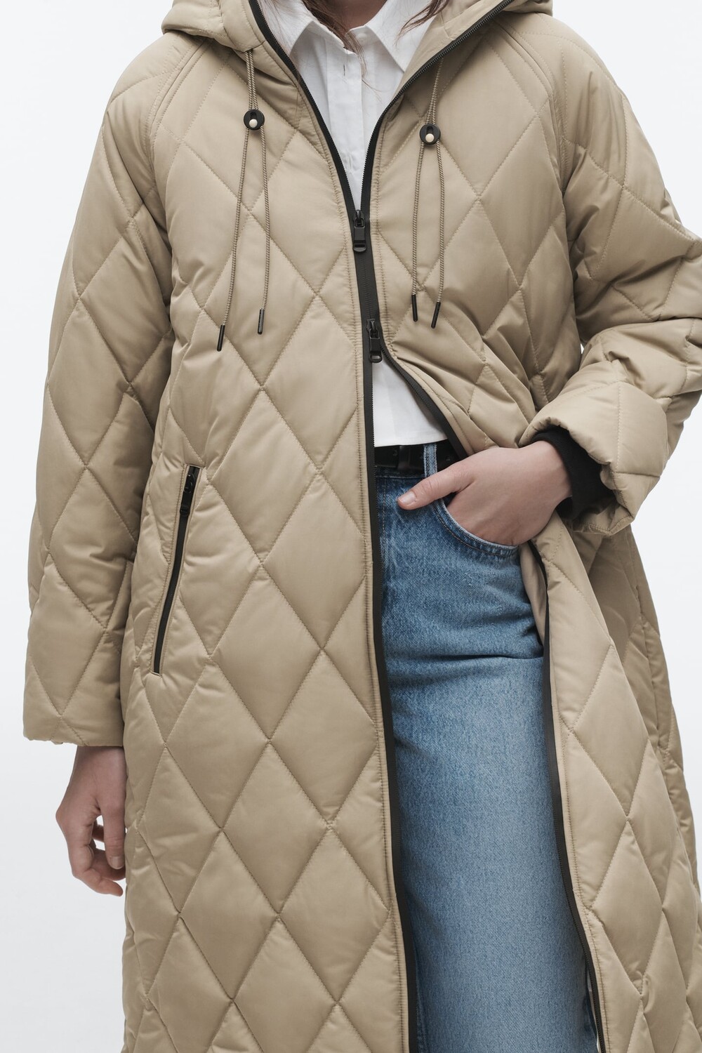 Пальто с высоким воротом, капюшоном и кулиской. Длинные рукава с внутренними манжетами. Передние карманы на молнии. Застежка-молния спереди.