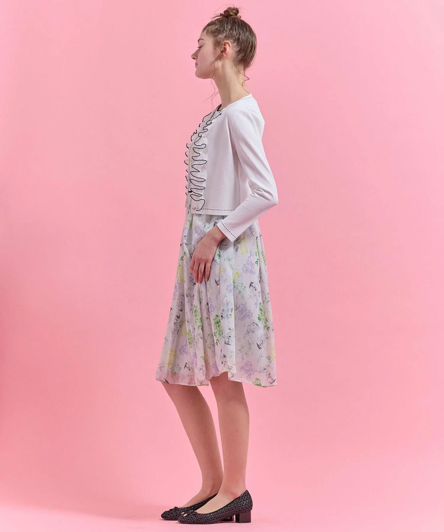 Оборки, отделанные кантом, легко колышутся при каждом движении, подчеркивая вашу женственность.