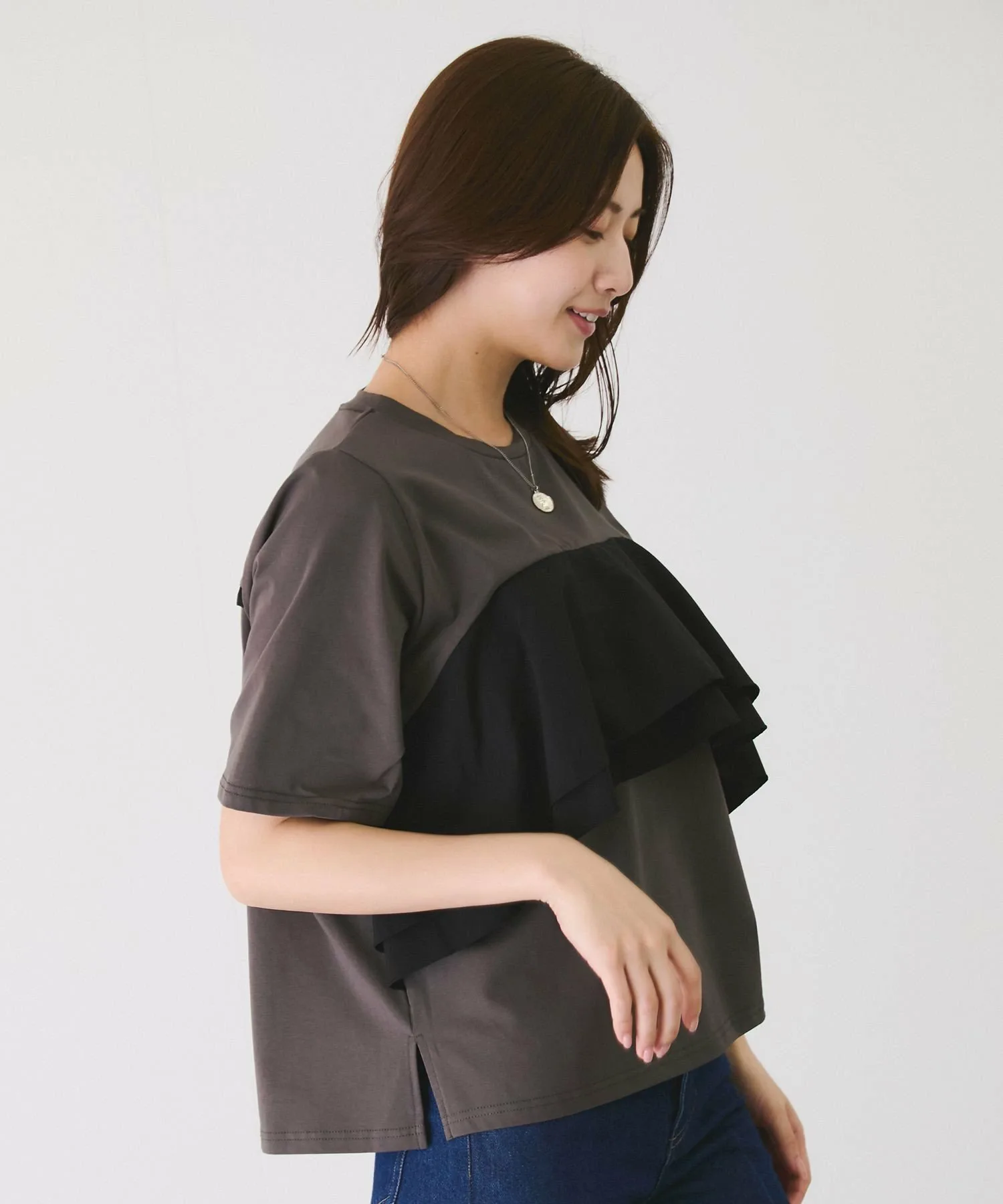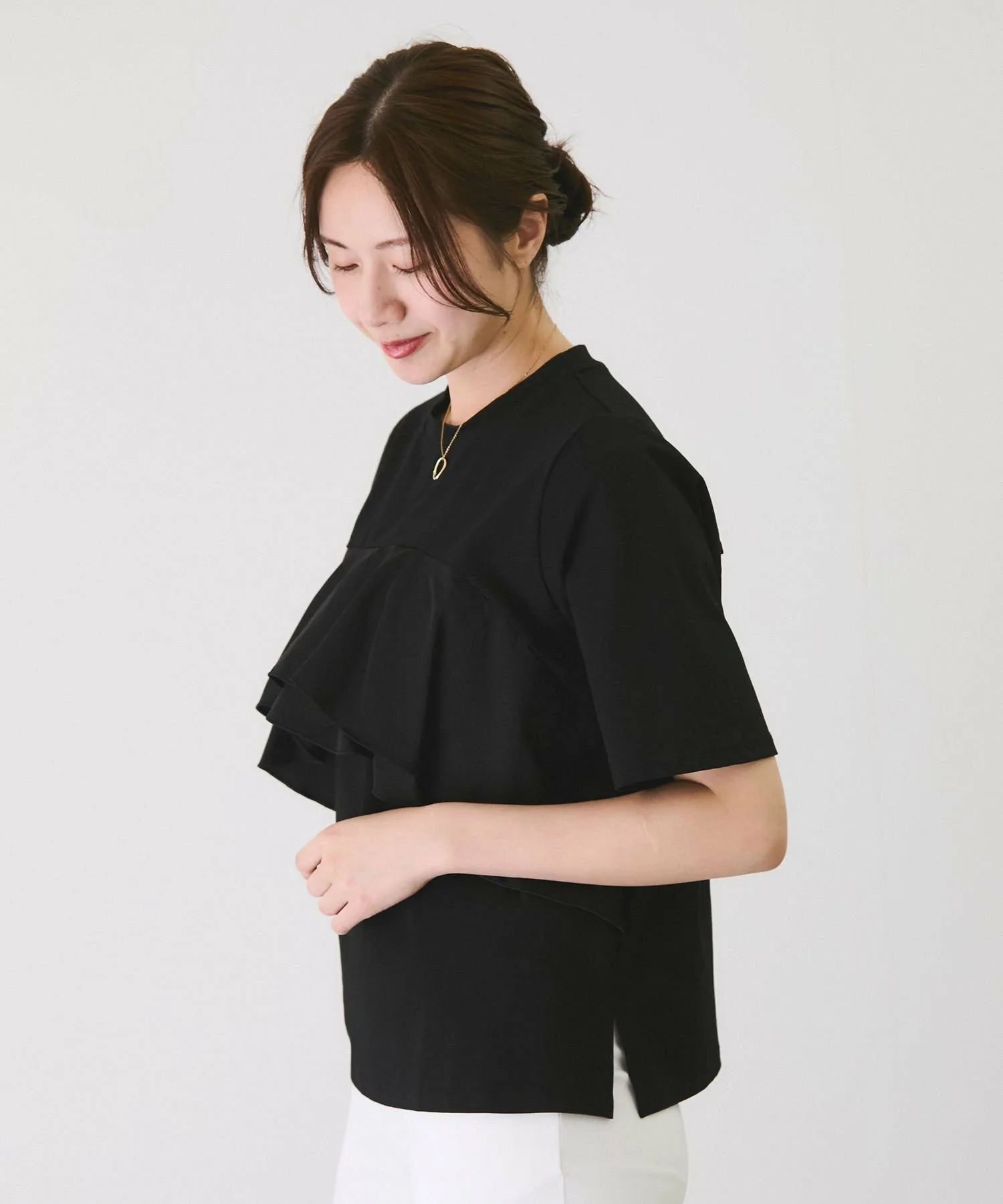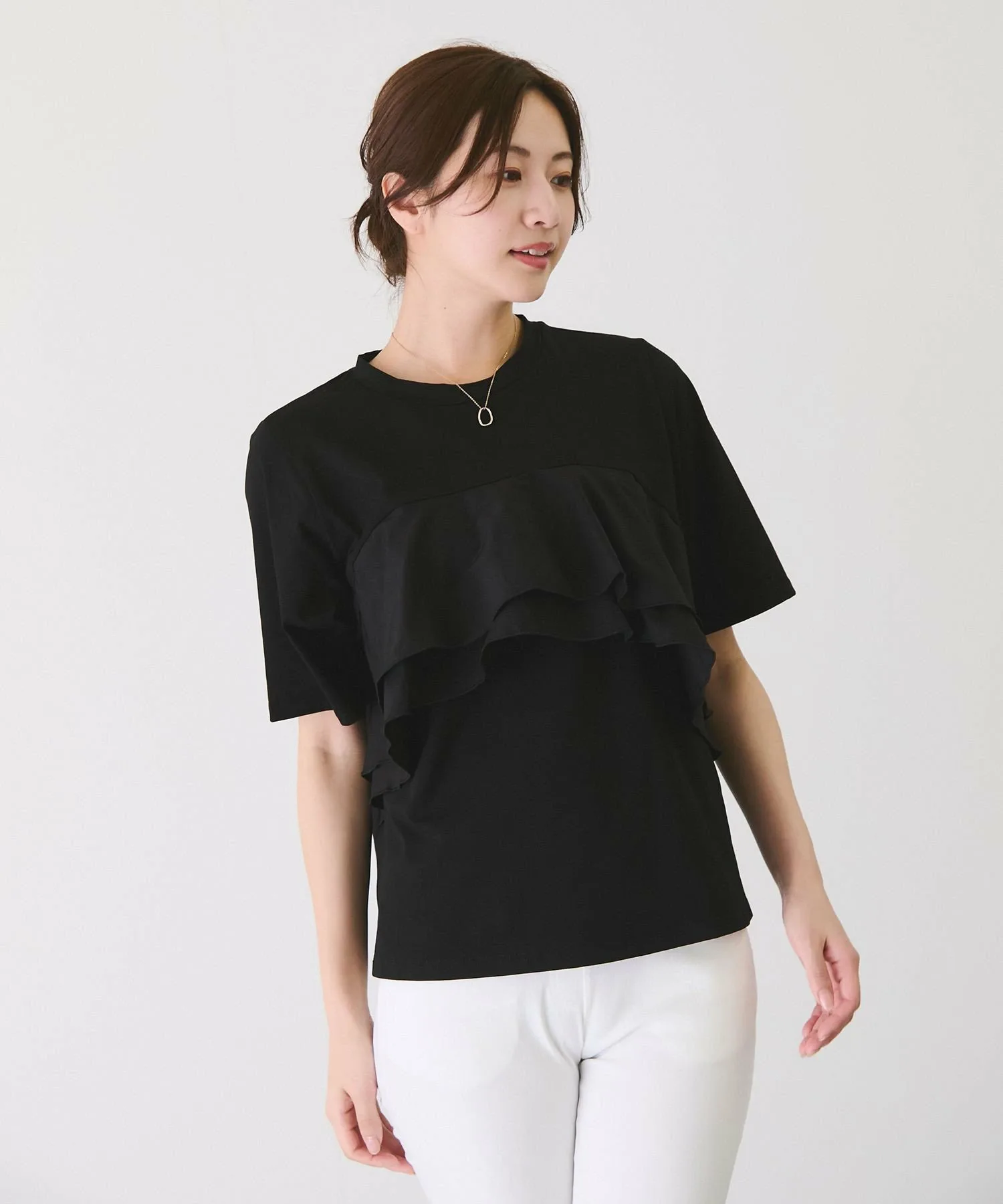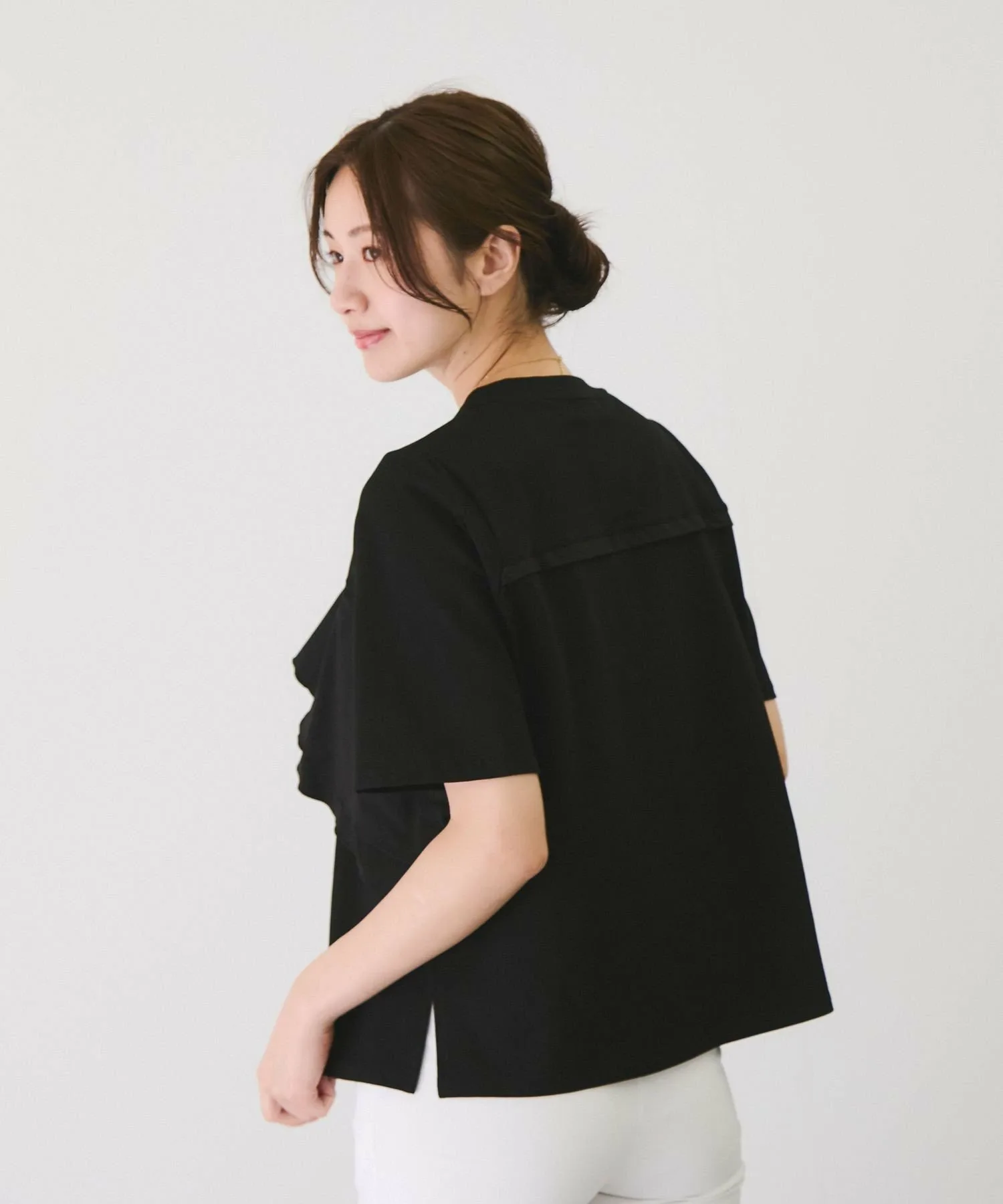 Эта футболка сшита из хлопка и украшена пышными оборками на груди.