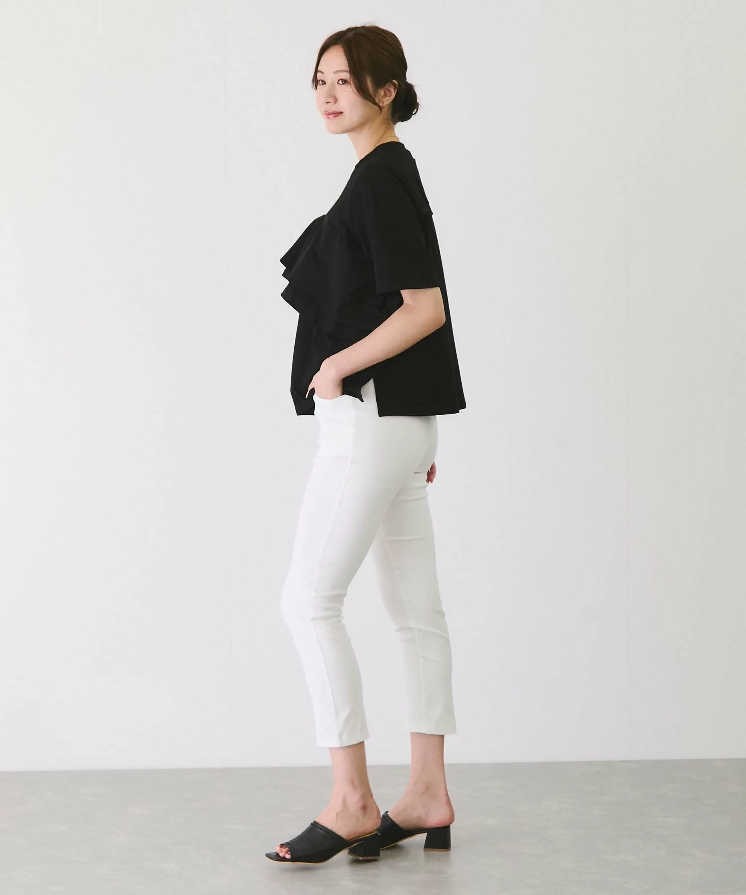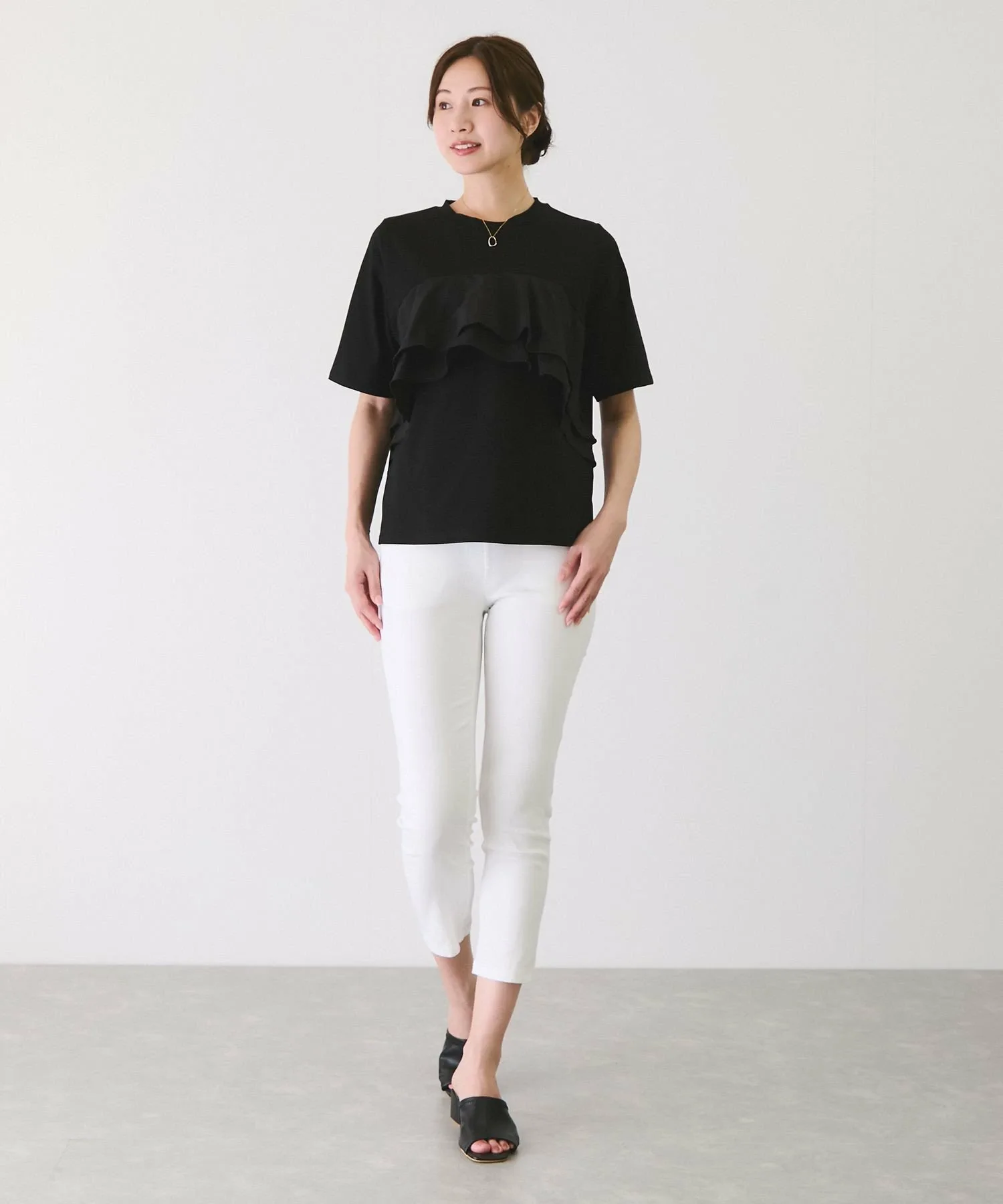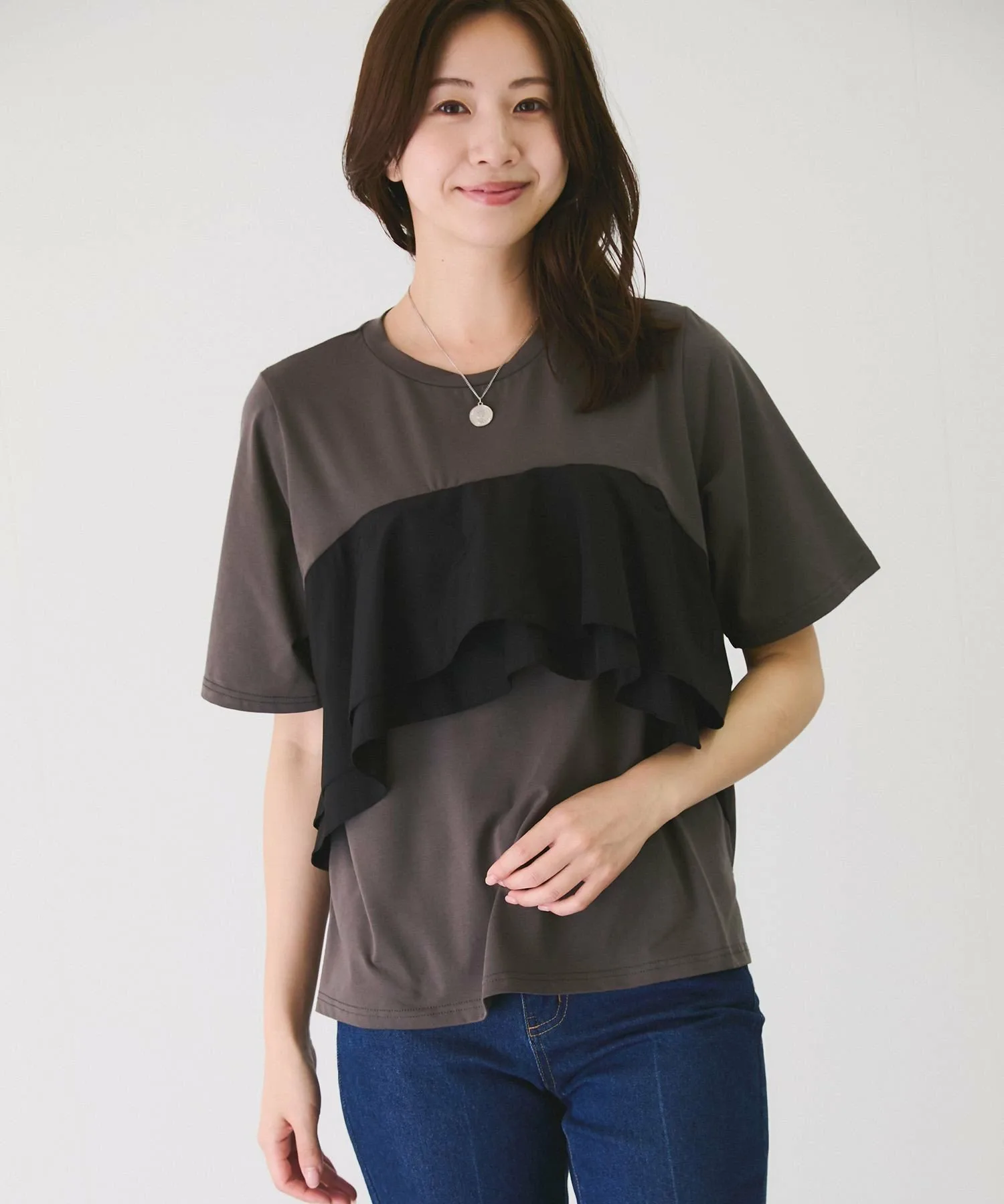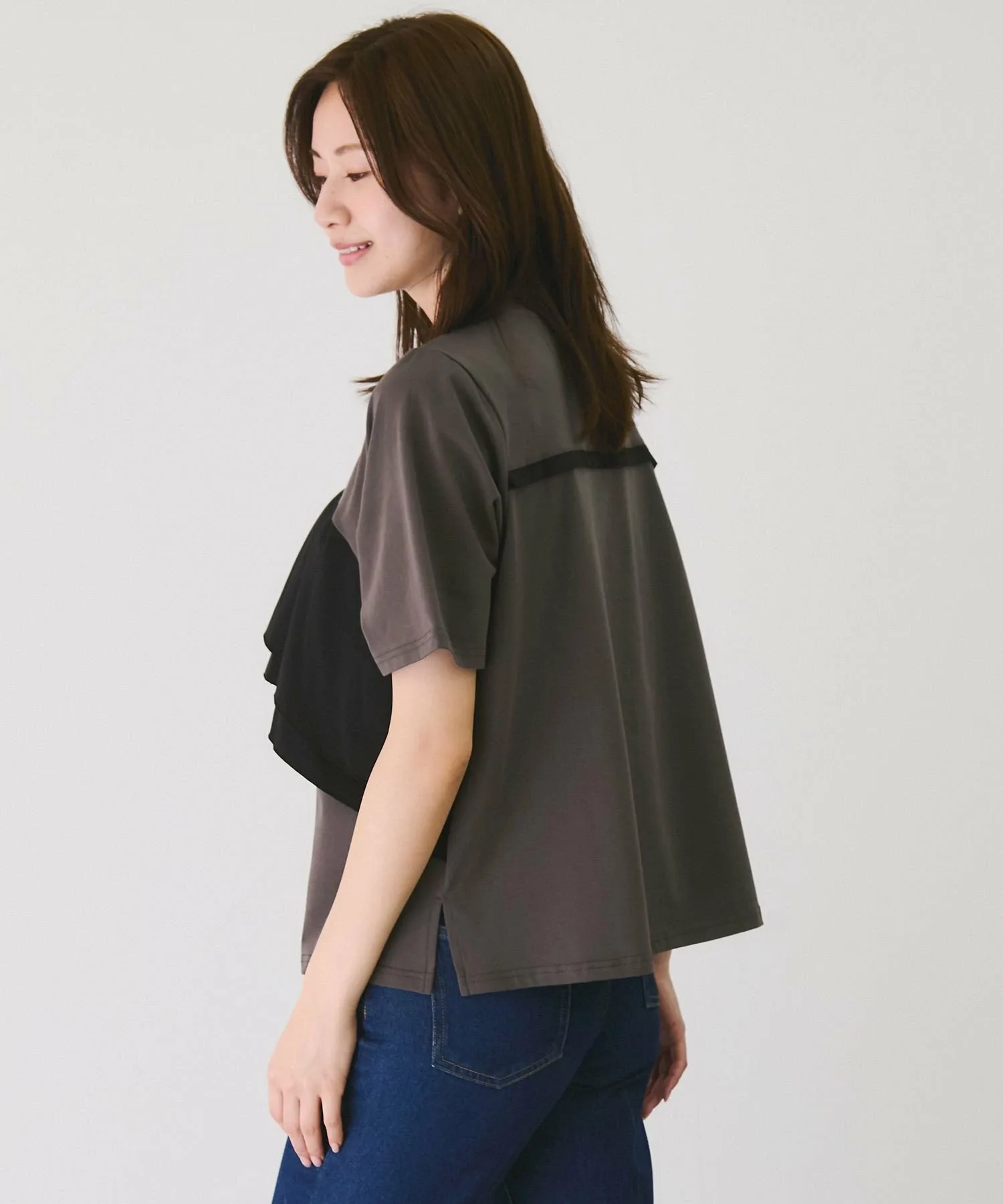 Эта футболка сшита из хлопка и украшена пышными оборками на груди.