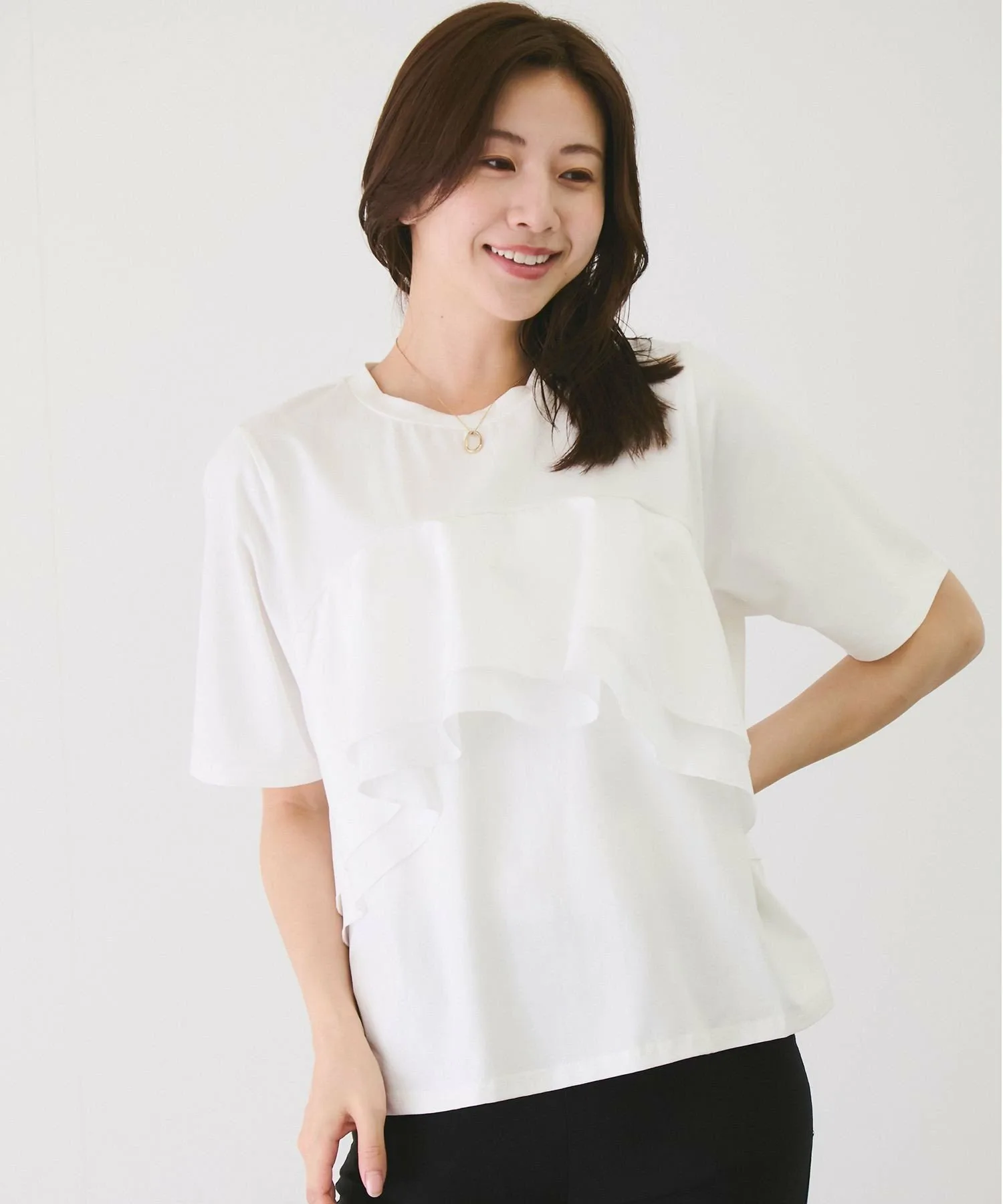 Эта футболка сшита из хлопка и украшена пышными оборками на груди.